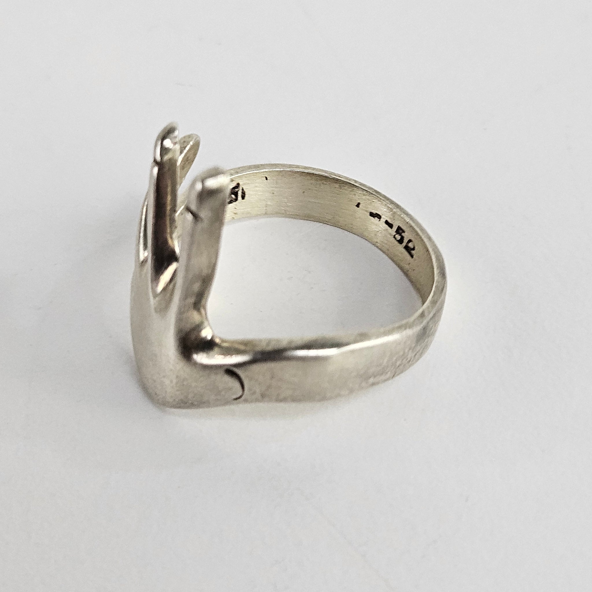 Sterling silver hand shaped ring, made in Mexico and stamped .925 and with a number that looks like a Taxco number. In very good vintage condition.