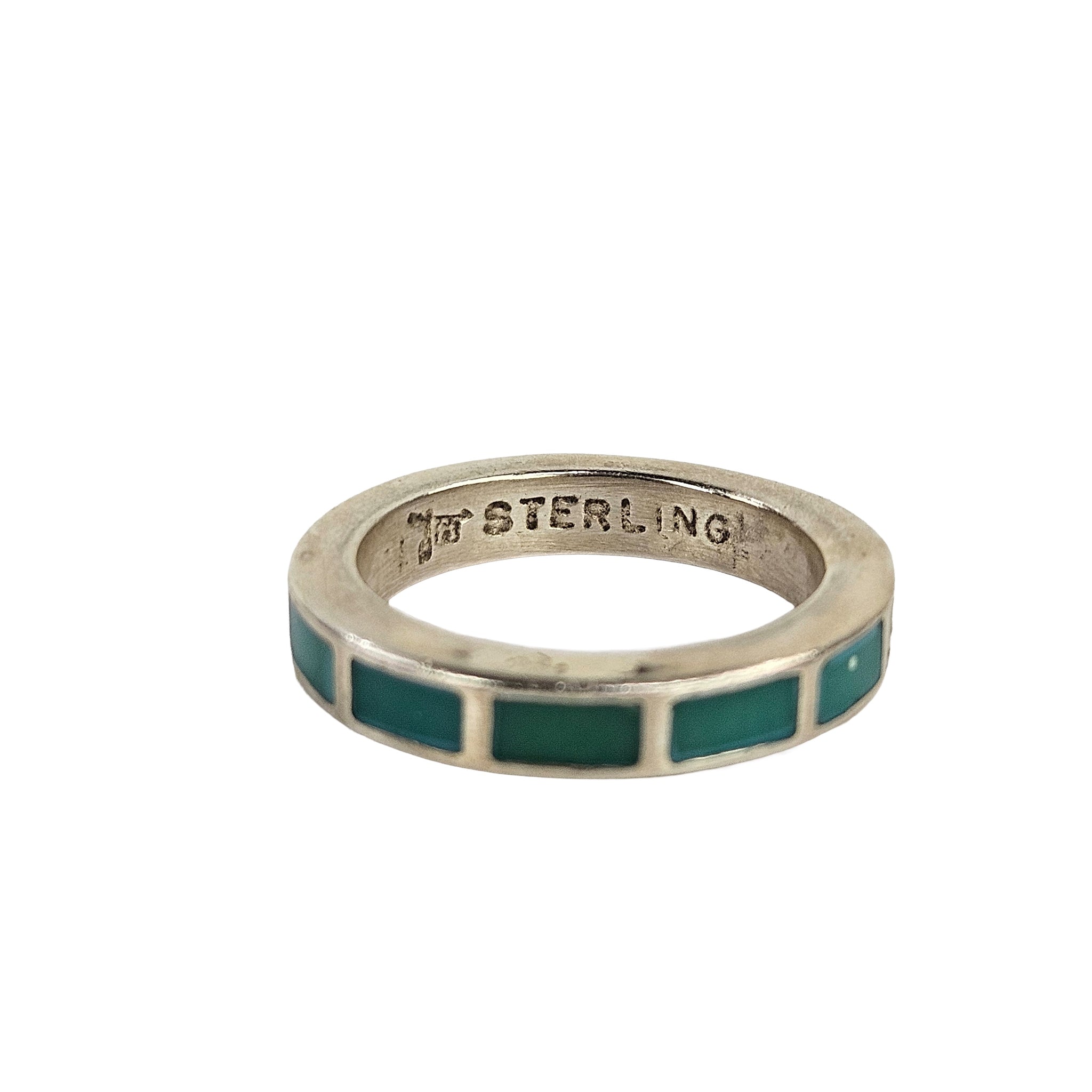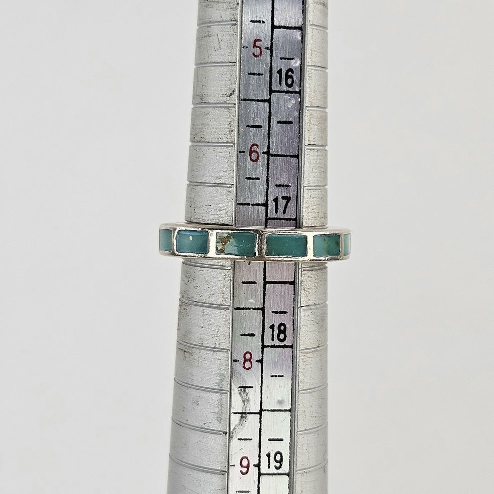 Minimalist sterling silver ring with turquoise stones all around, sunk into the surface for a smooth face. In excellent vintage condition and recently polished. Looks Zuni Native American.