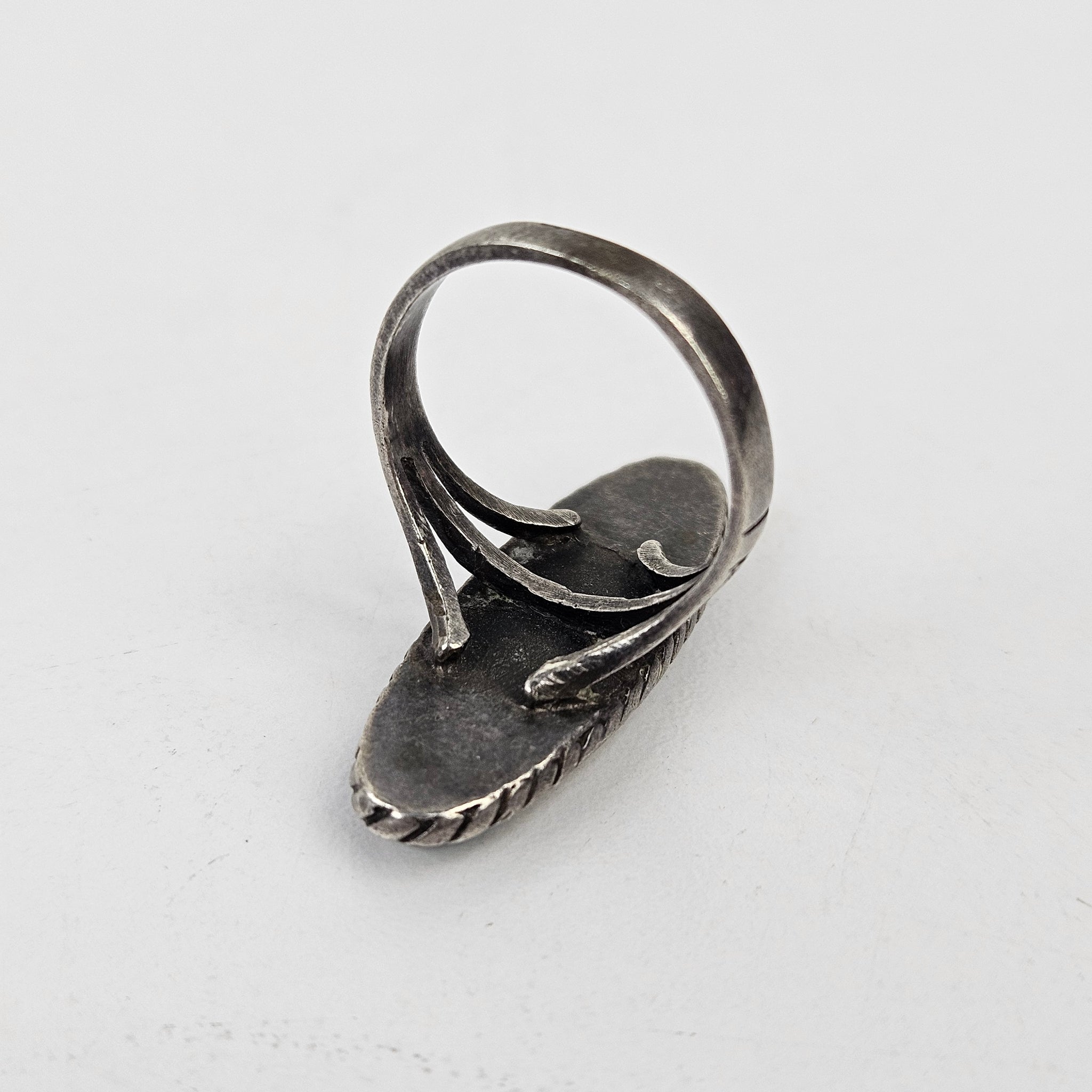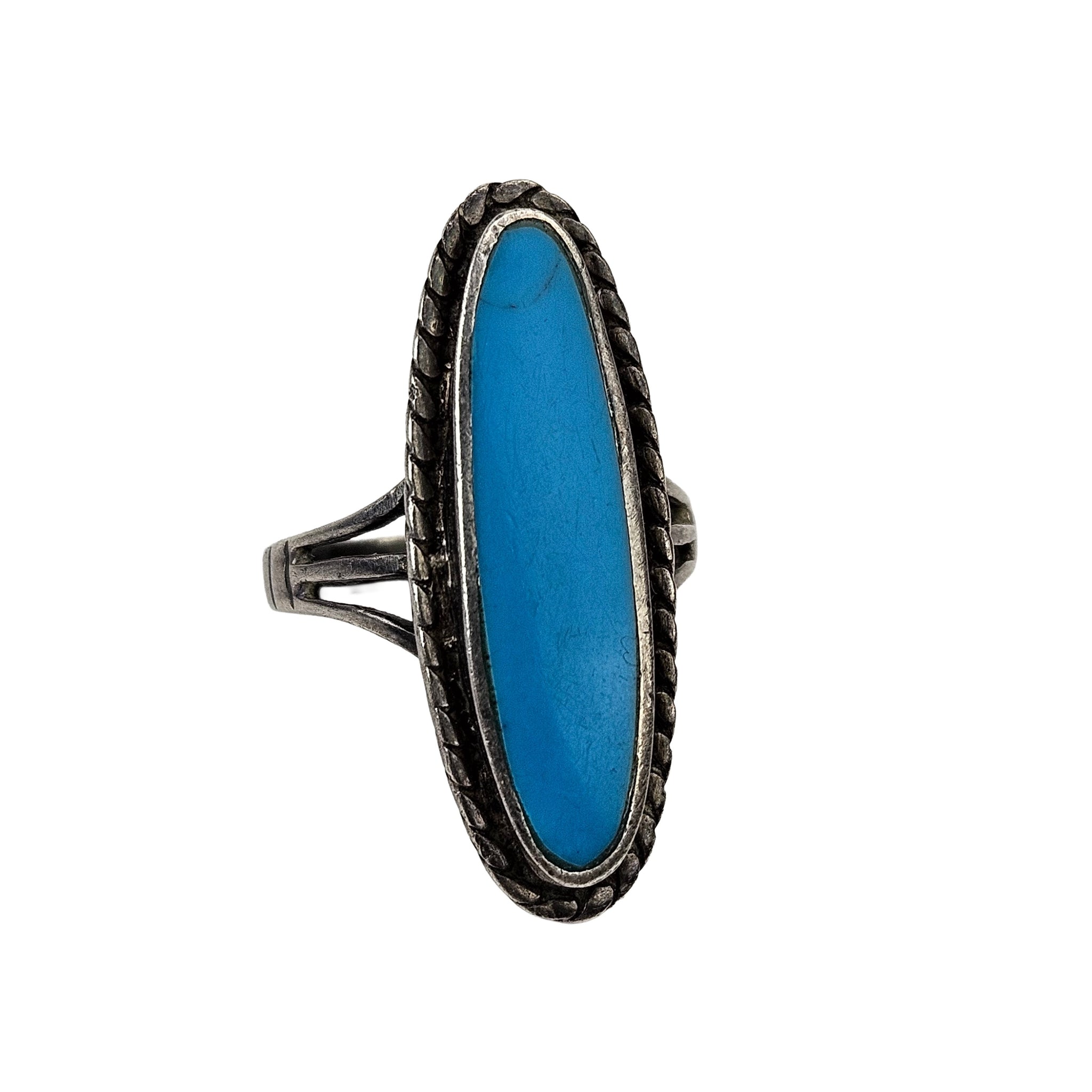 This long turquoise colored stone ring is made of sterling silver with a simple rope design around the cabochon. Stamped 925 and in good vintage condition.