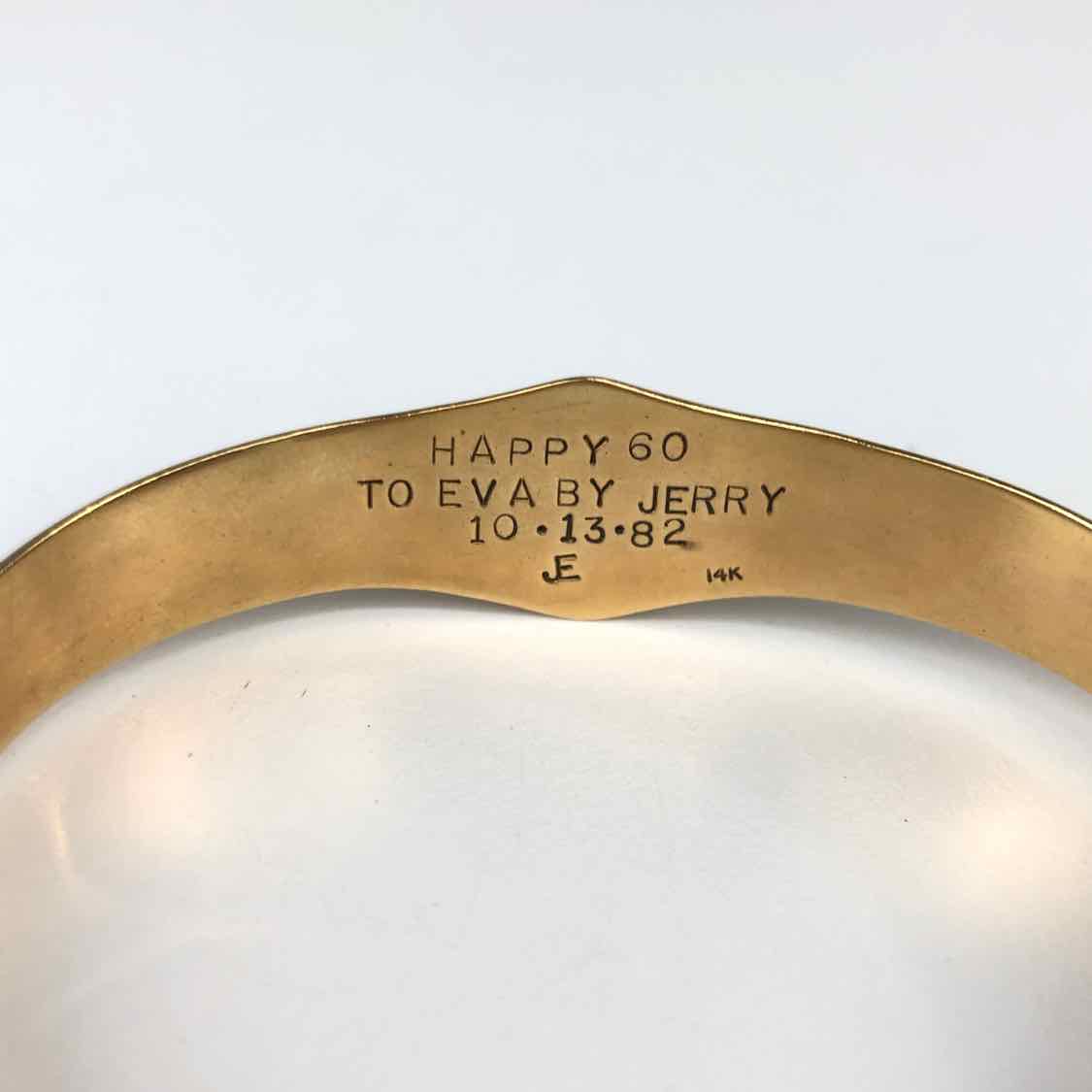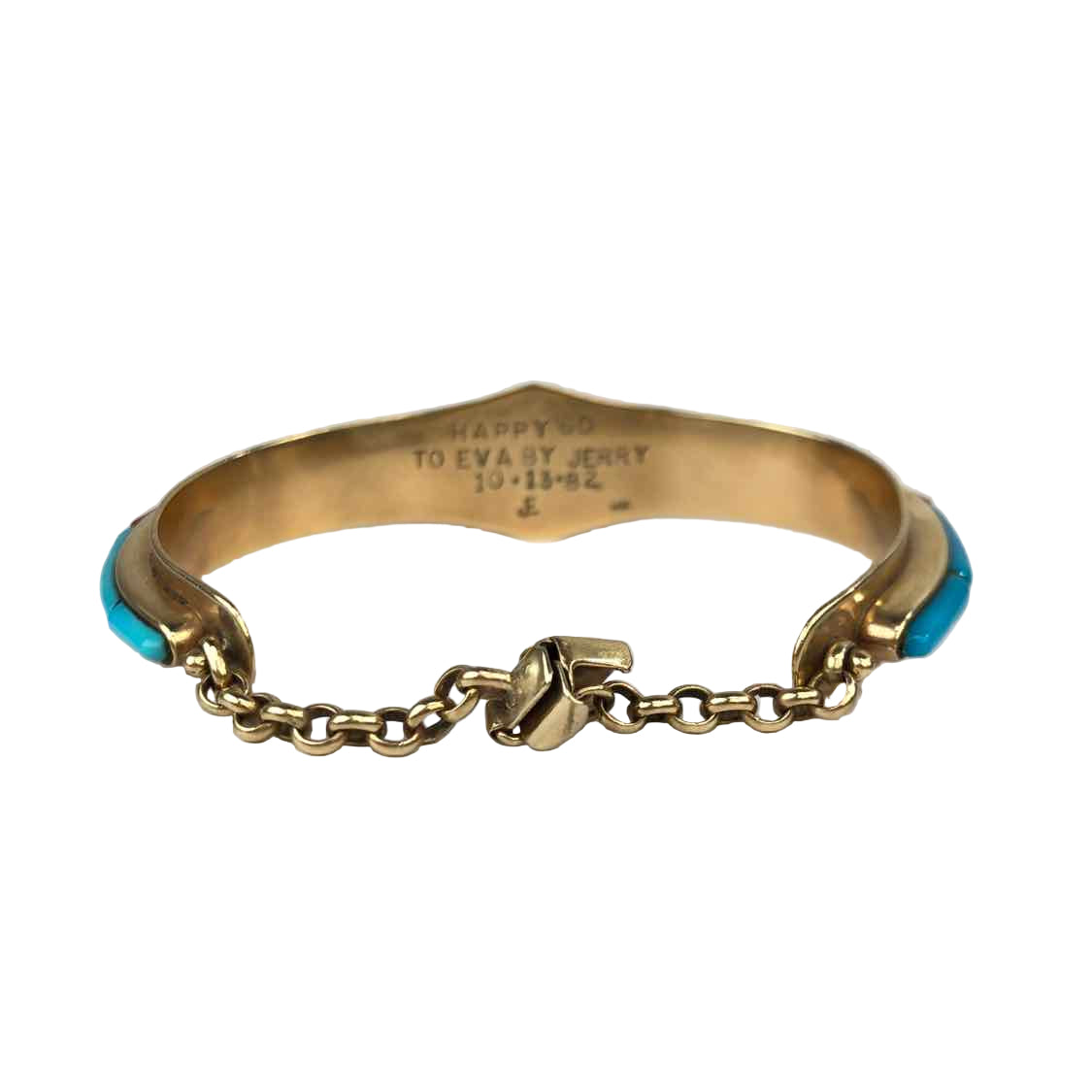 Gorgeous vintage 14K gold bracelet with turquoise and coral stones, a safety clasp and a stamped inscription inside from the Midland, Texas artist who made it. It says Happy 60 to Eva by Jerry, 10-13-82. In excellent vintage condition. Wrist size: 6.5".