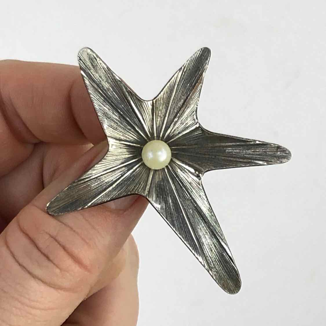 Modern 1960s starburst flower brooch with a pearl in the center and nice striated texture, in very good vintage condition with light patina. Stamped Beau Sterling on the back.
