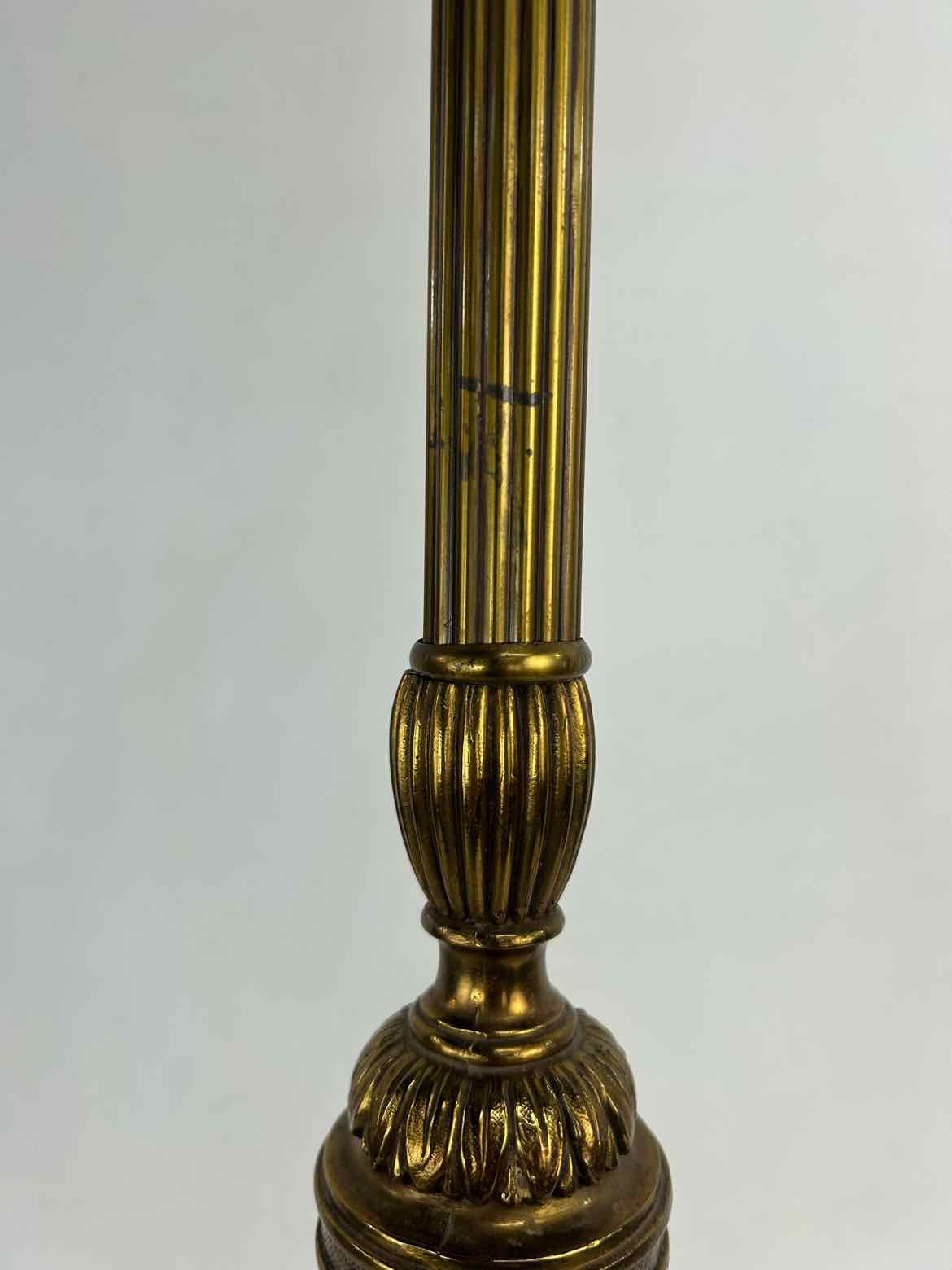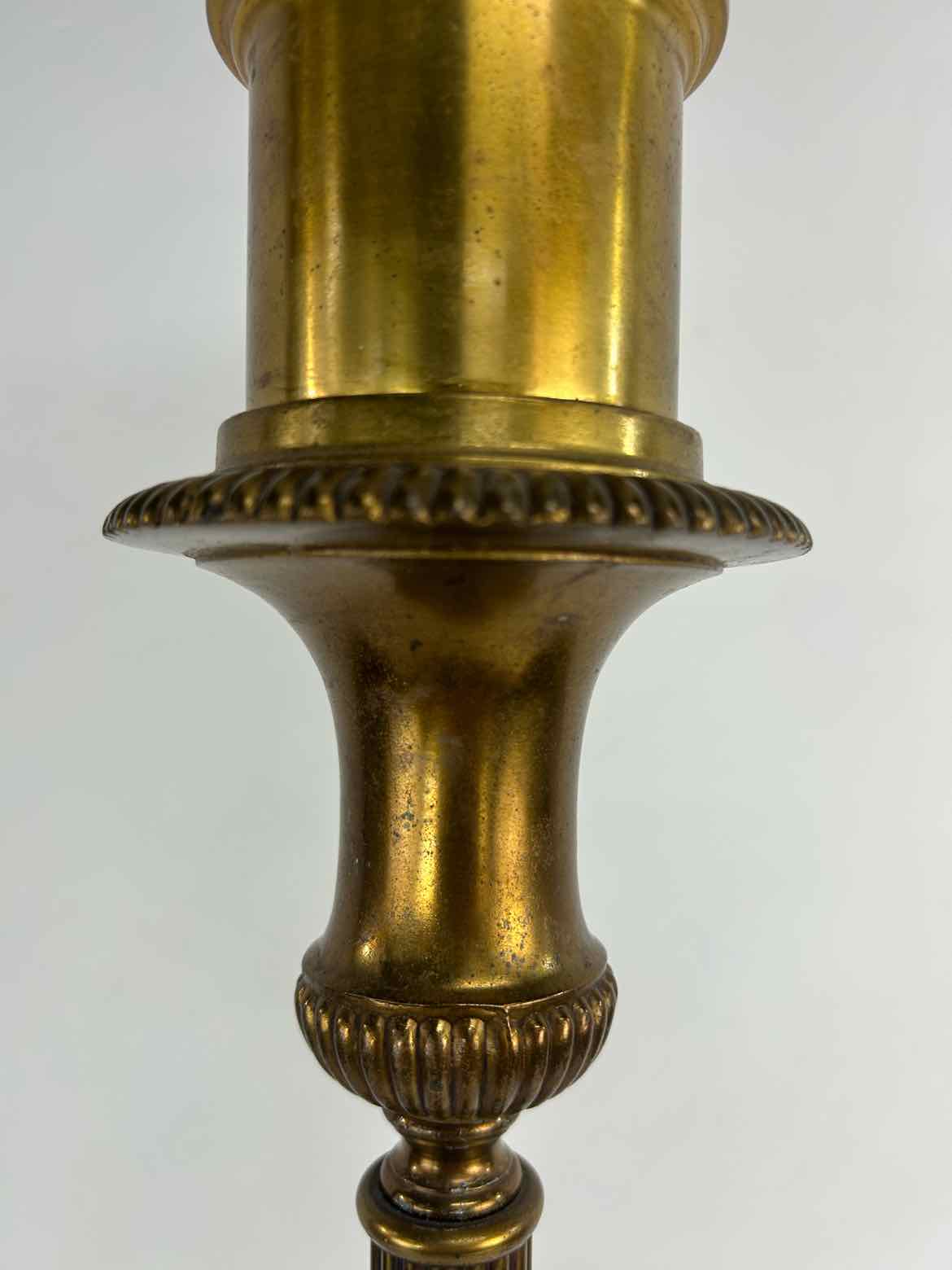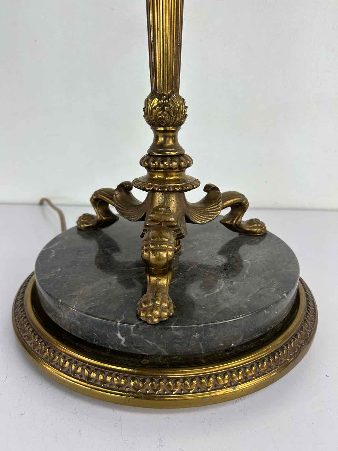 Tall brass & marble lamp with a heavy base and brass footed details, updated wiring and in excellent vintage condition aside from missing a fabric shade. It uses a large mogul bulb, and has a milk glass bowl shade that can hold a fabric shade.
