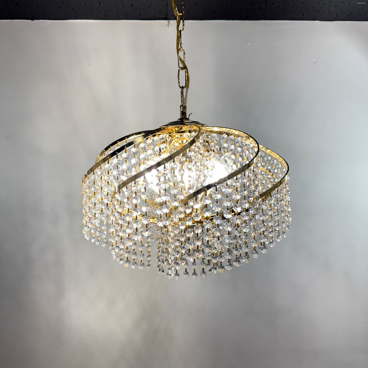 Modern bright gold and crystal chandelier with a swirling design, in very good vintage condition with a few missing crystals. Will need a mounting bracket for the ceiling. Designed to hardwire into a ceiling, with chain for adjustable height.