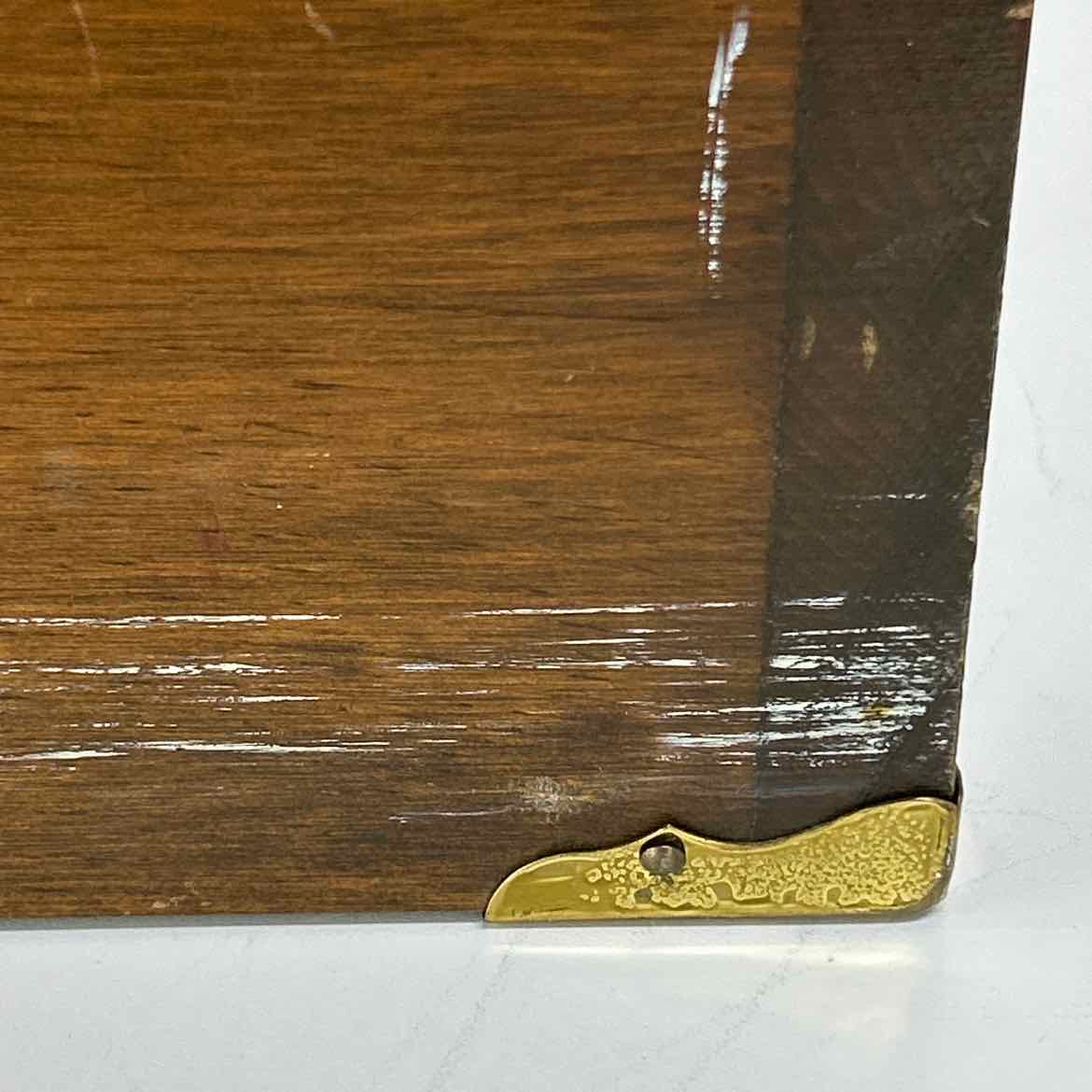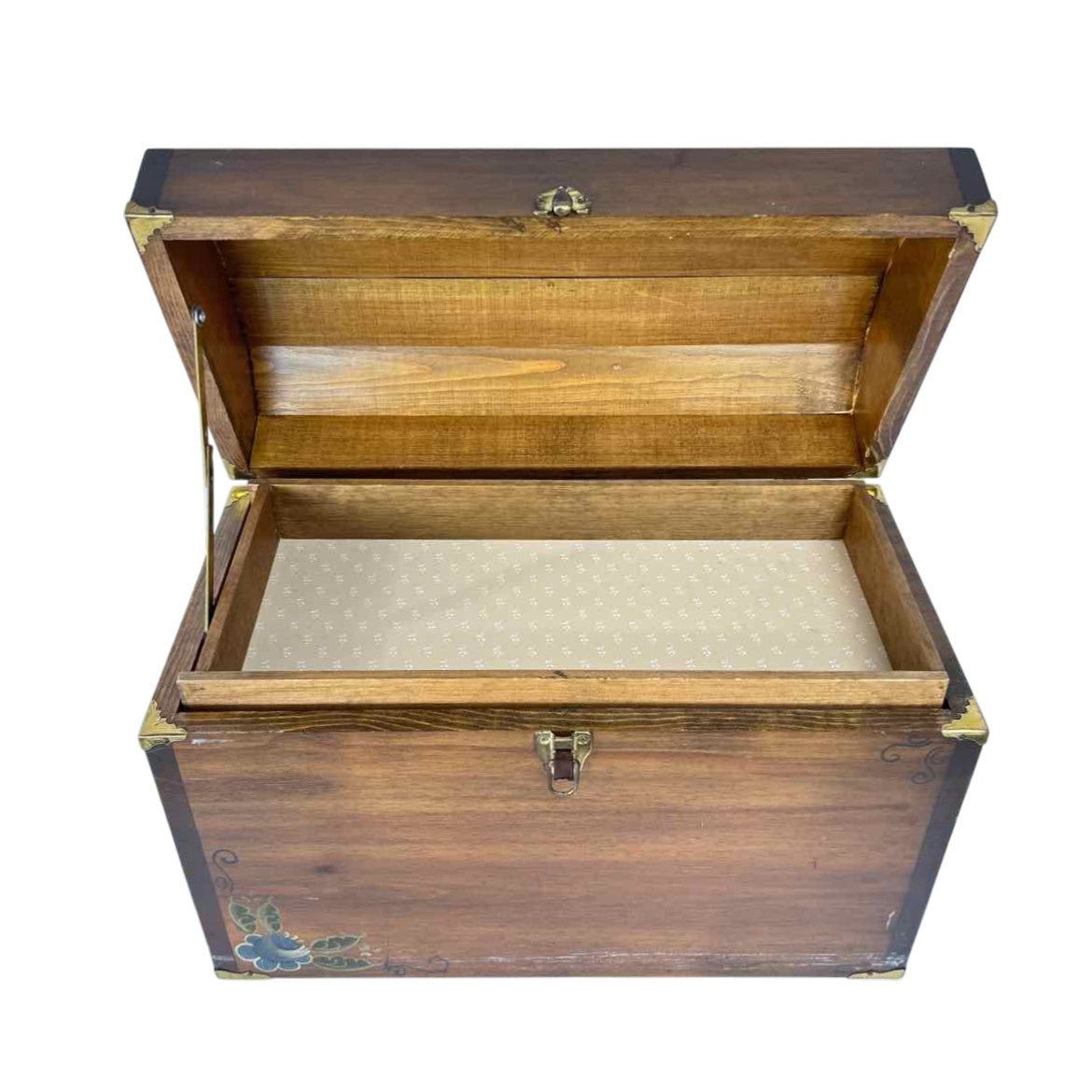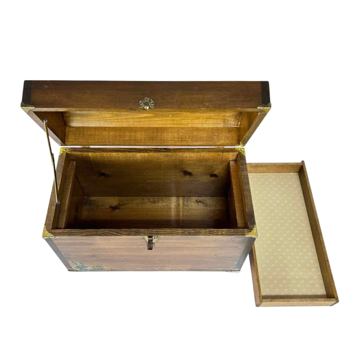 Wooden humpback storage trunk with blue hand painted folk art floral details, in good vintage condition with some wear from age, a removable interior tray, and brass accents on the corners. | The sale of this item benefits Meals on Wheels in Midland, Tx.