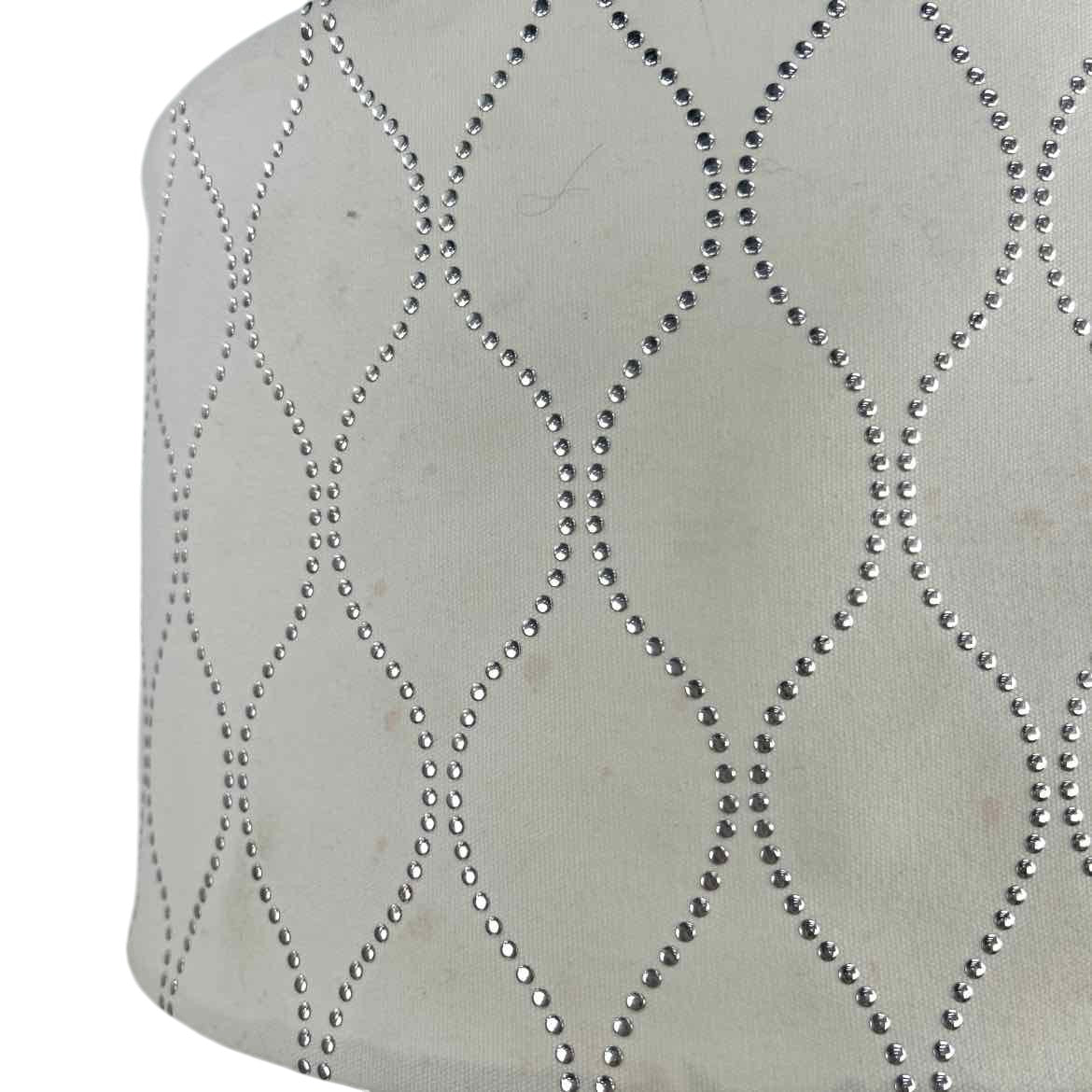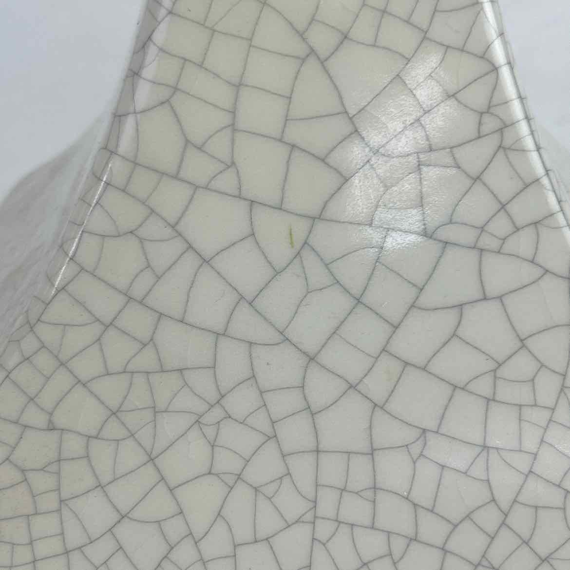 Modern large ivory ceramic pottery lamp with crackle texture and a slightly stained and rumpled shade, in good vintage condition and working well.