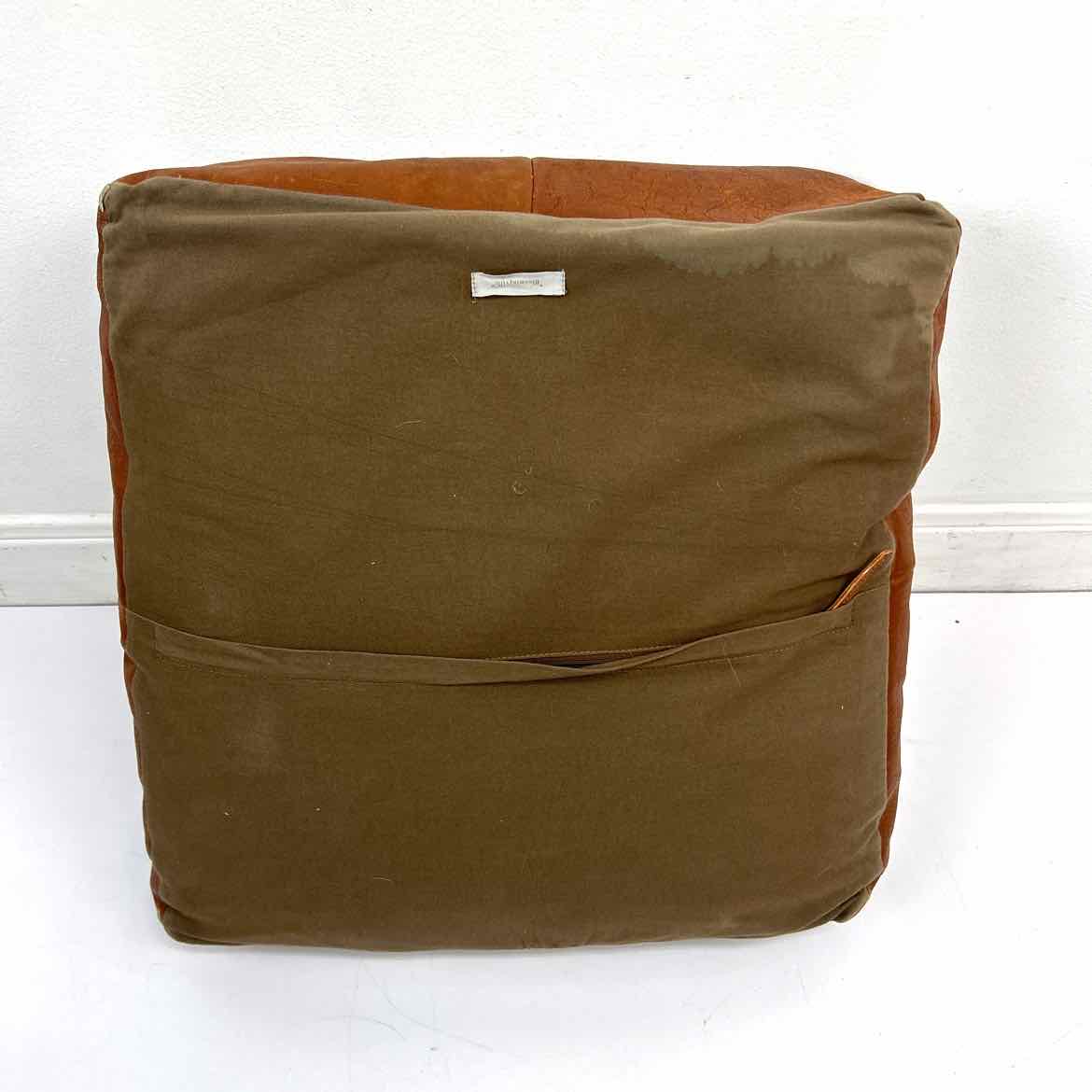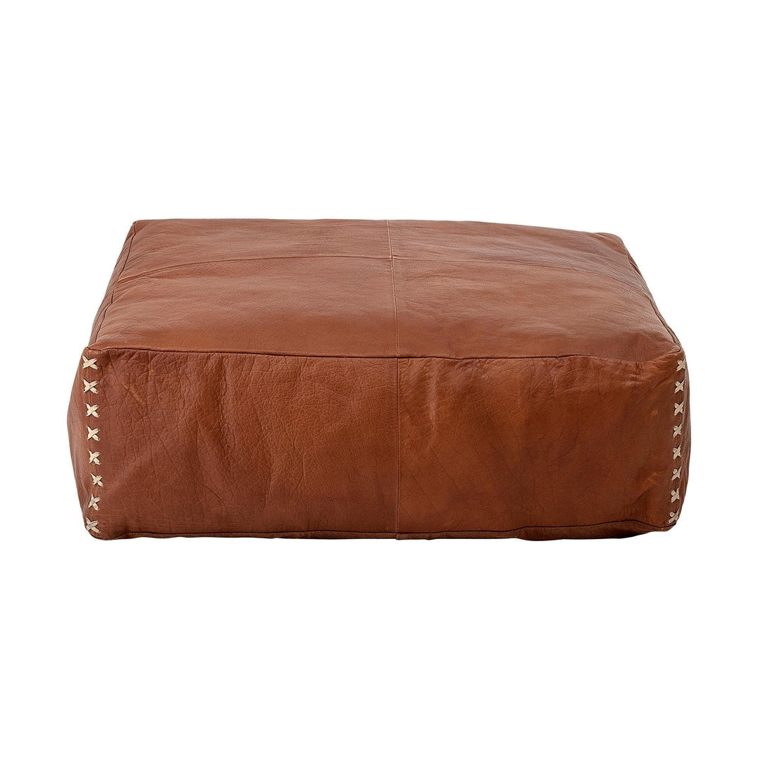 Brown leather pouf made by Bloomingville with contrast stitching on the corners and fabric underside. In very good vintage condition with original tags. Retails for $249. Contact for shipping.