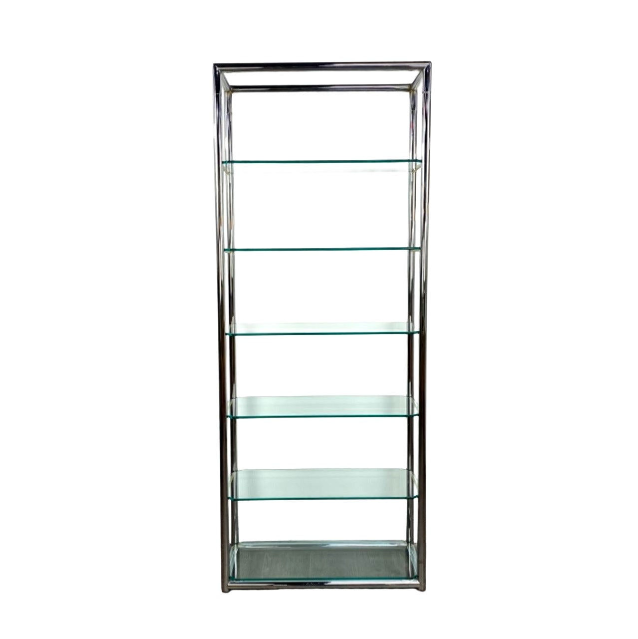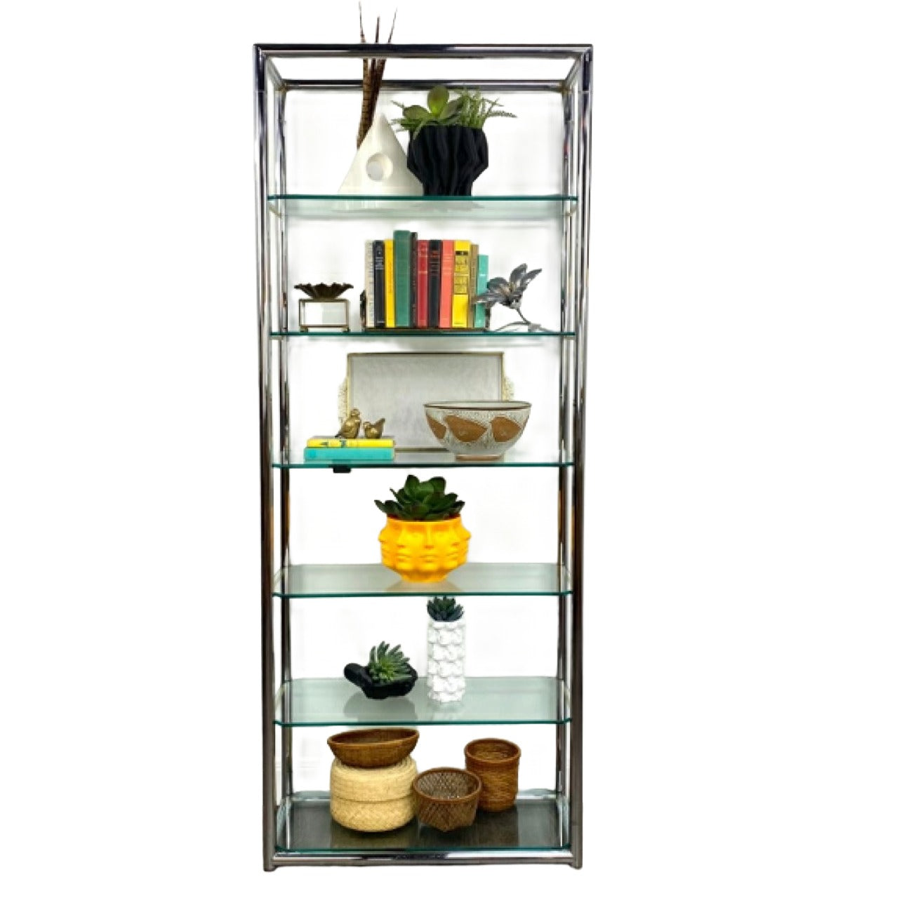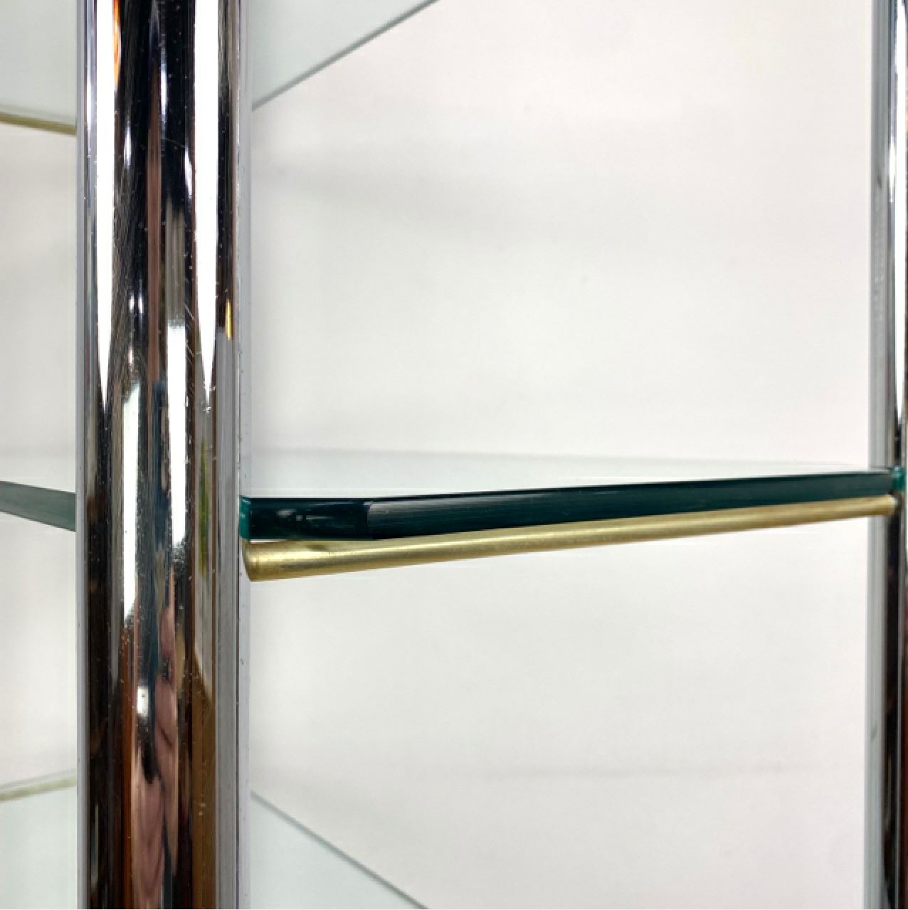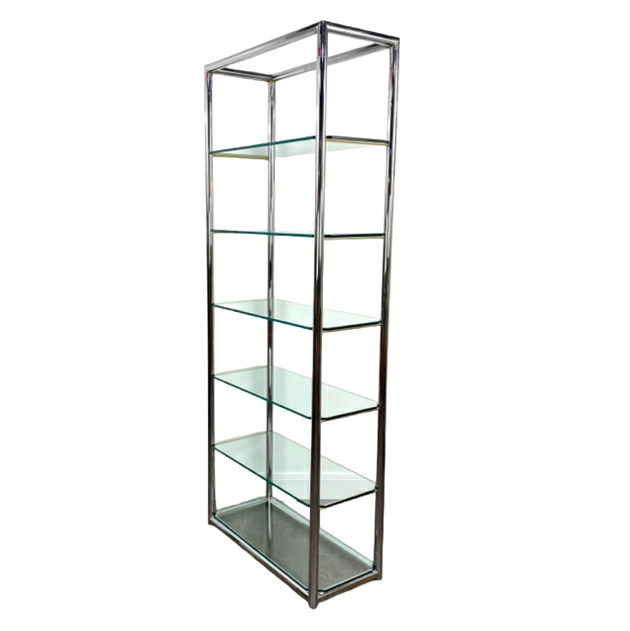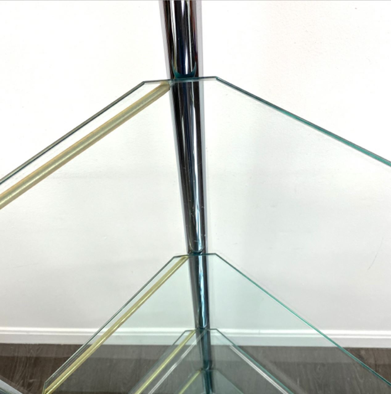 Tall upright chrome and glass shelf in the style of Milo Baughman, in very good vintage condition with a little wear to the chrome that could probably be polished off.