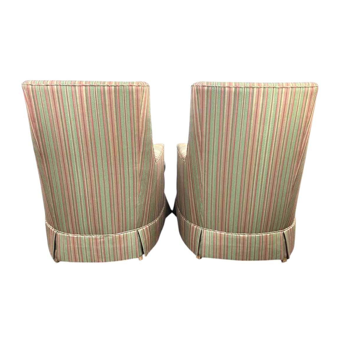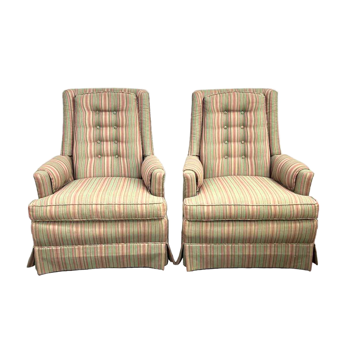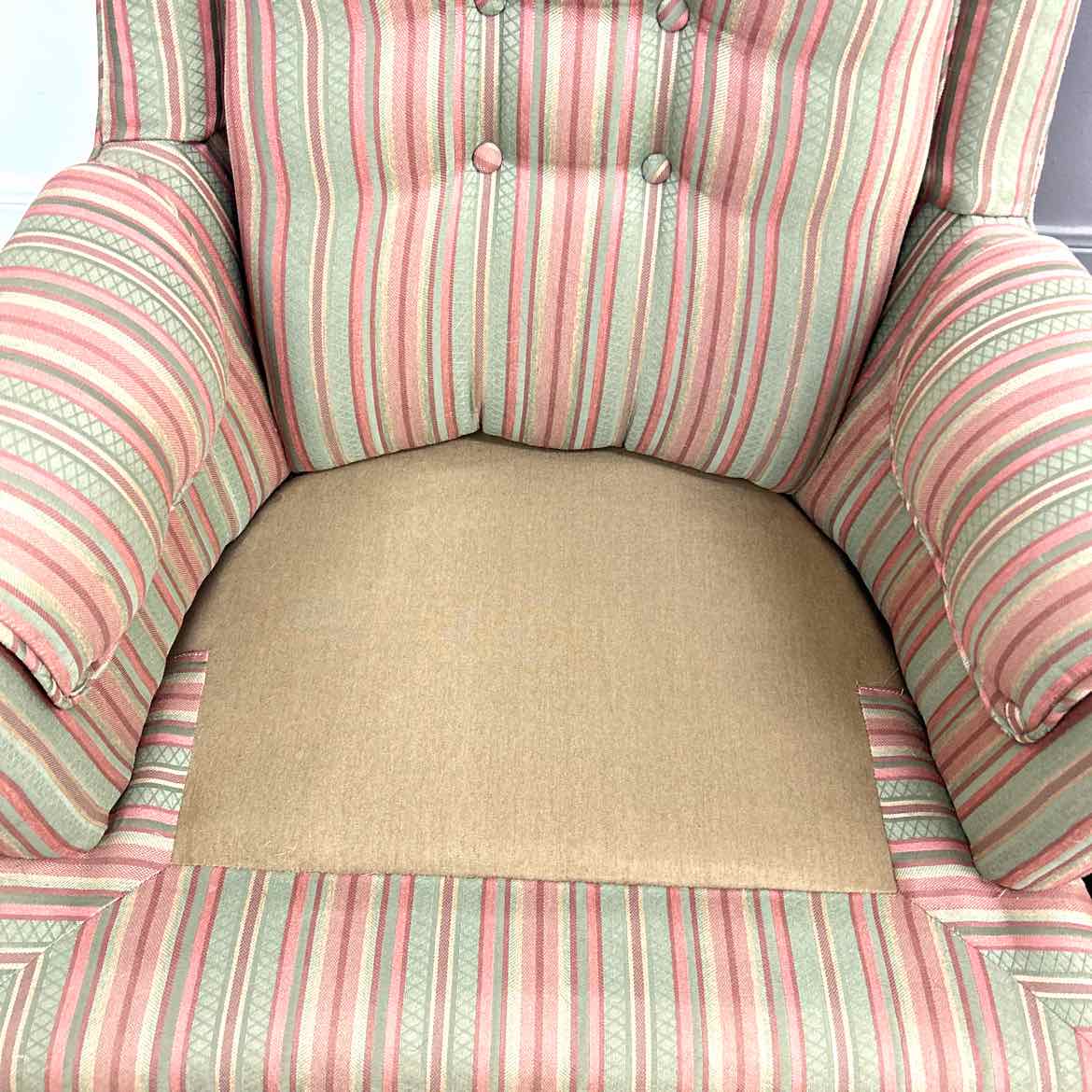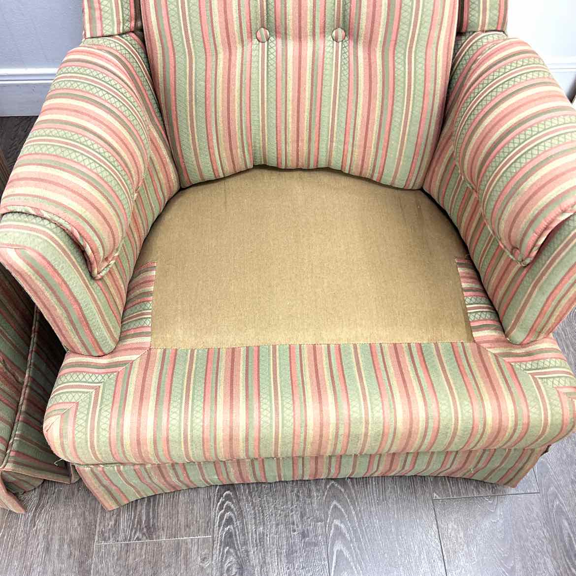 PAIR high back 1960s armchairs with muted green and pink-red striped upholstery that almost reads as brown from a distance. In overall good vintage condition and sturdy, with some small snags and light wear from age. Super sturdy for reupholstery.