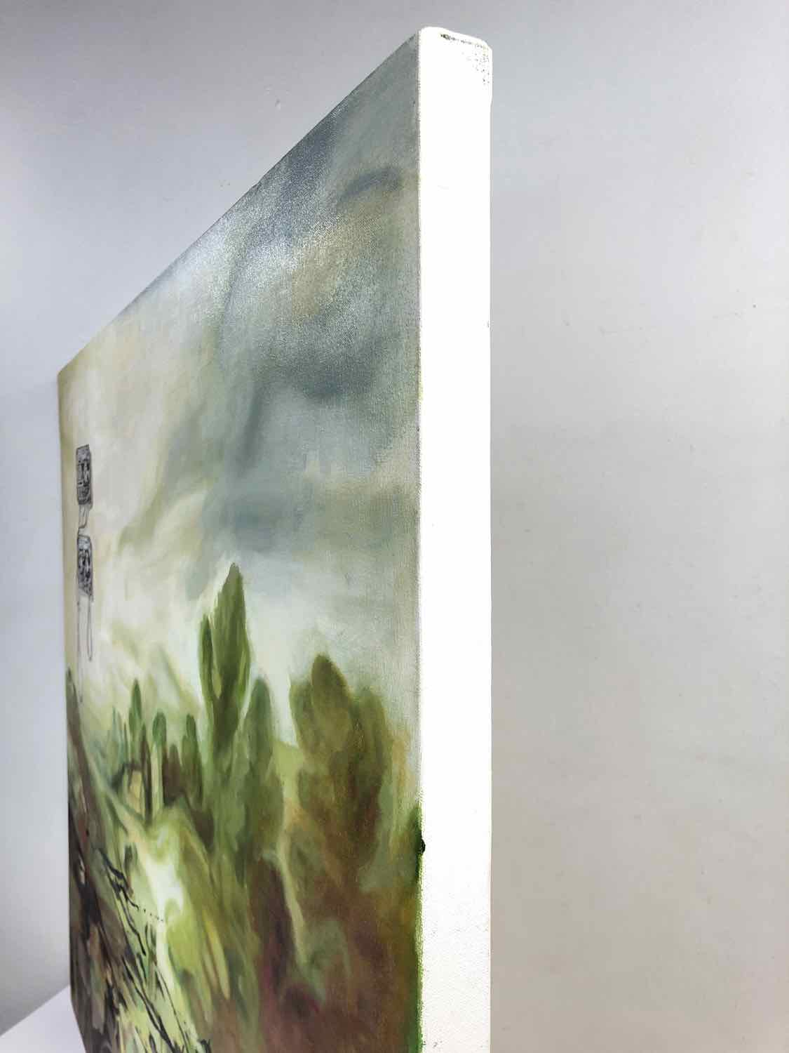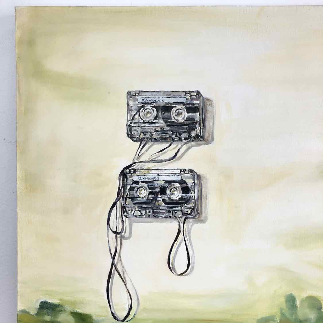 Vintage original painting of a landscape with Ramones tapes and layered imagery, painted on canvas. Painted by Midland, Texas artist Michael Hubbard, unframed but with a wire installed on the back for hanging. Contact for accurate shipping quote.