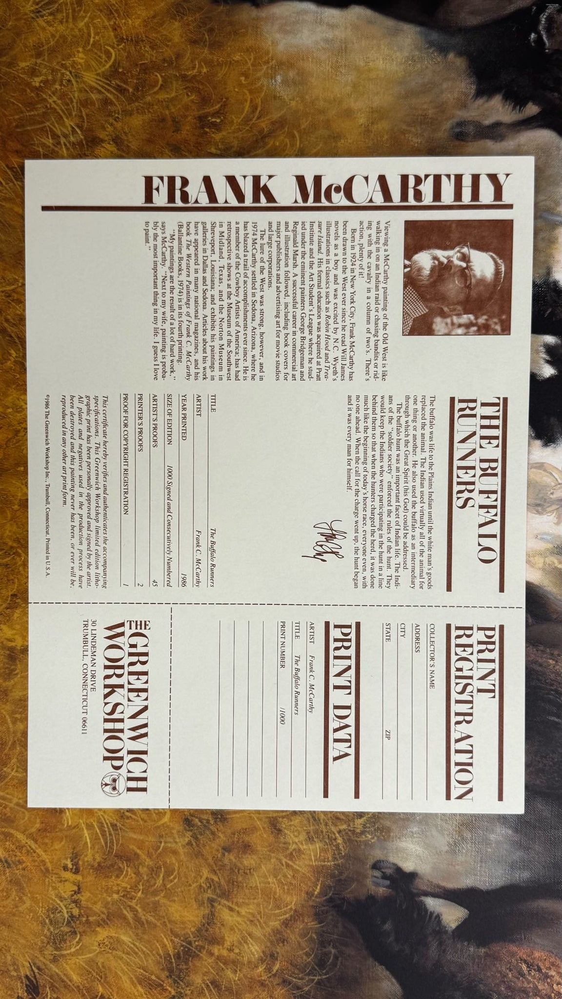 Buffalo Runners limited edition (only 275 available) signed & numbered print by artist Frank McCarthy. Has a collectible low edition number #13/1000 Printed in 1986 by The Greenwich Workshop in original folio with Certificate of Authenticity. Artwork size: 16.5"x 33" | The sale of this item benefits Fix West Texas in Midland, Texas.