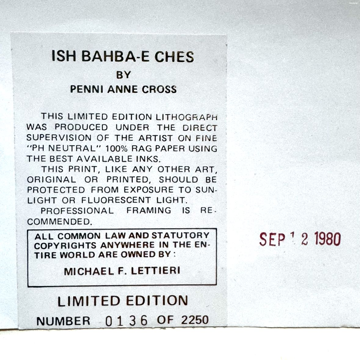 Ish Bahba-e Ches limited edition signed & numbered print by artist Penni Anne Cross. Has a collectible low edition number #136/2250 Printed in 1979 in original folio with Certificate of Authenticity. Artwork size: 22"x 28" | The sale of this item benefits Fix West Texas in Midland, Texas.