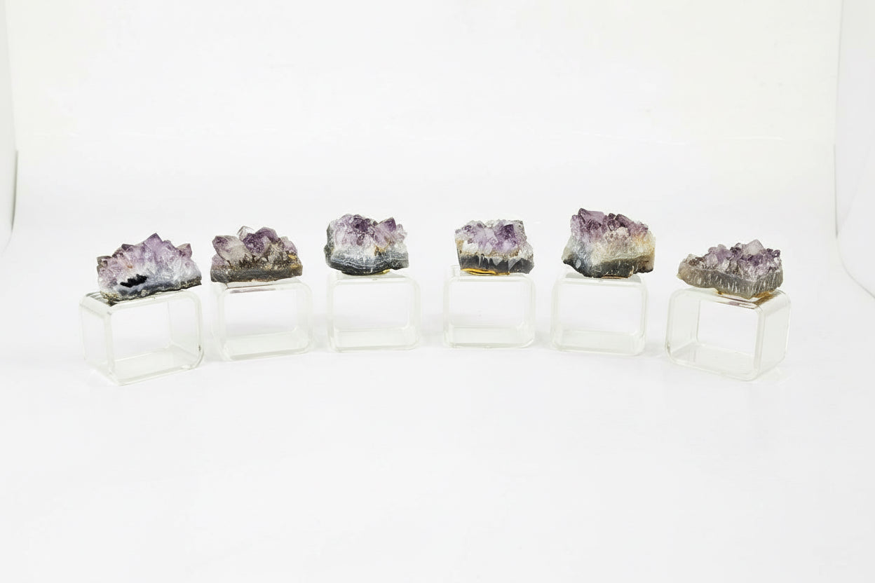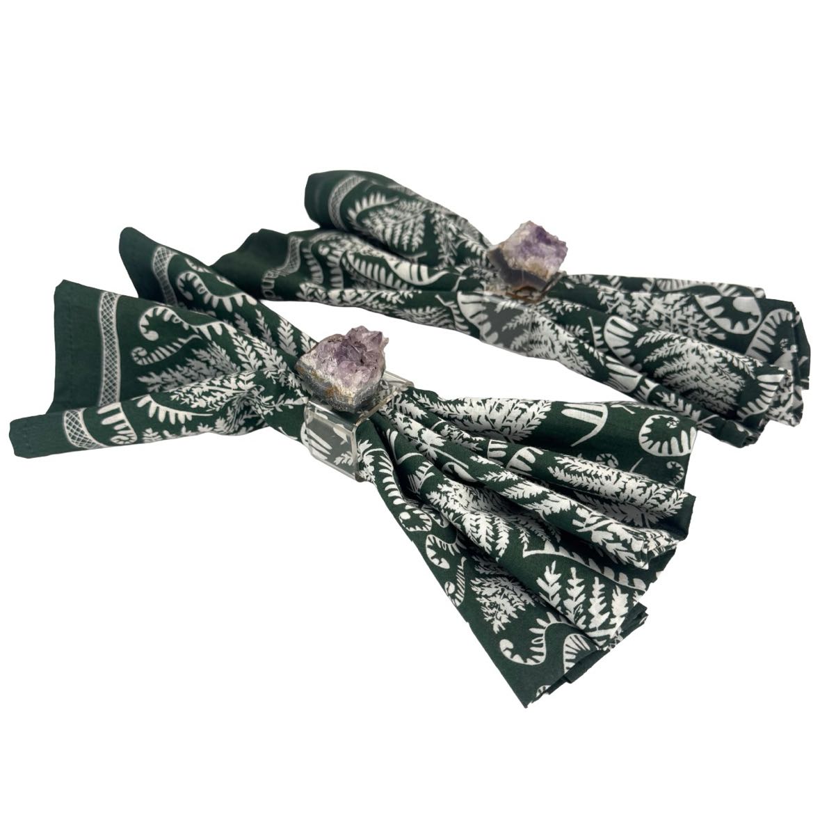 SET/6 modern lucite napkin rings with amethyst quartz crystals attached on the top. In good vintage condition with light wear from age, these would take a table setting to the next level!
