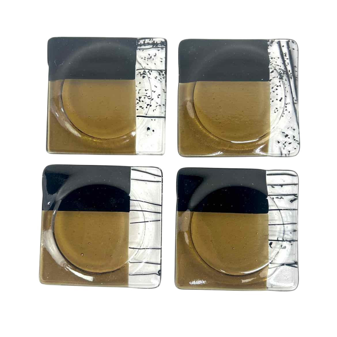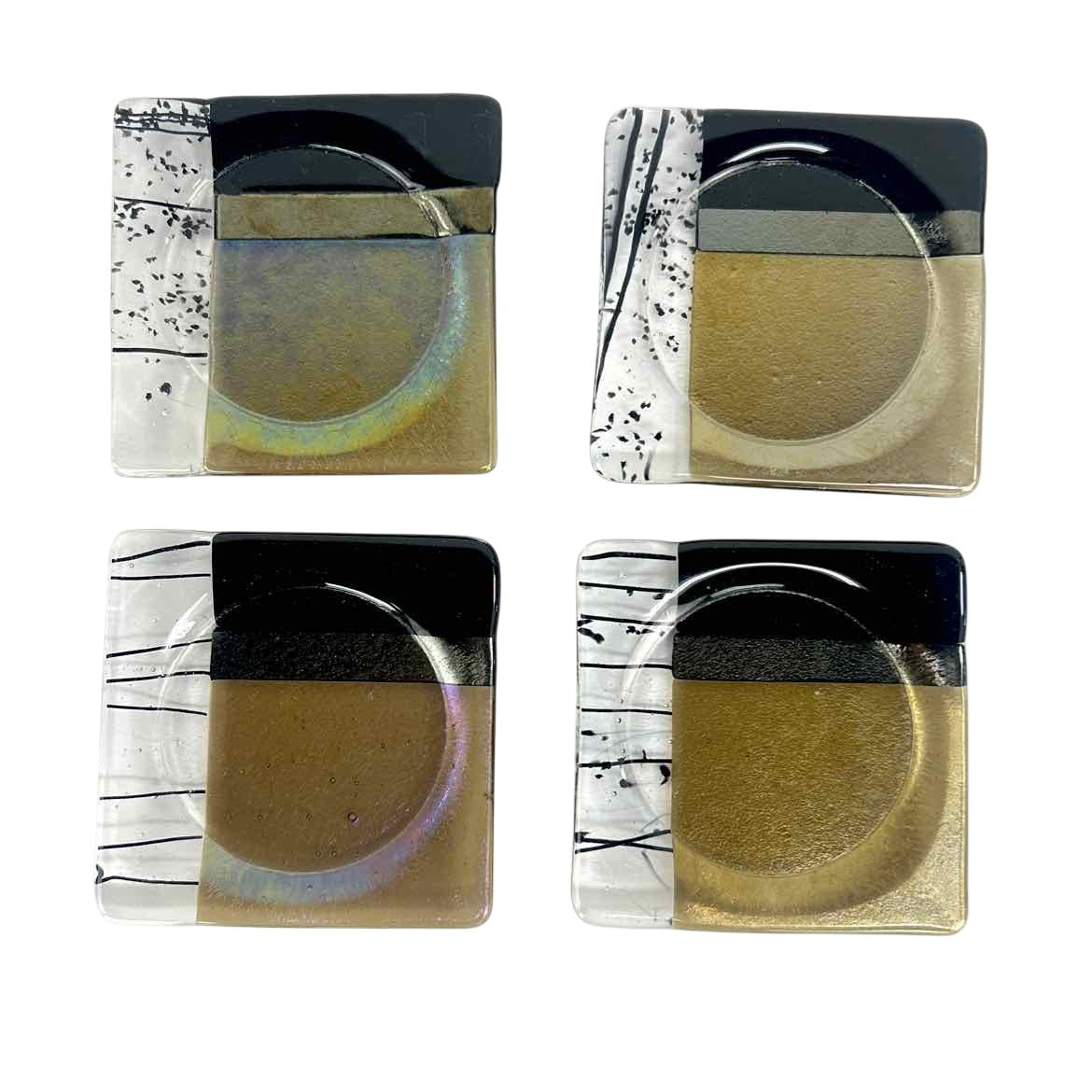SET/4 modern black & gold art glass coasters with gold, silver, black and clear designs. In excellent vintage condition with no chips or cracks