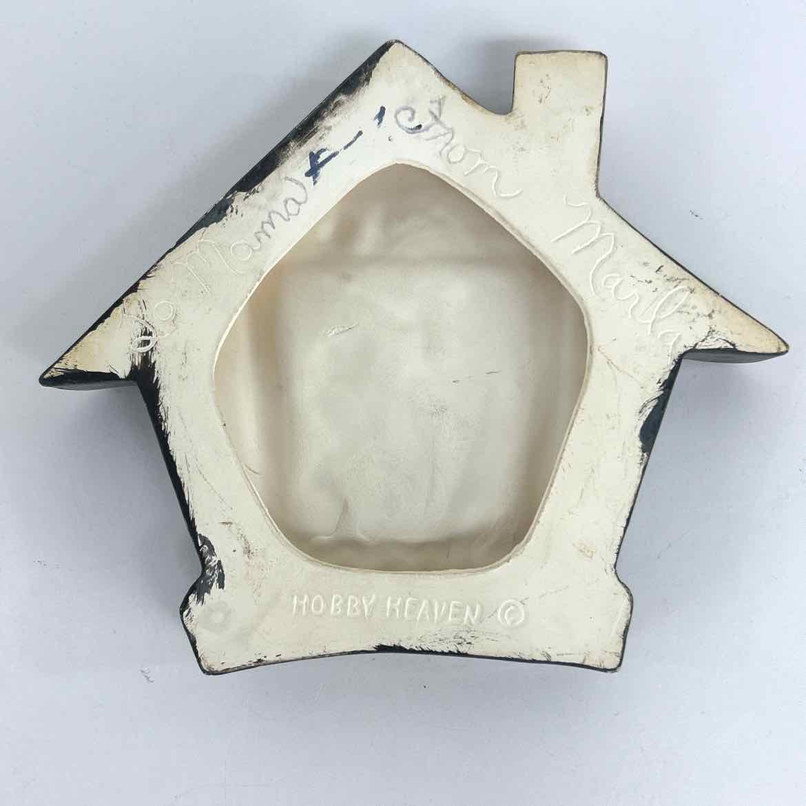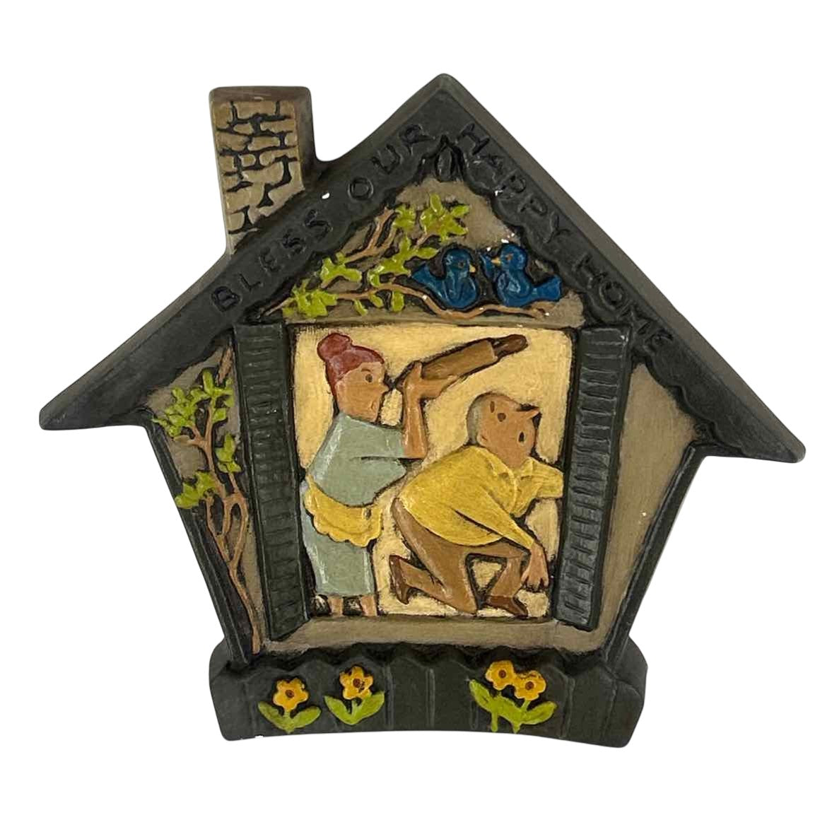 Plaster wall hanging plaque in the shape of a house that says Bless Our Happy Home with a picture that looks like a wife threatening her husband with a rolling pin? Hand painted and labeled Hobby House on the back. Hangs on a rim on the back.