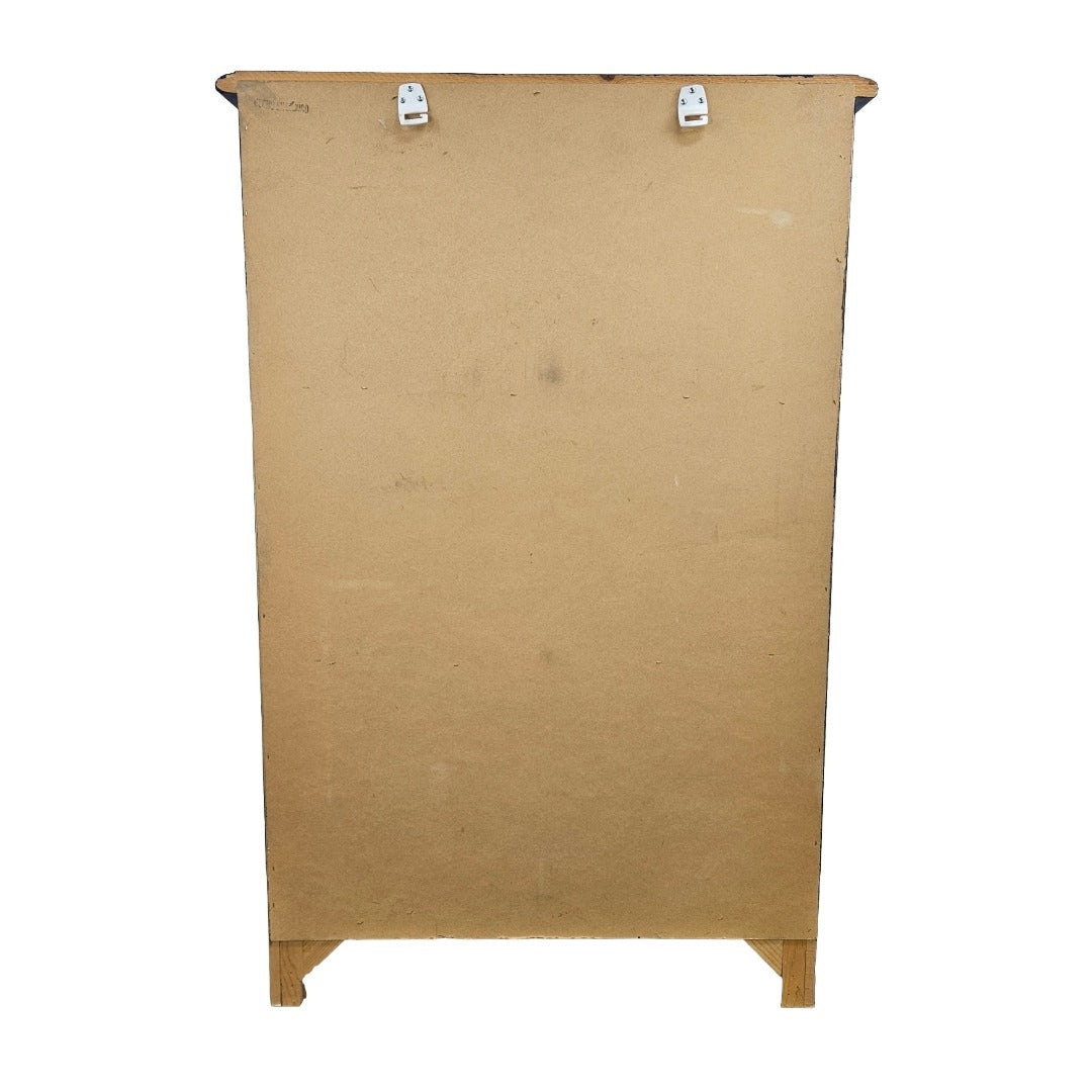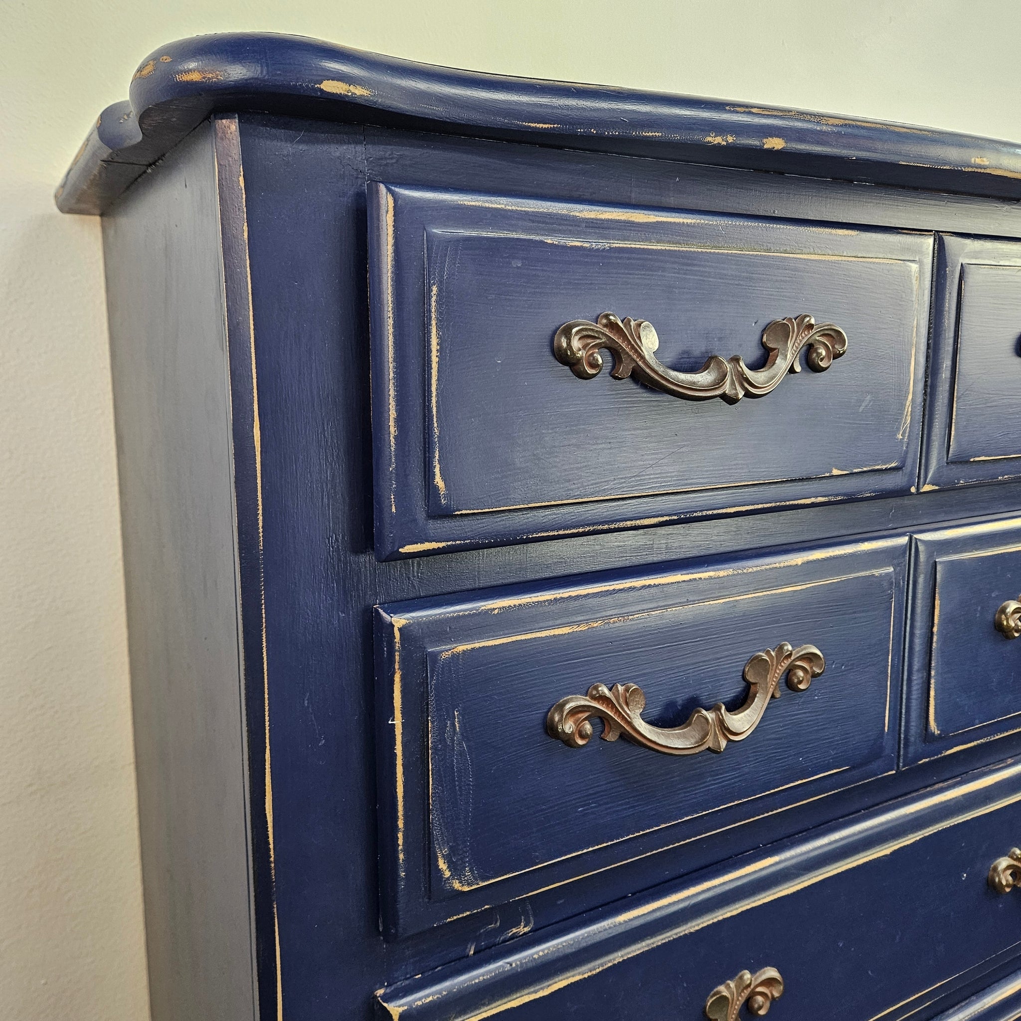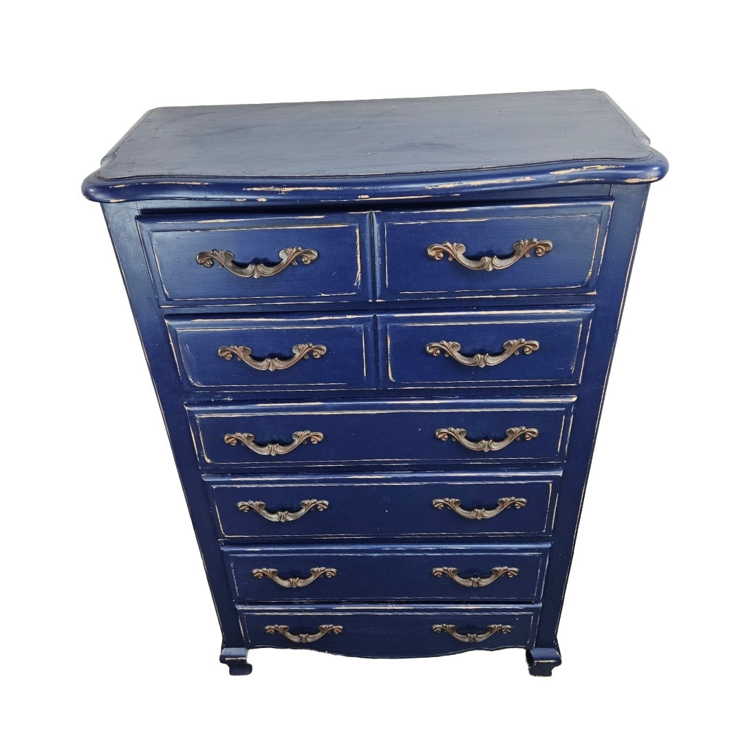 Tall French Provincial style chest of drawers with a distressed painted blue finish, made in Mexico from pine wood and in very good vintage condition with a little surface wear that is hardly noticeable aside the intentional distressing.