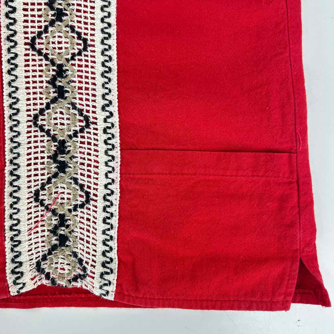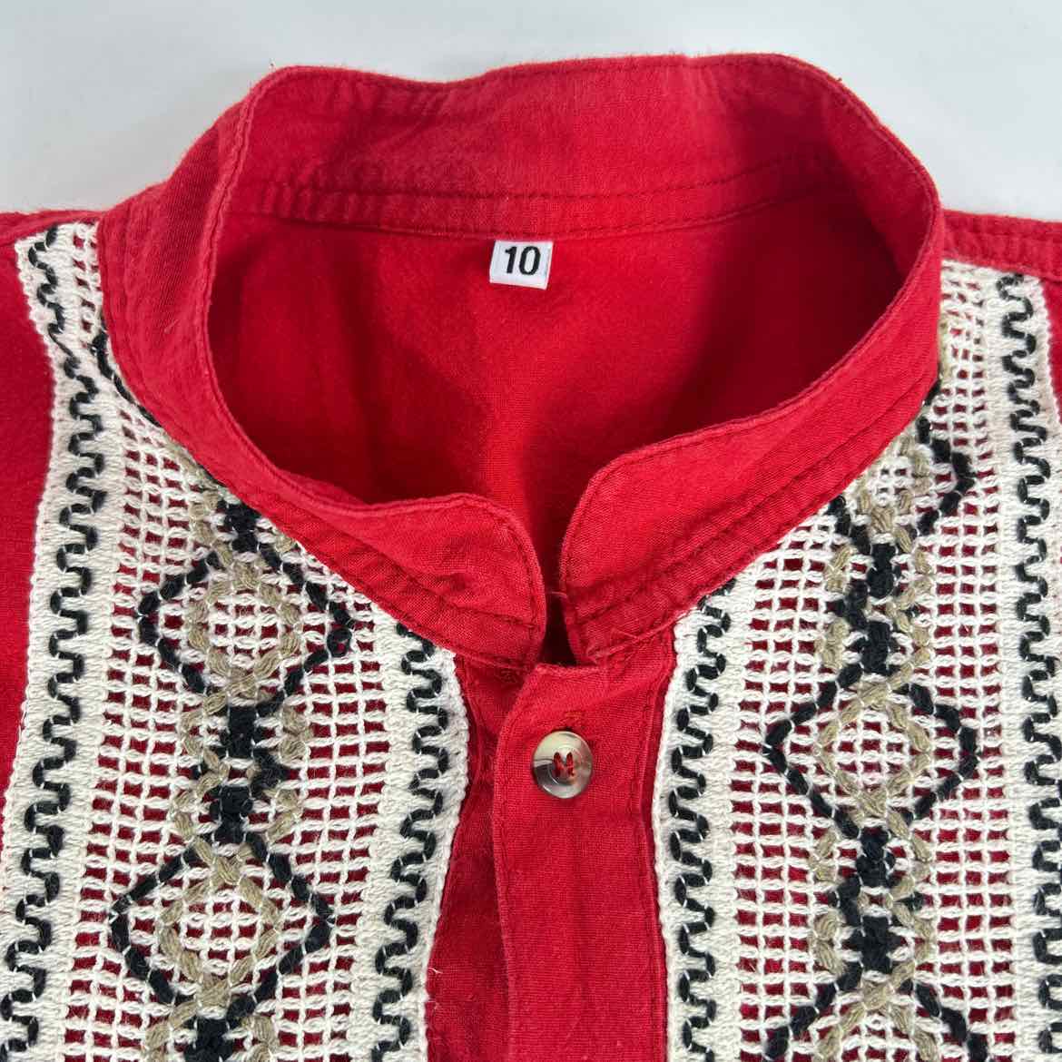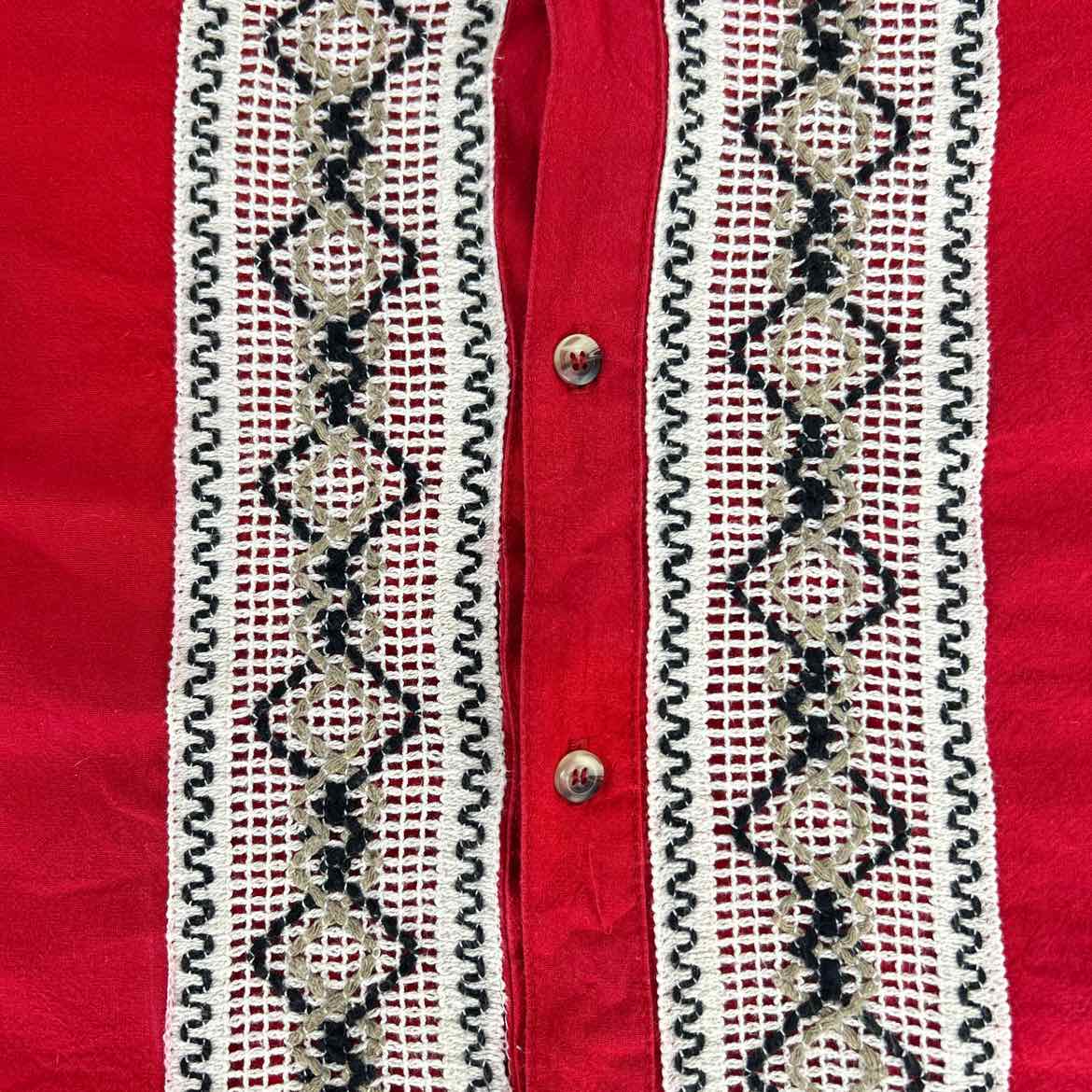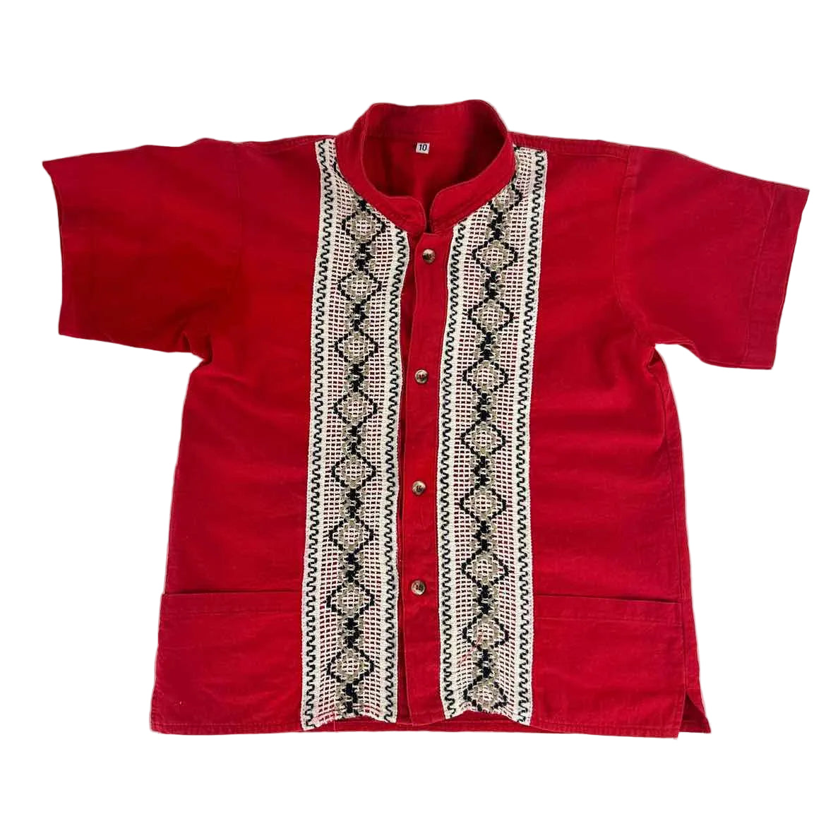 Vintage Mexican Guayabera short sleeve boys shirt in bold red with black and white embroidered strips on either side of the buttons. Labeled size 10, it is in very good vintage condition and timelessly cool.