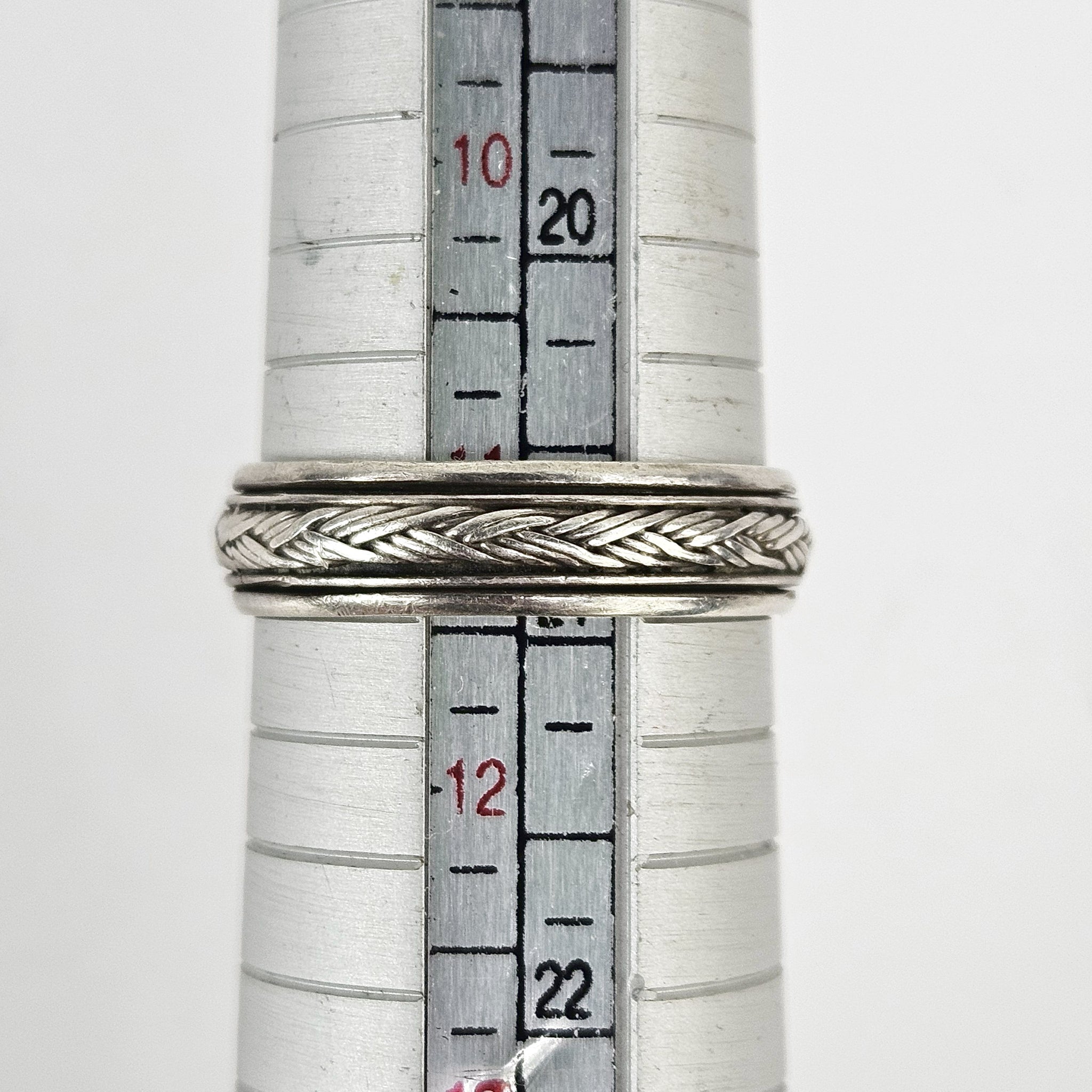 Sterling fidget ring with a spinning band of braided silver wire. In very good vintage condition, not stamped but tested as sterling silver.