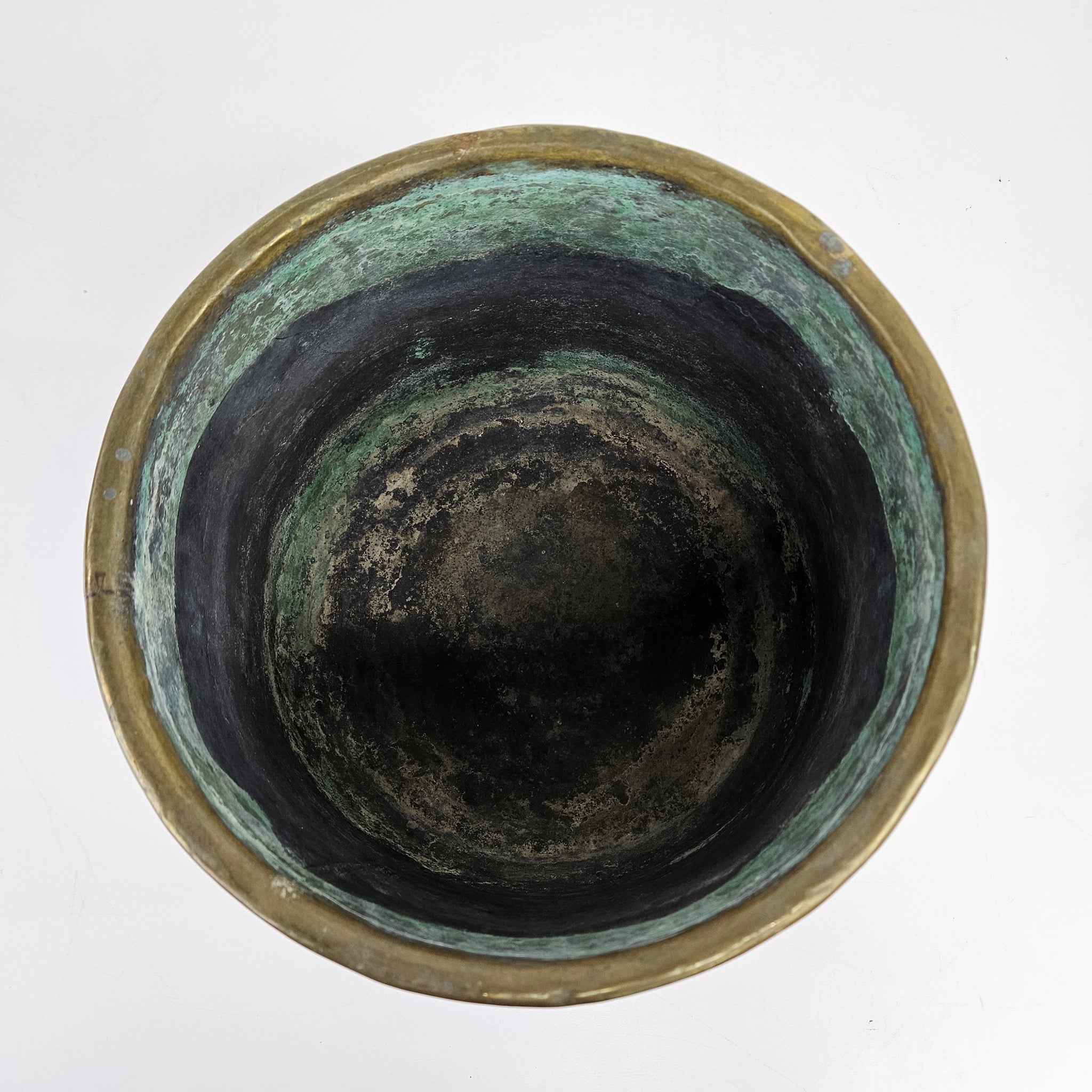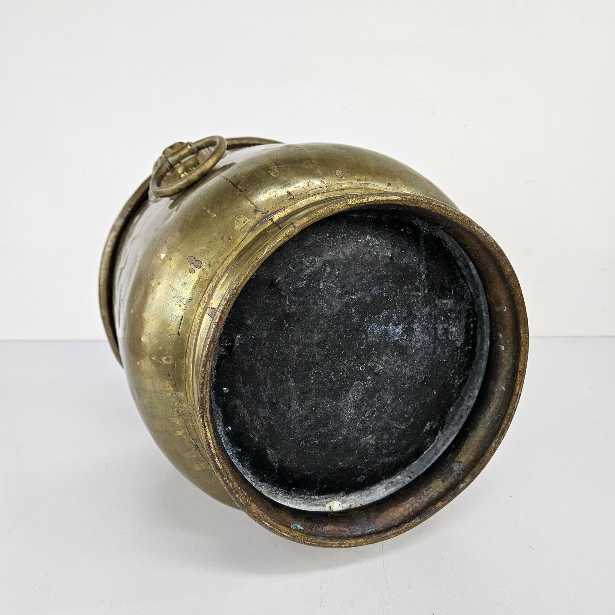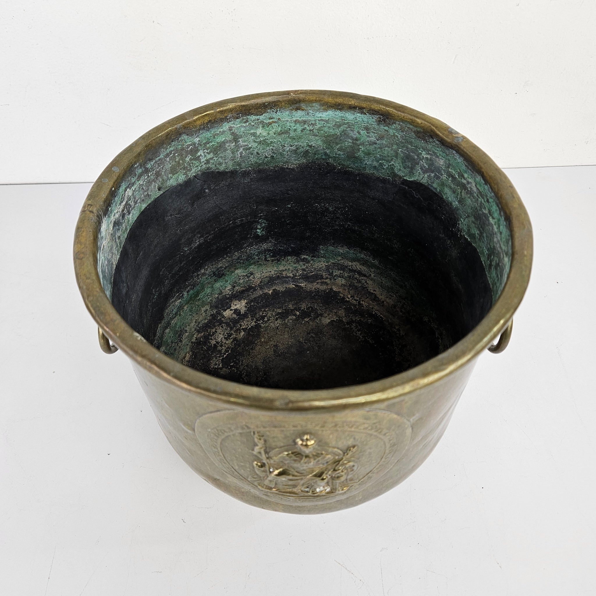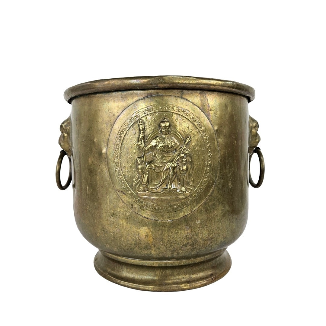 Heavy brass bucket with a Royal French embossed design and lion head ring handles on the sides. In very good vintage condition with some age appropriate wear and patina. This is a great size for a plant or for organizing kindling on a hearth.