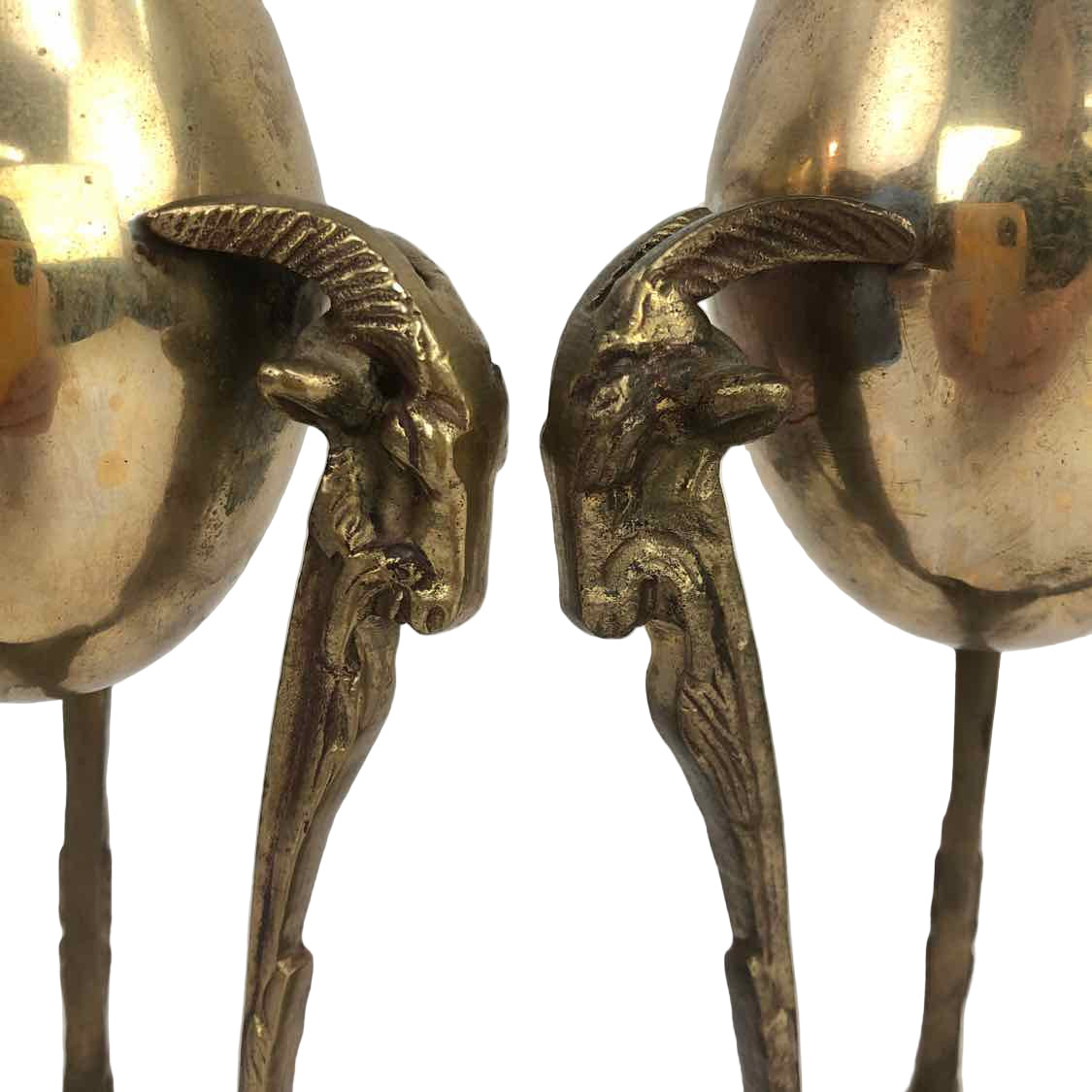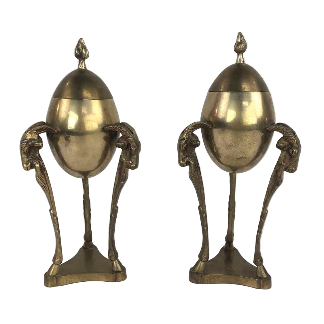 PAIR rare brass egg shaped urns with goat heads on each side of the three legs. They have a triangular base, each with a hoof, and a lid with a finial. In very good vintage condition with original patina. Can be polished to a higher shine.