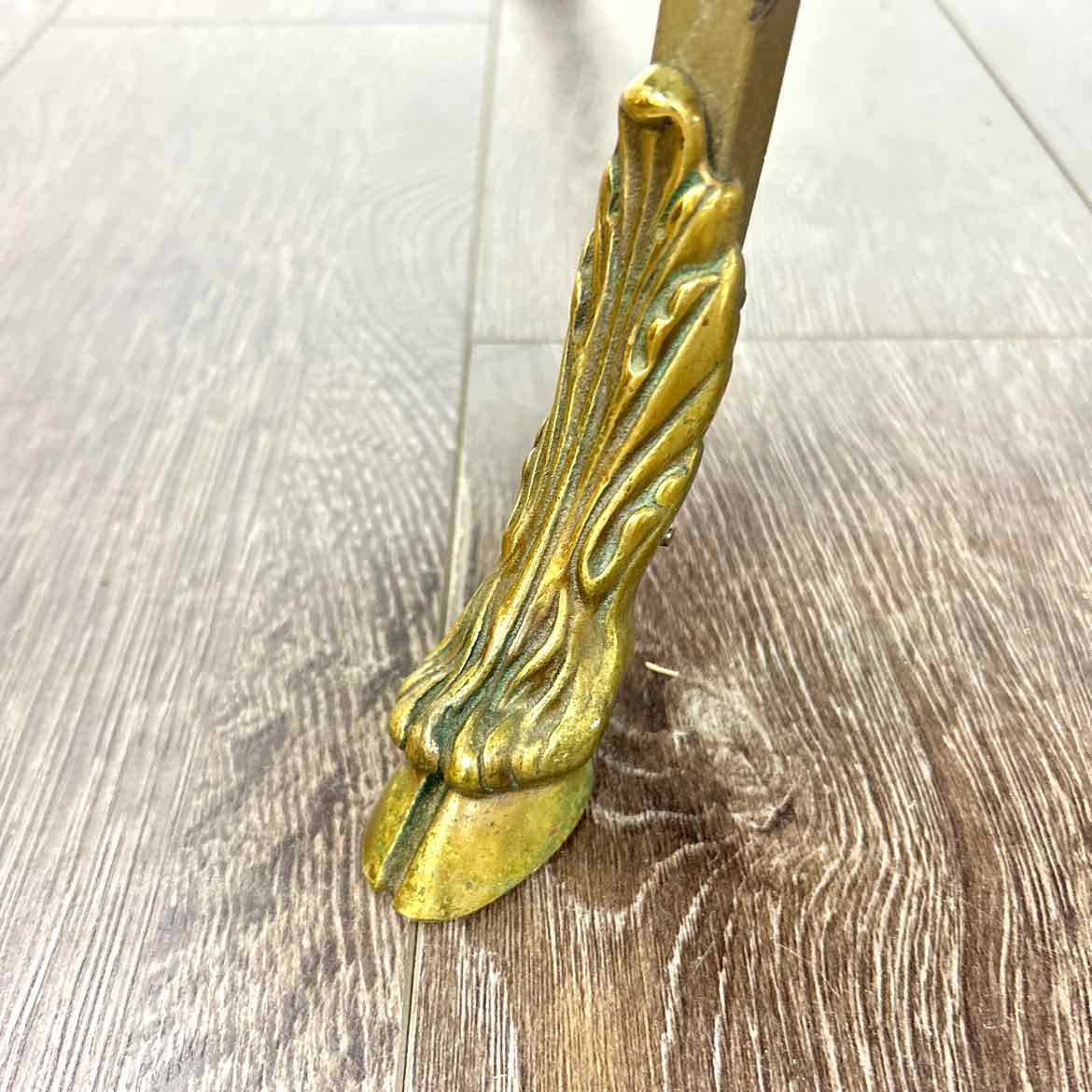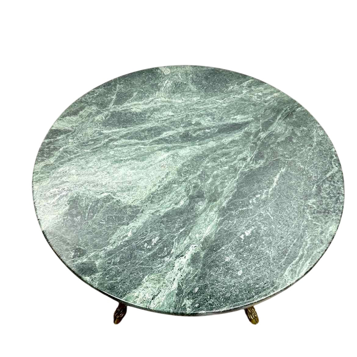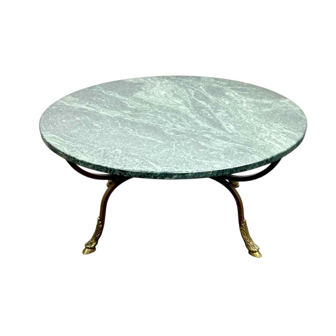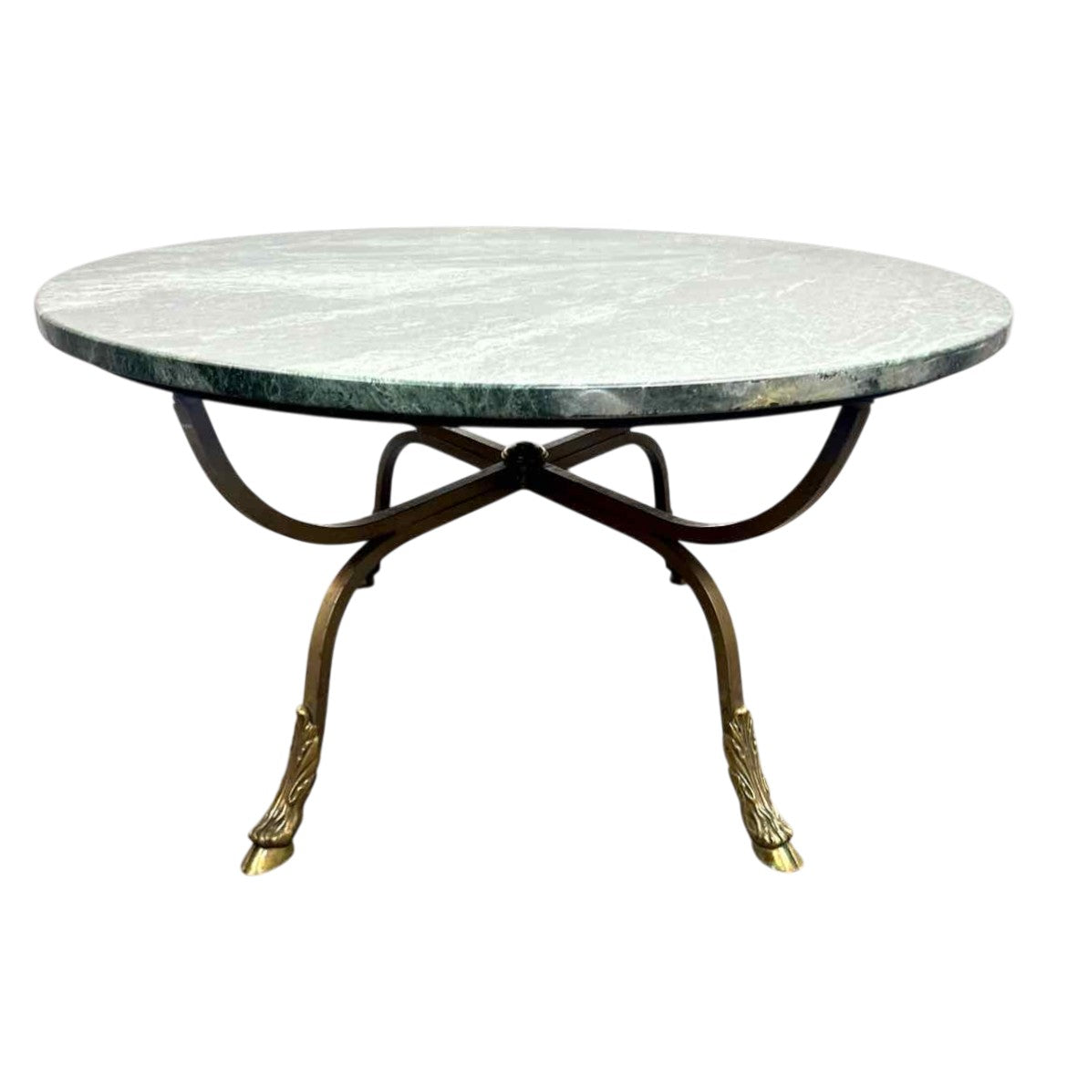 Heavy green marble coffee table featuring a brass and steel base with brass hooves on each leg, in good vintage condition with some wear and chipping to the base as shown.