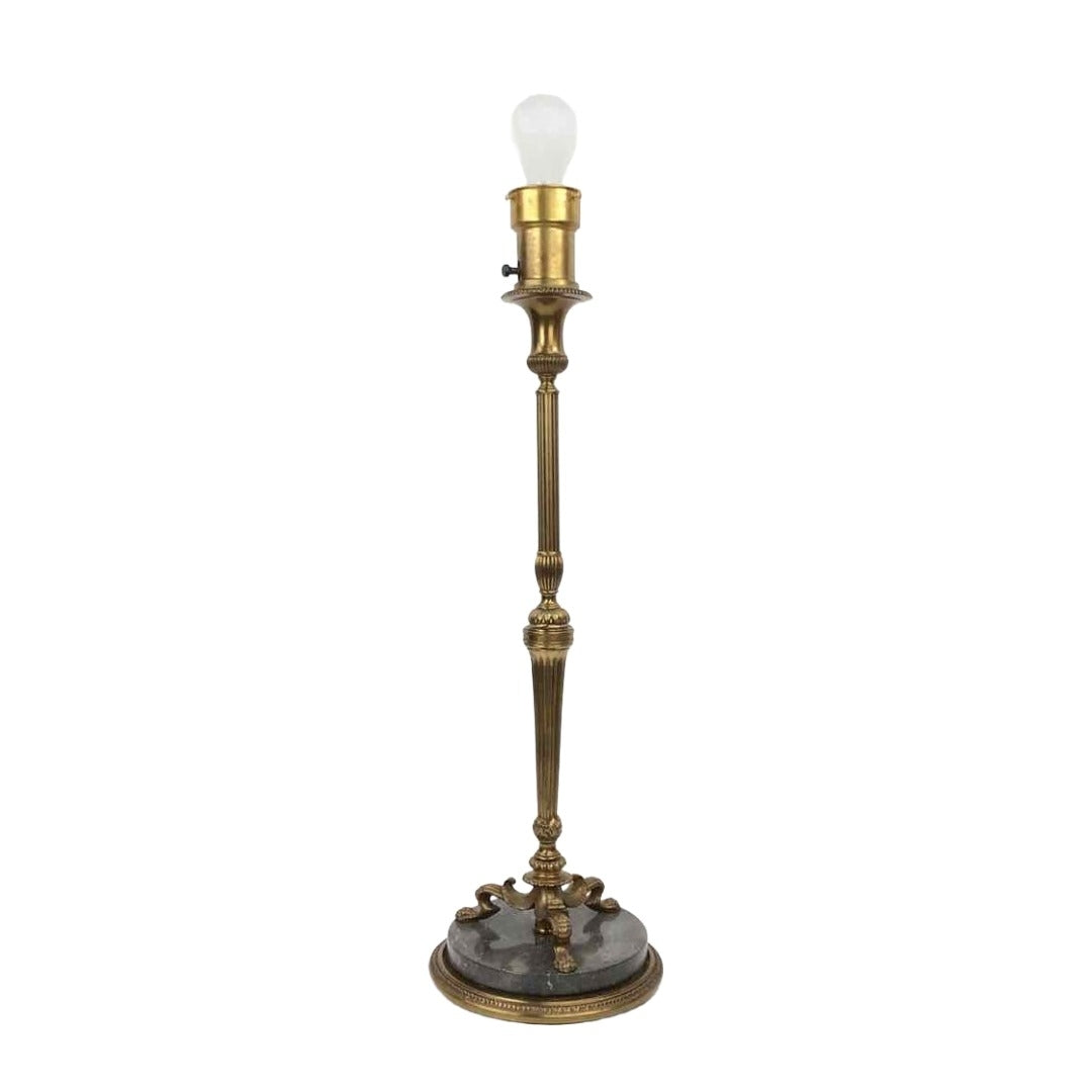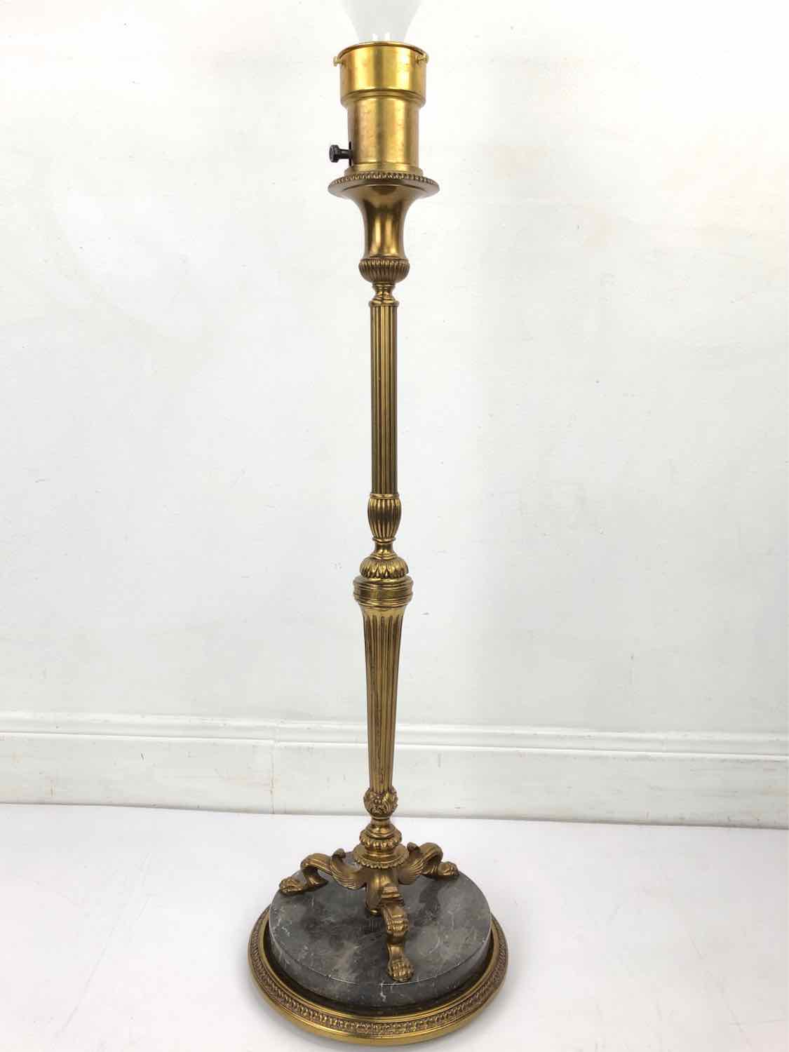 Tall brass & marble lamp with a heavy base and brass footed details, updated wiring and in excellent vintage condition aside from missing shades. It uses a large mogul bulb, and is designed to have a milk glass bowl shade that holds a fabric shade.