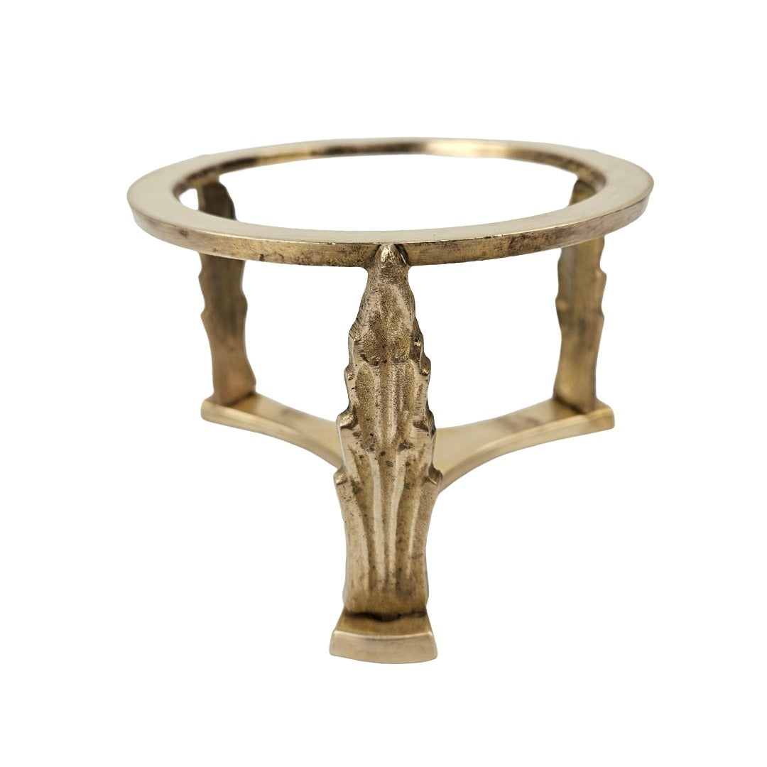 Solid raw brass stand with leaf designs on the legs. Designed to hold a sphere, bowl or candle, in very good vintage condition with a polished patina that still has some imperfections and charm.