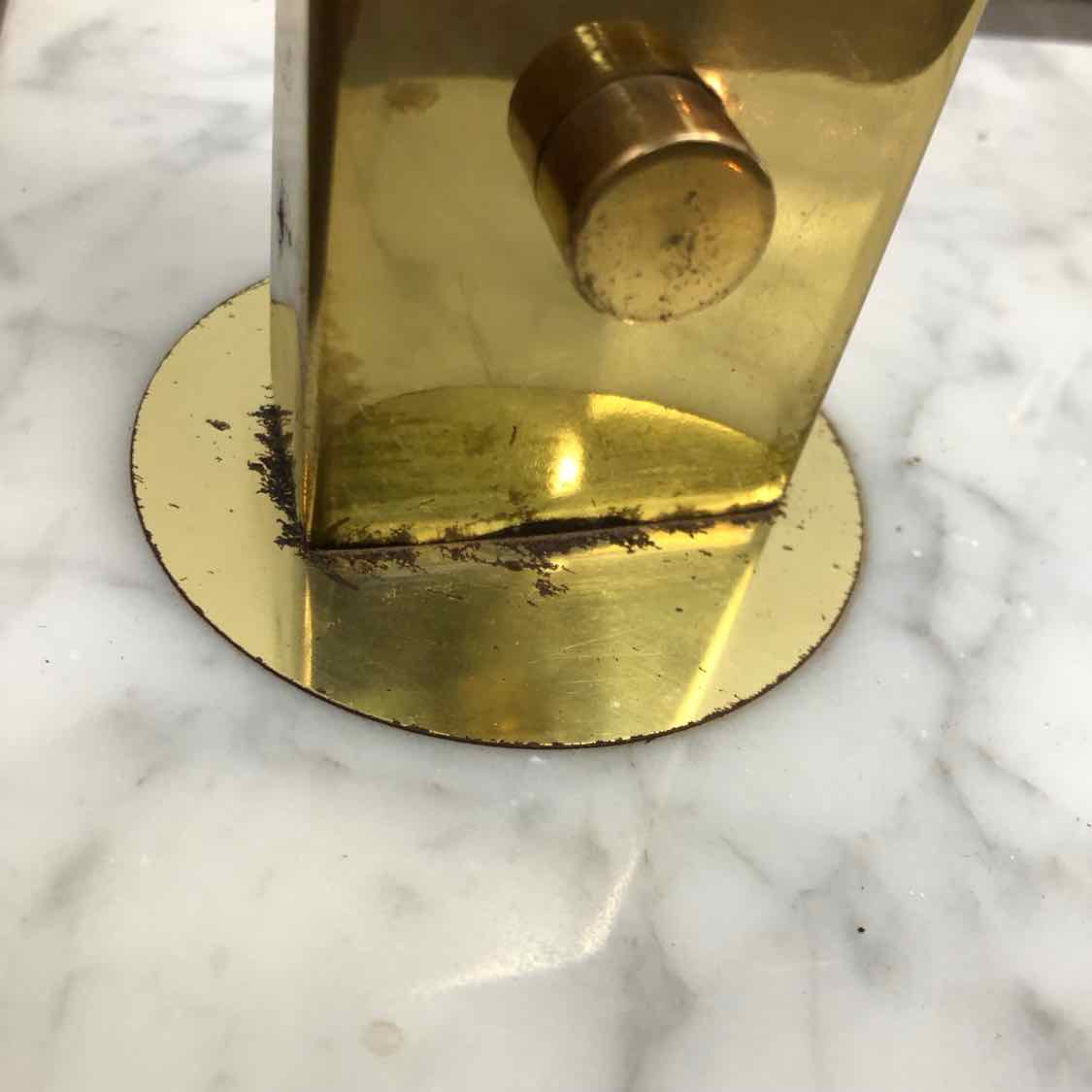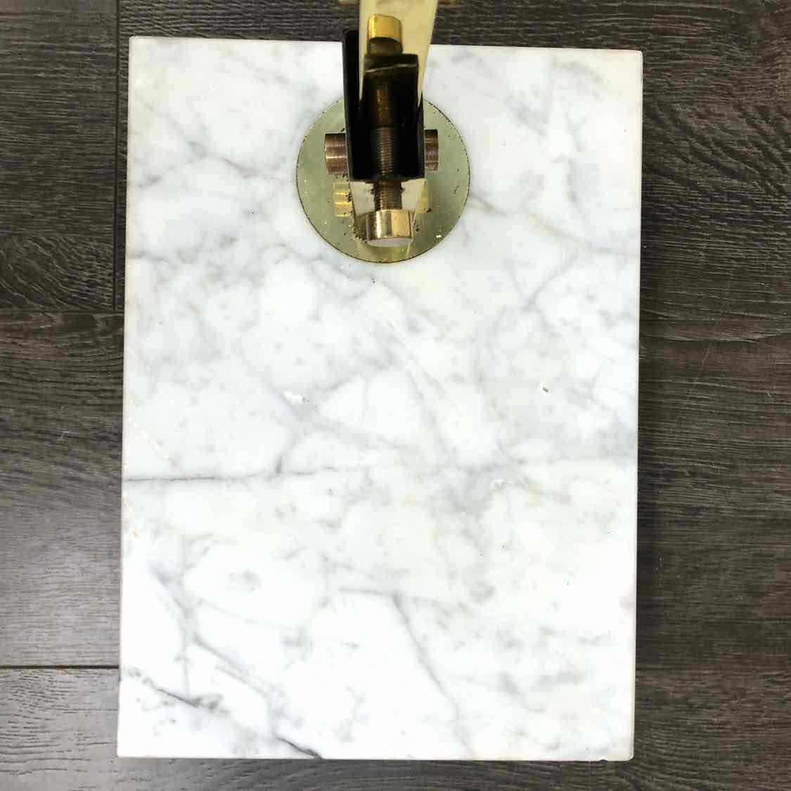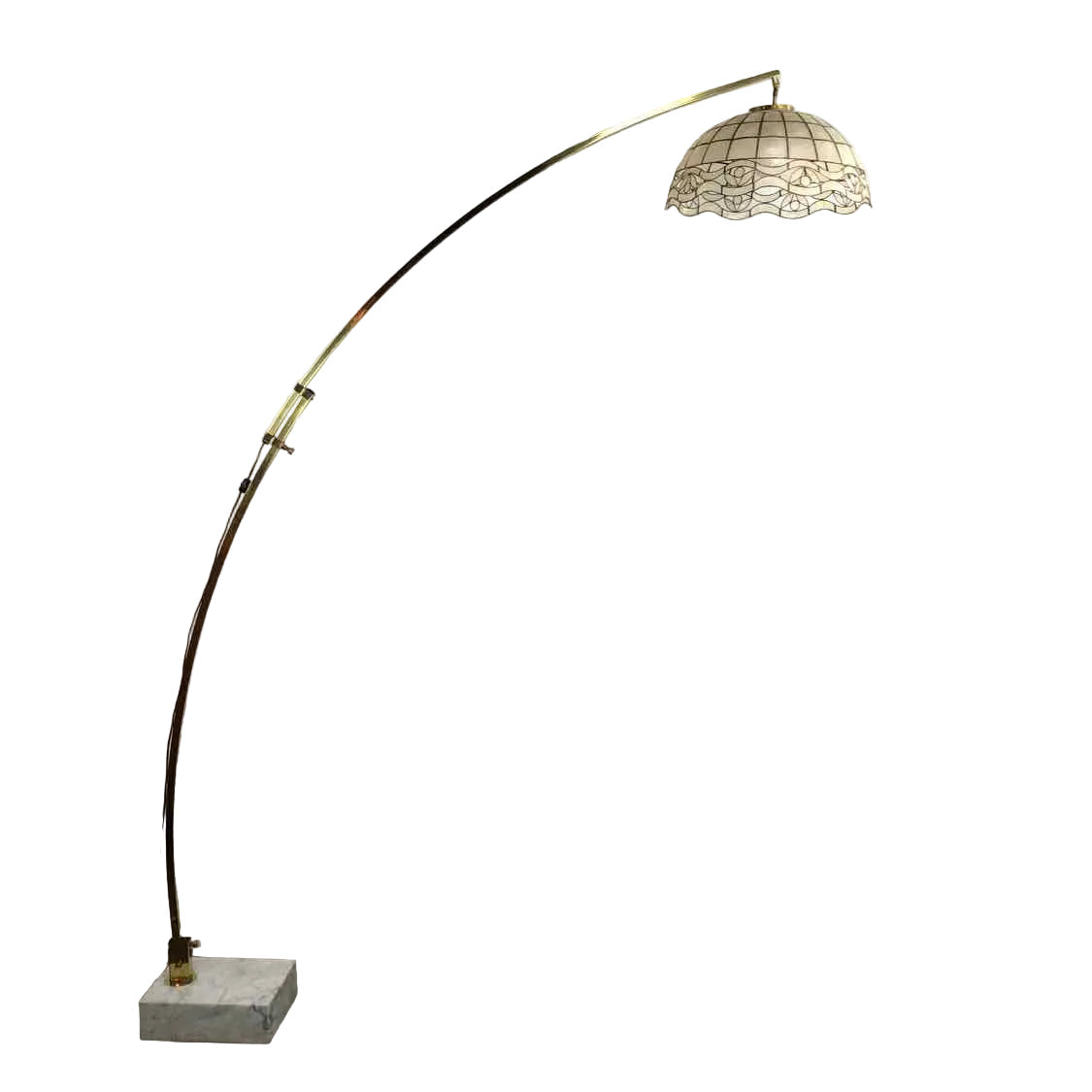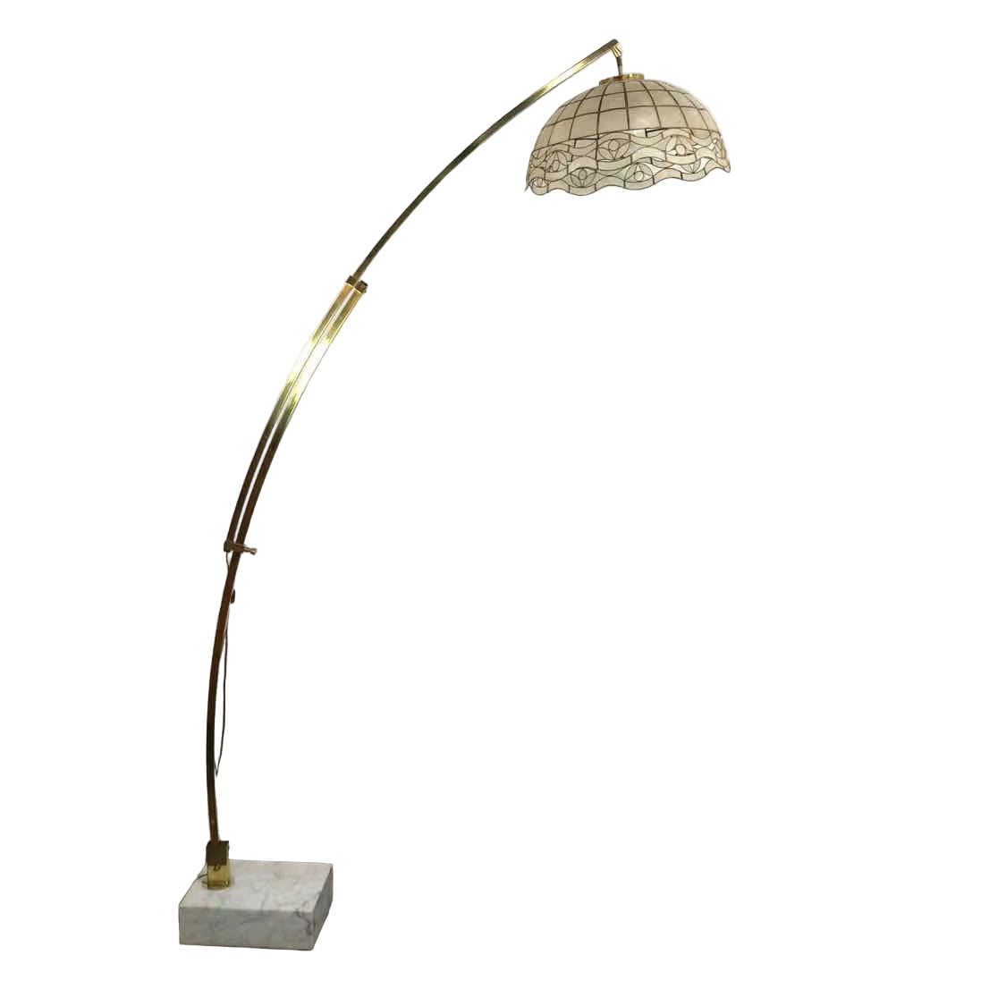 Fabulous gold metal arch lamp with a capiz shell shade and heavy marble base to weigh it down, in very good vintage condition.