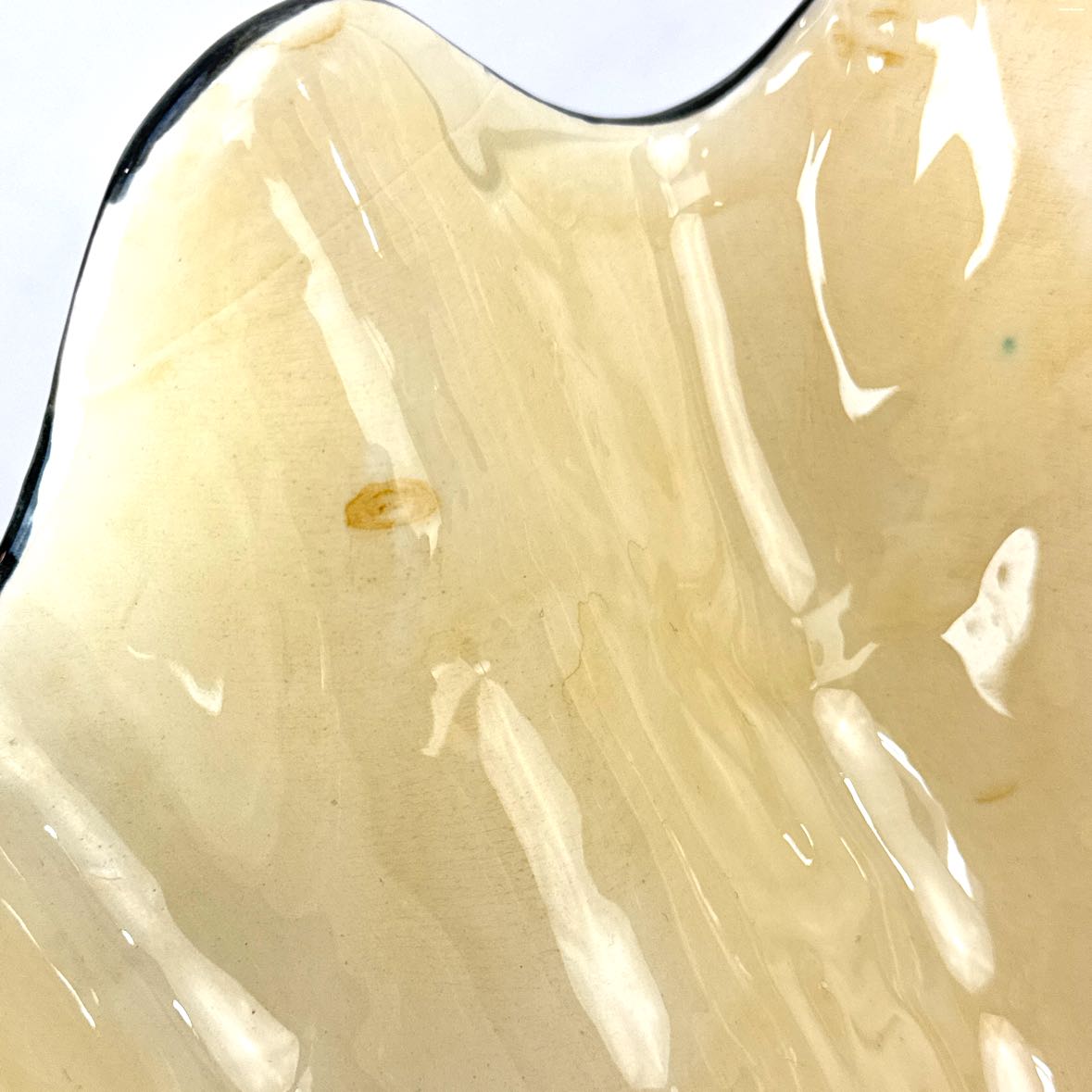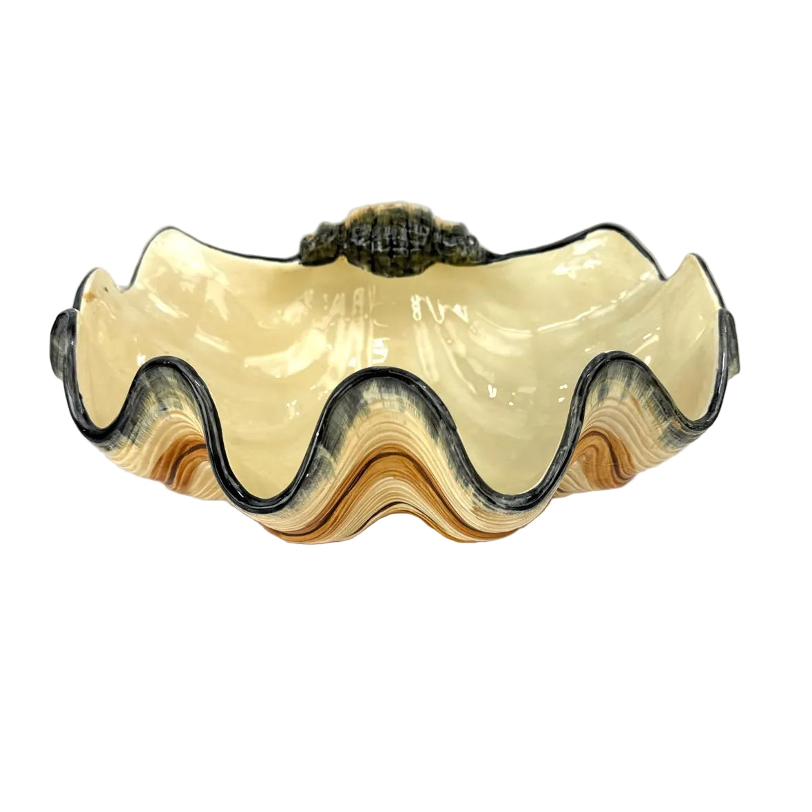 Large gorgeous 1970s clam seashell shell serving bowl from Fitz & Floyd with orange, brown, tan and black hand painted glaze details and nice texture. In very good vintage condition with a few small rim chips as shown.
