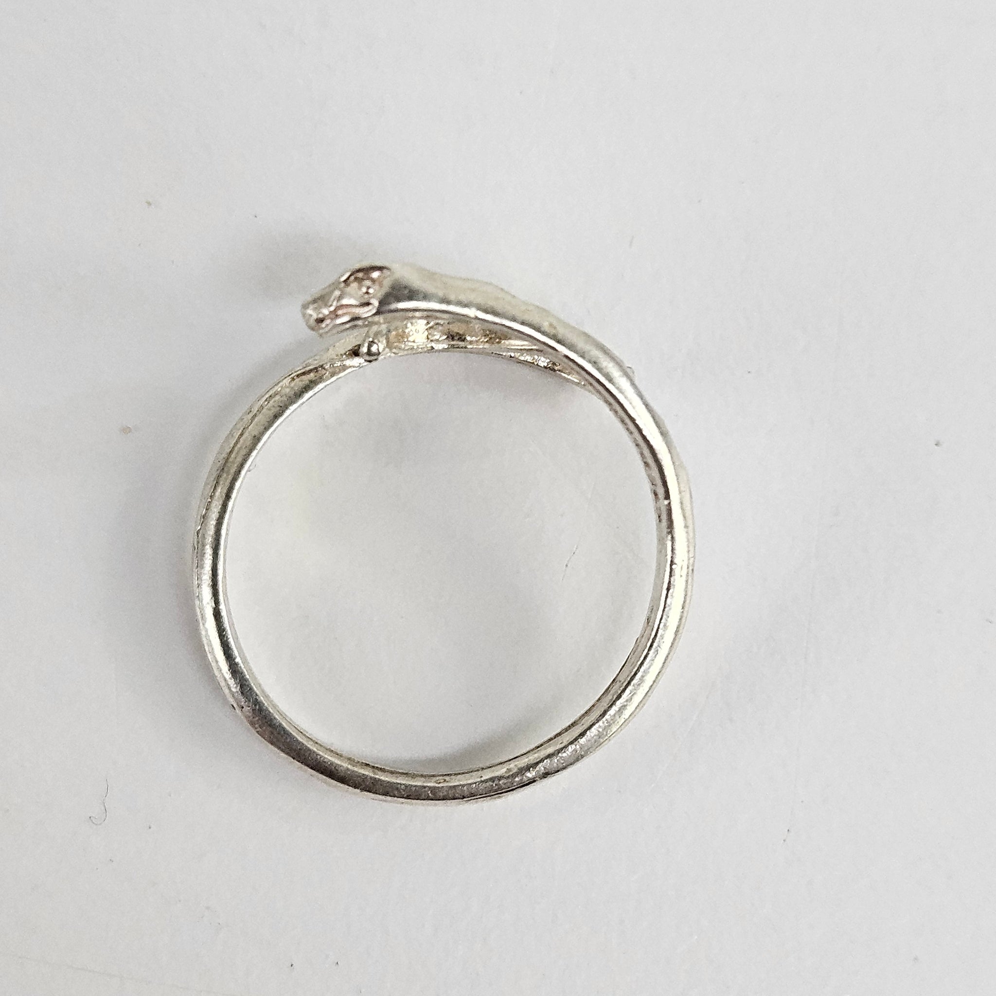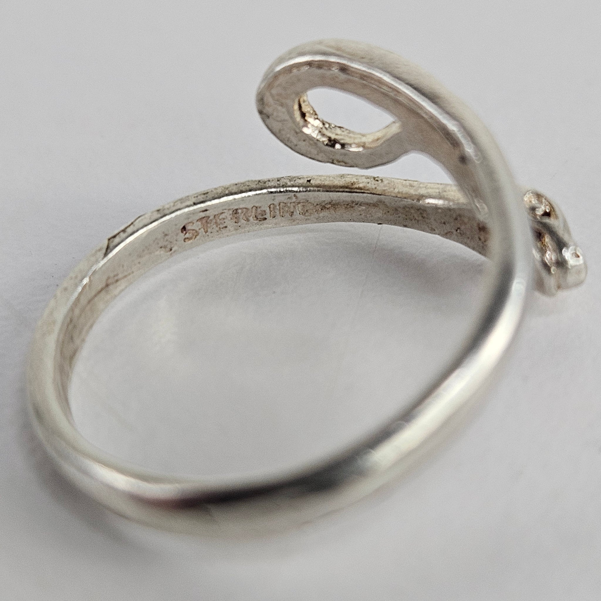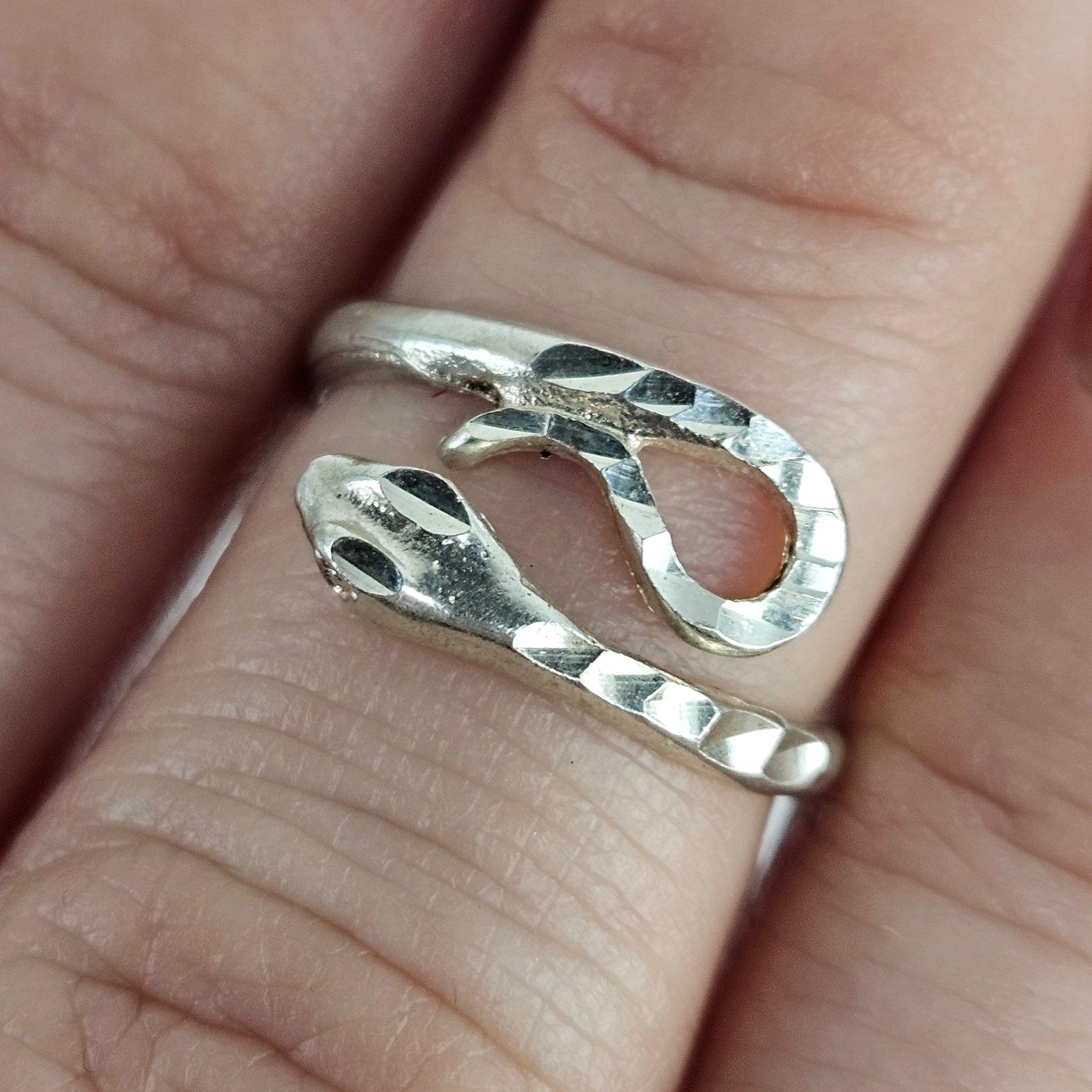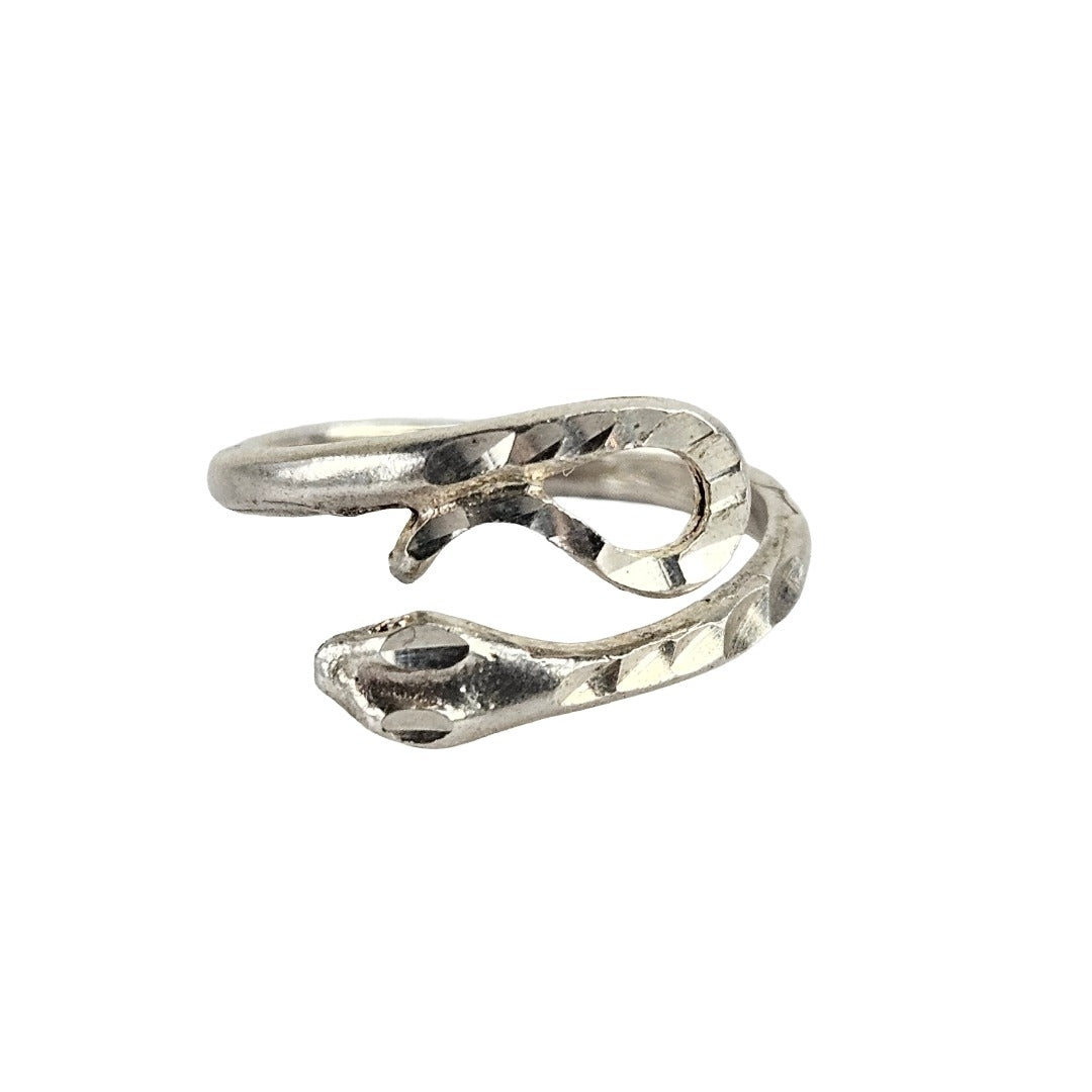 Sterling silver snake ring with a bright silver patina, delicate size and diamond cut details, in excellent vintage condition and stamped .925. Weighs 2.01g.