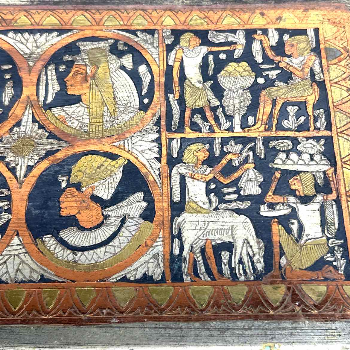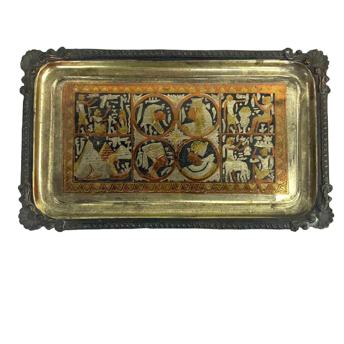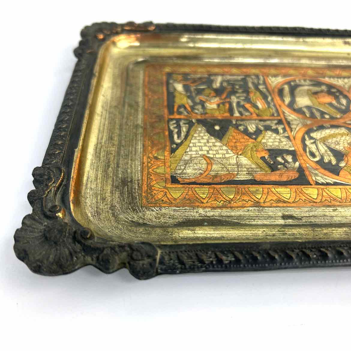 Egyptian metal tray with nice details, in very good vintage condition with some wear from age. This is a great size for organizing, or styling a vanity or bar.