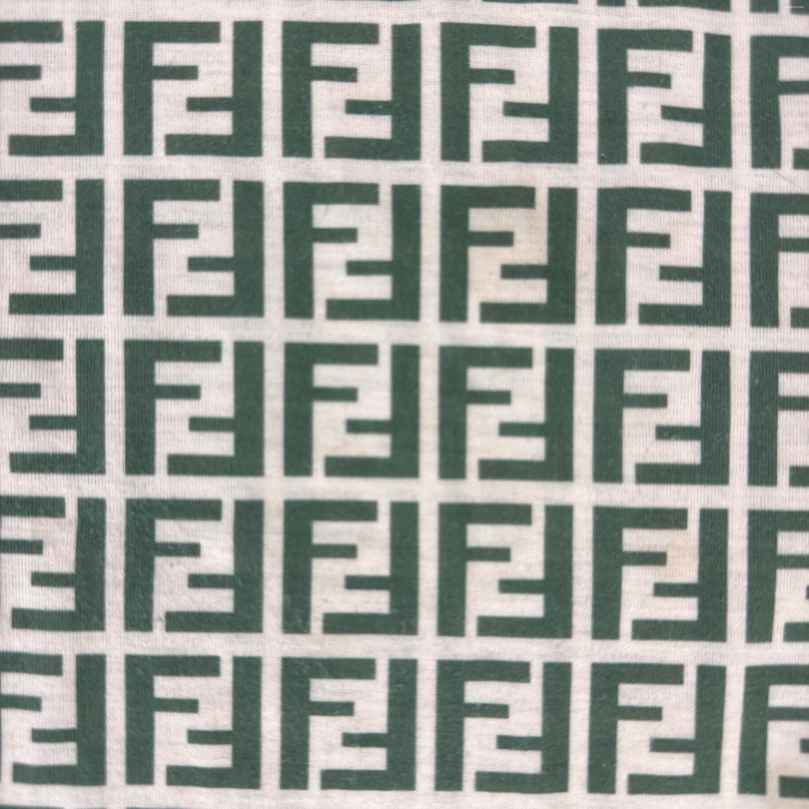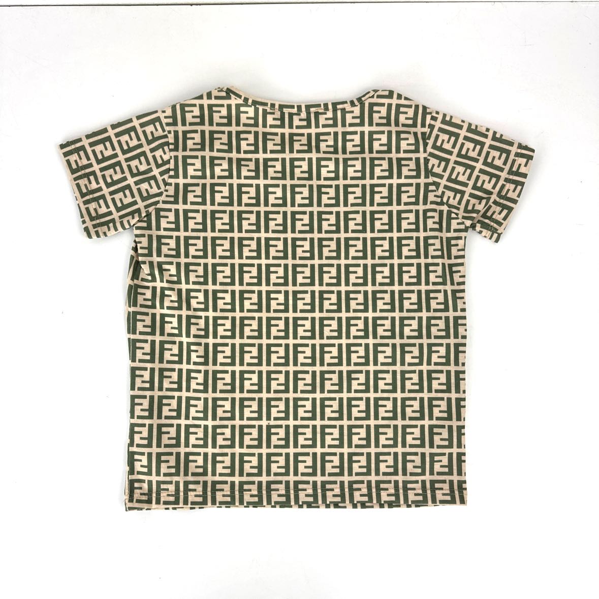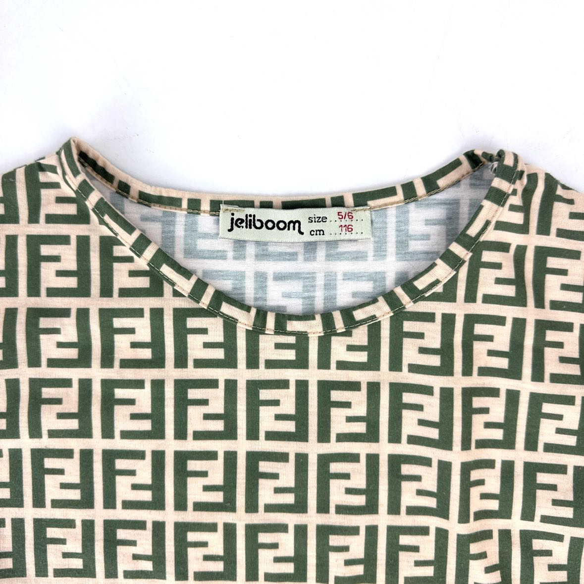 Girls soft t-shirt in beige with green letter F pattern that looks like Fendi, but this is made by Jeliboom. Includes a headband or belt. In very good vintage condition
