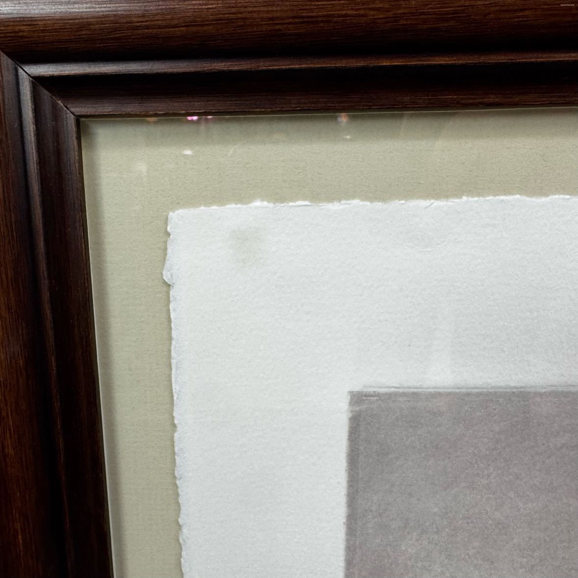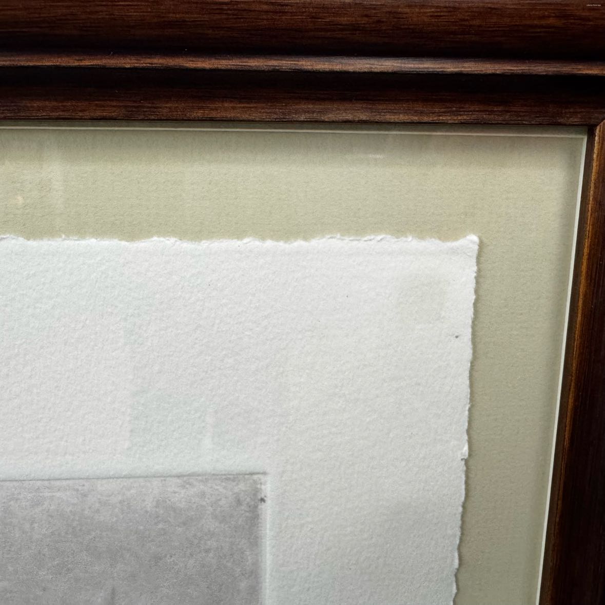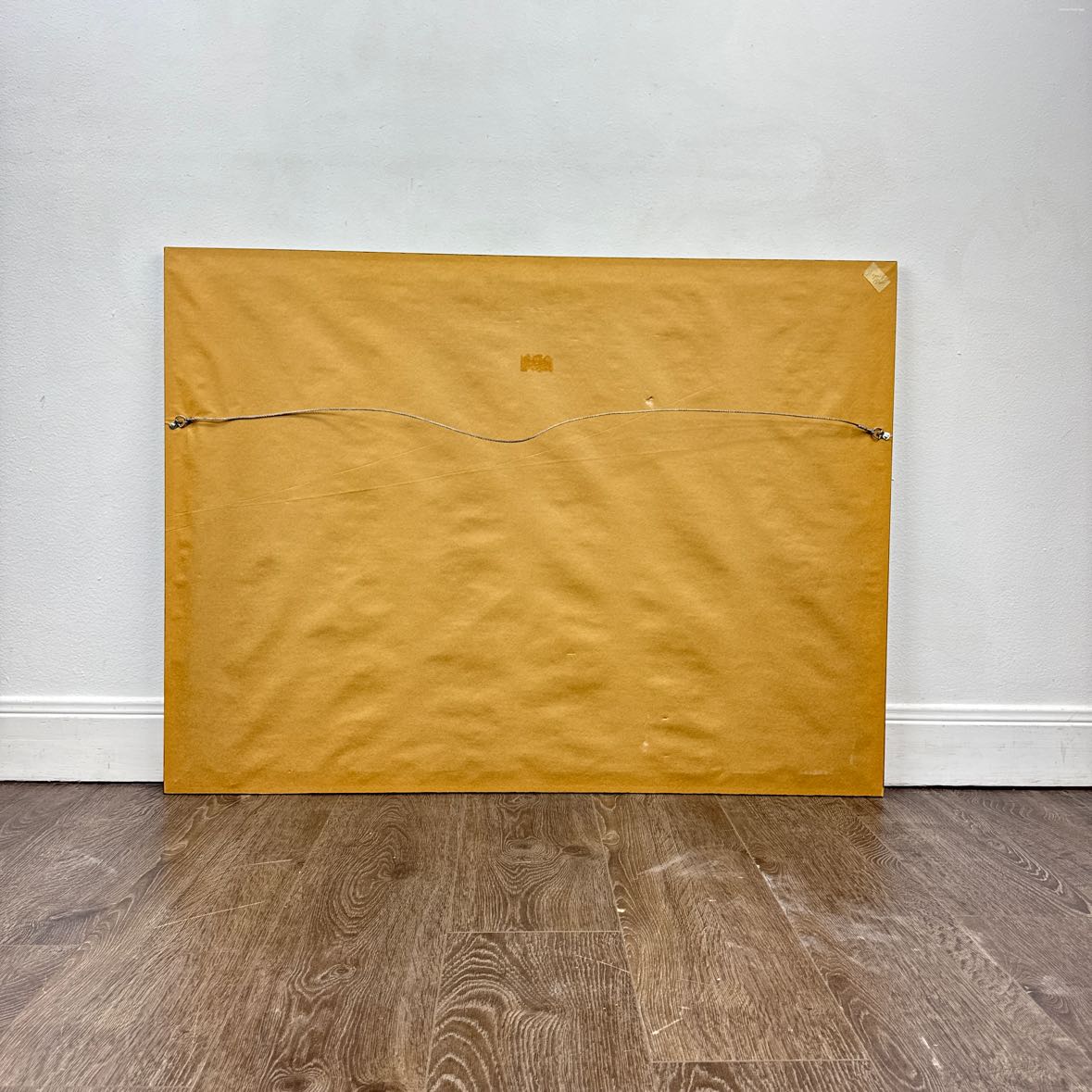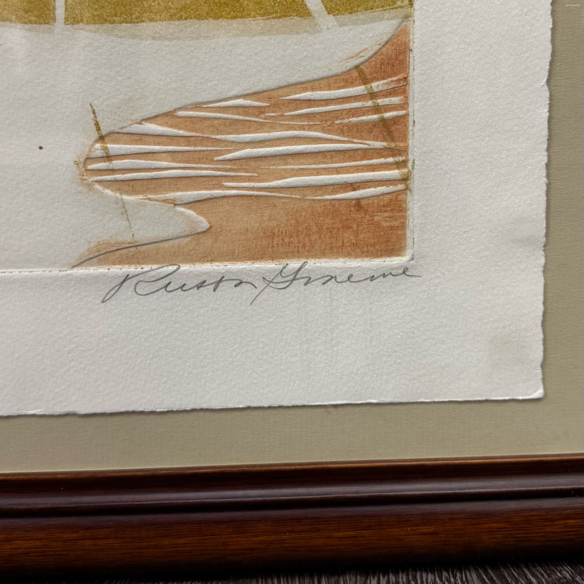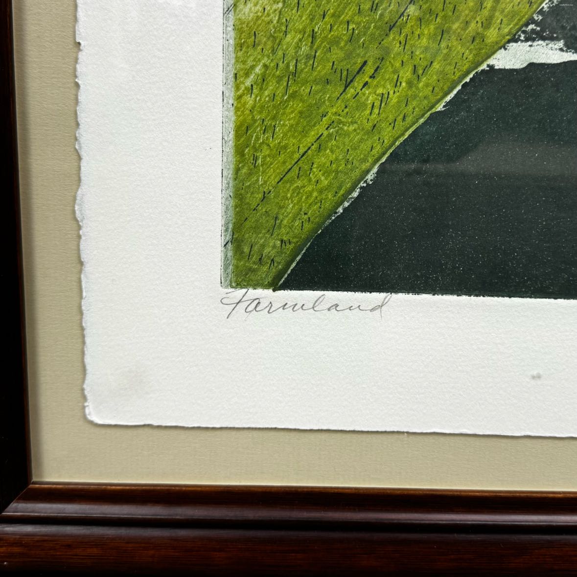 Colorful framed embossed landscape lithograph print titled Farmland by American artist Russa Graeme (1919-1995) in excellent vintage condition and ready to hang. Signed 74/200. | The sale of this item benefits Meals on Wheels in Midland, Tx.