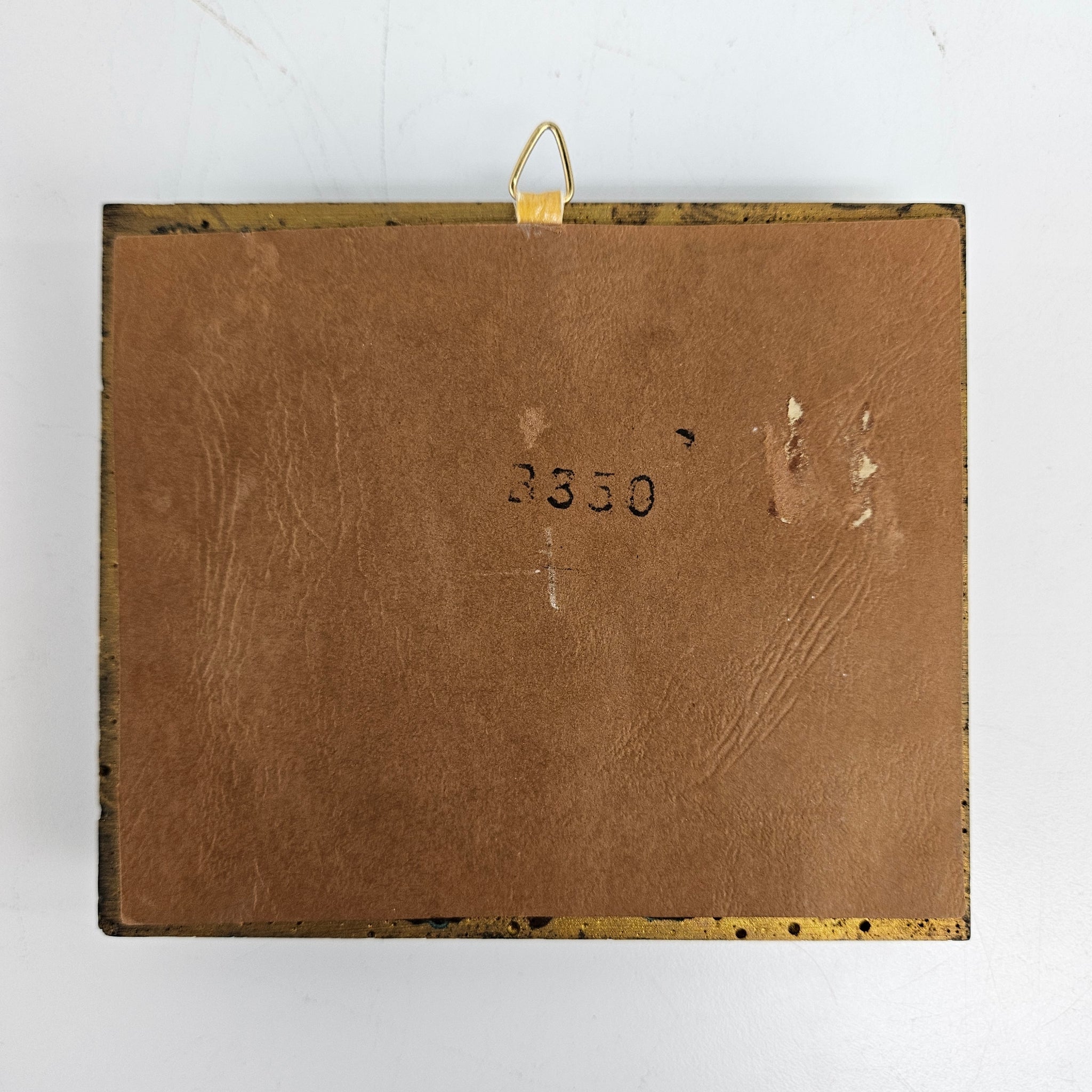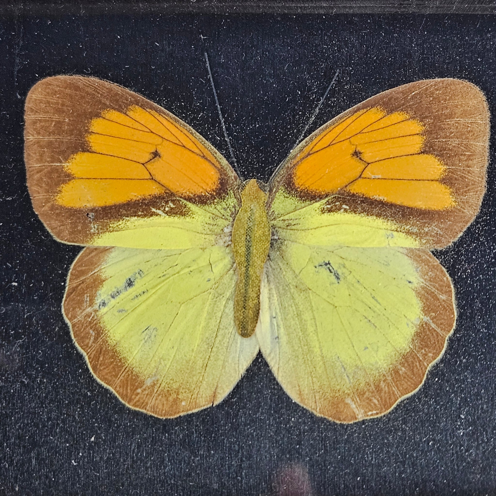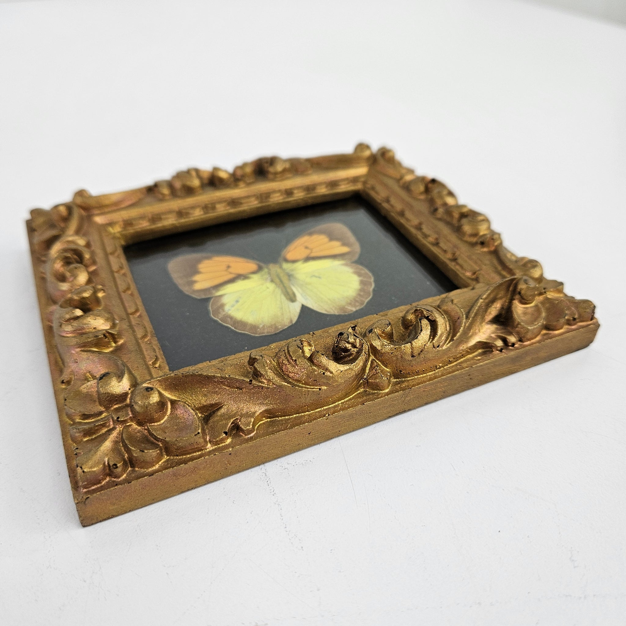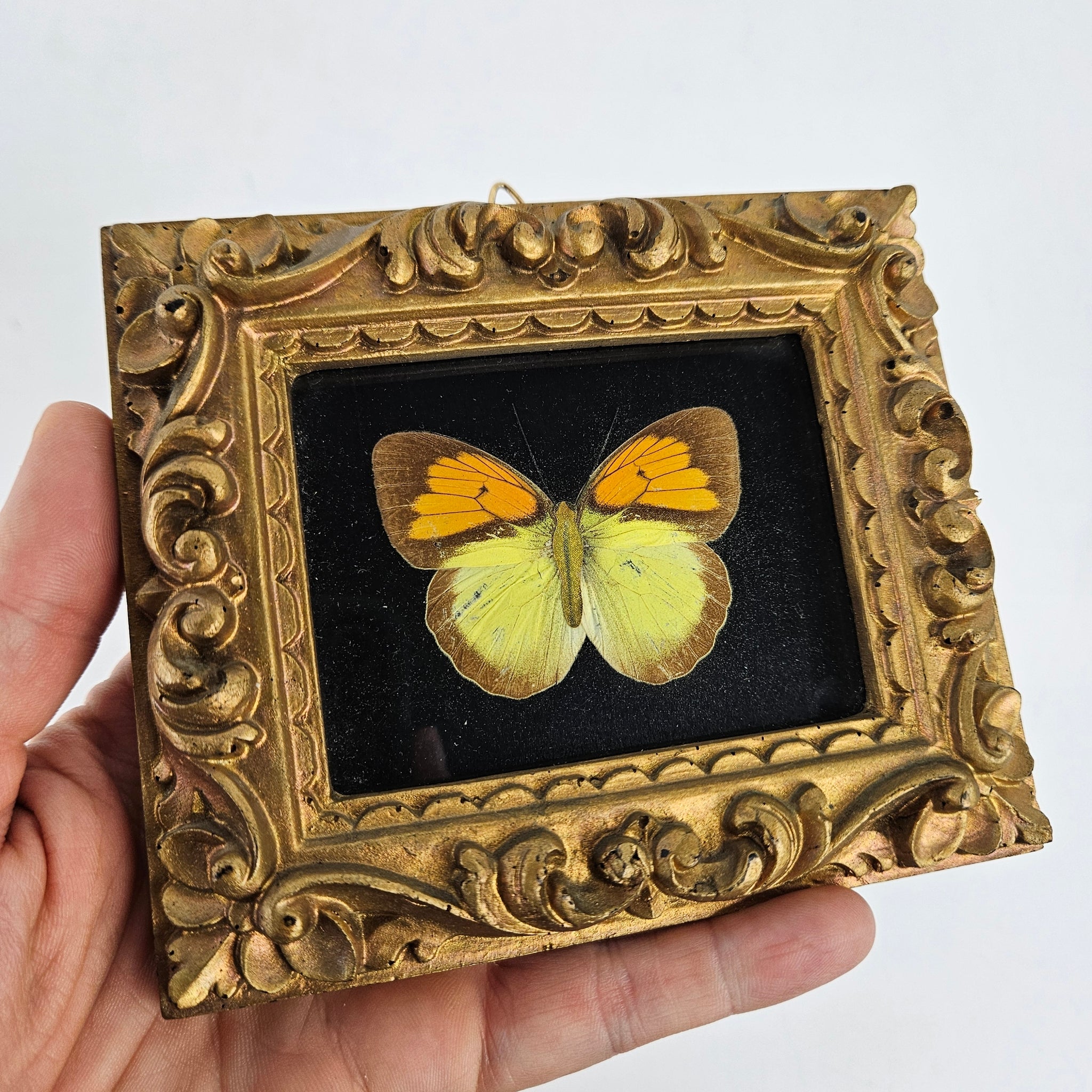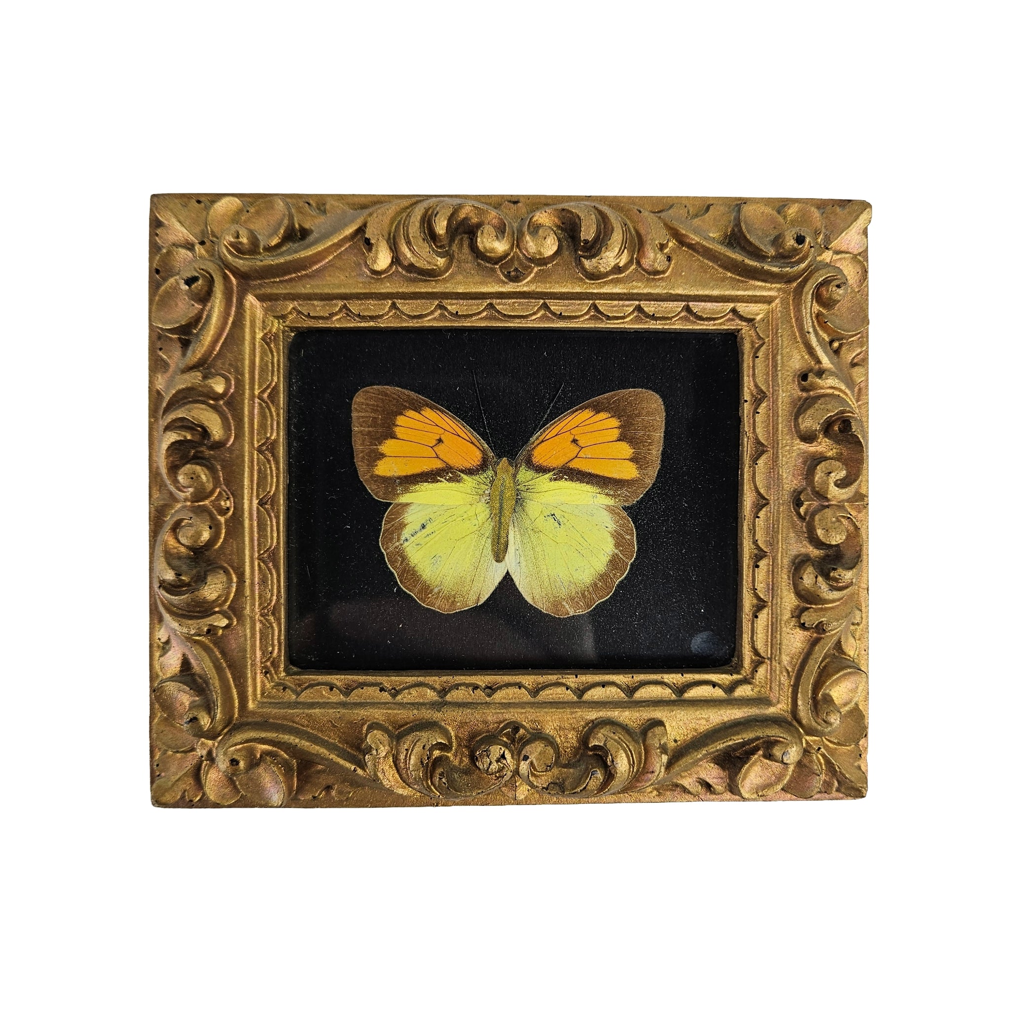Small ornate gold frame with what might be a fully paper print or might be a paper body with actual butterfly wings in orange, yellow & brown on a black background. In very good vintage condition and perfect for a gallery wall. Hangs with a brass loop.