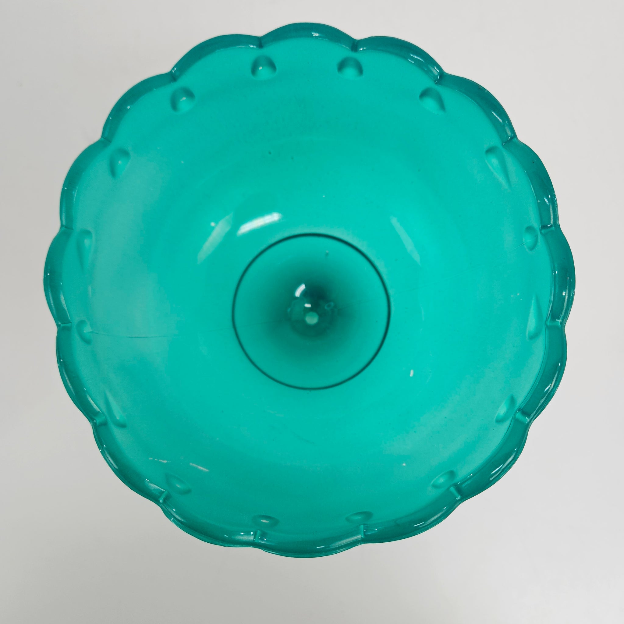 Frosted teal glass pedestal bowl or compote made by Indiana Glass with teardrop design along the scalloped rim. In very good vintage condition with a few scratches to the frosted finish but no chips or cracks.