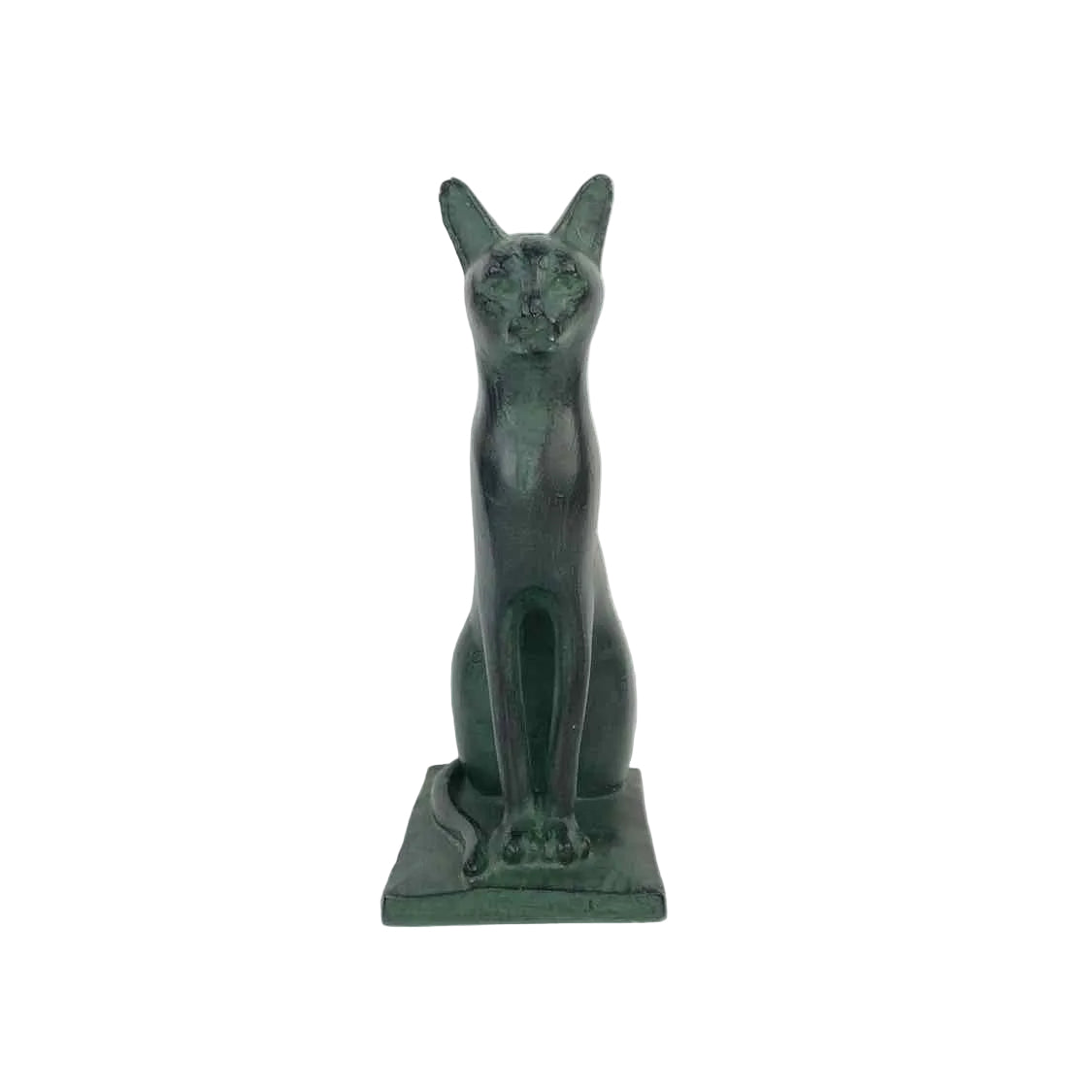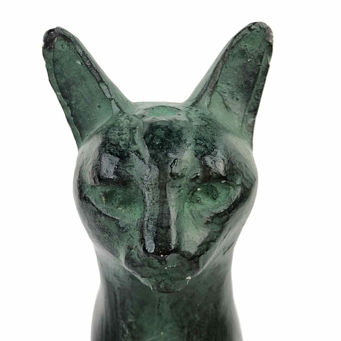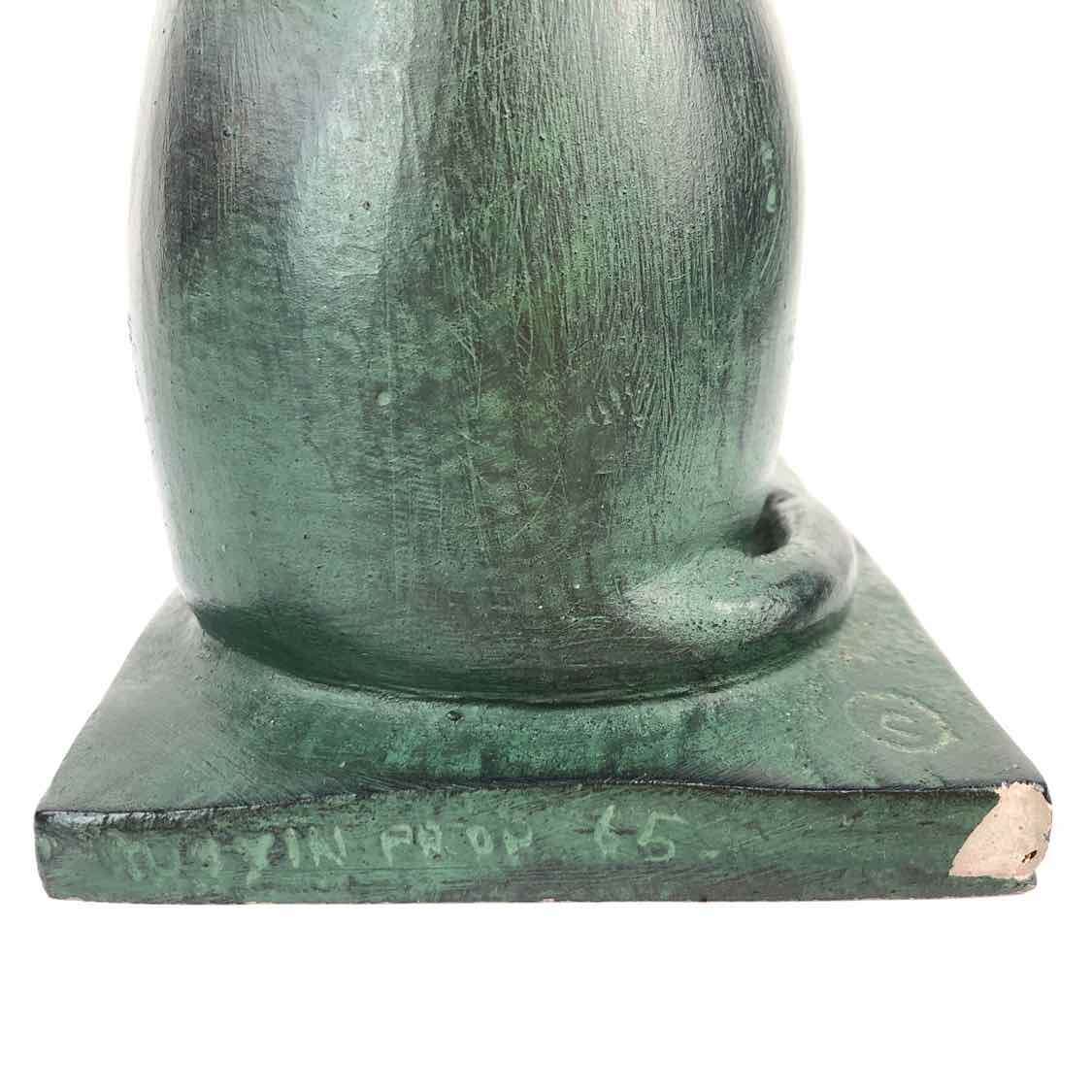 Tall and elegant 1960s cat sculpture with a dark blackish green patina, made by Austin Productions from Durastone, a mix of crushed stone & resin. There is a chip on the back side, & a couple of time ones on the ears, but it's in otherwise good condition.