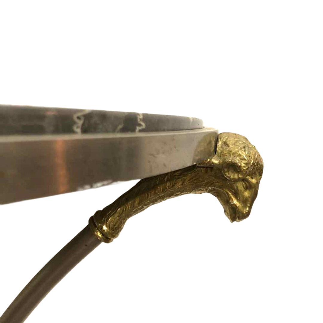 Italian neoclassical demilune table with a black marble top top and a metal base with brass ram heads and hoof feet. In very good vintage condition with a chip on one back corner of the marble. Please note this one is meant to be mounted to a wall. Would look perfect under a full length mirror.