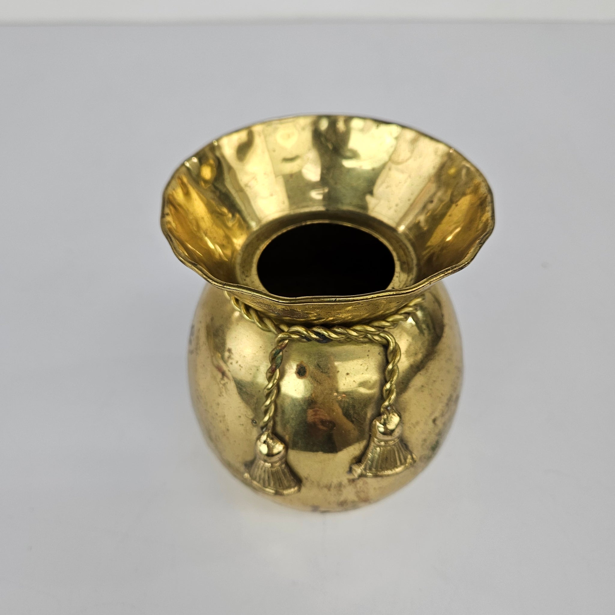 Hammered brass vase that looks like a moneybag with a braided tassel, in good vintage condition with some overall patina and a dent on one side. Great size for displaying feathers, long paintbrushes, or put a glass insert in for fresh flowers & greenery.