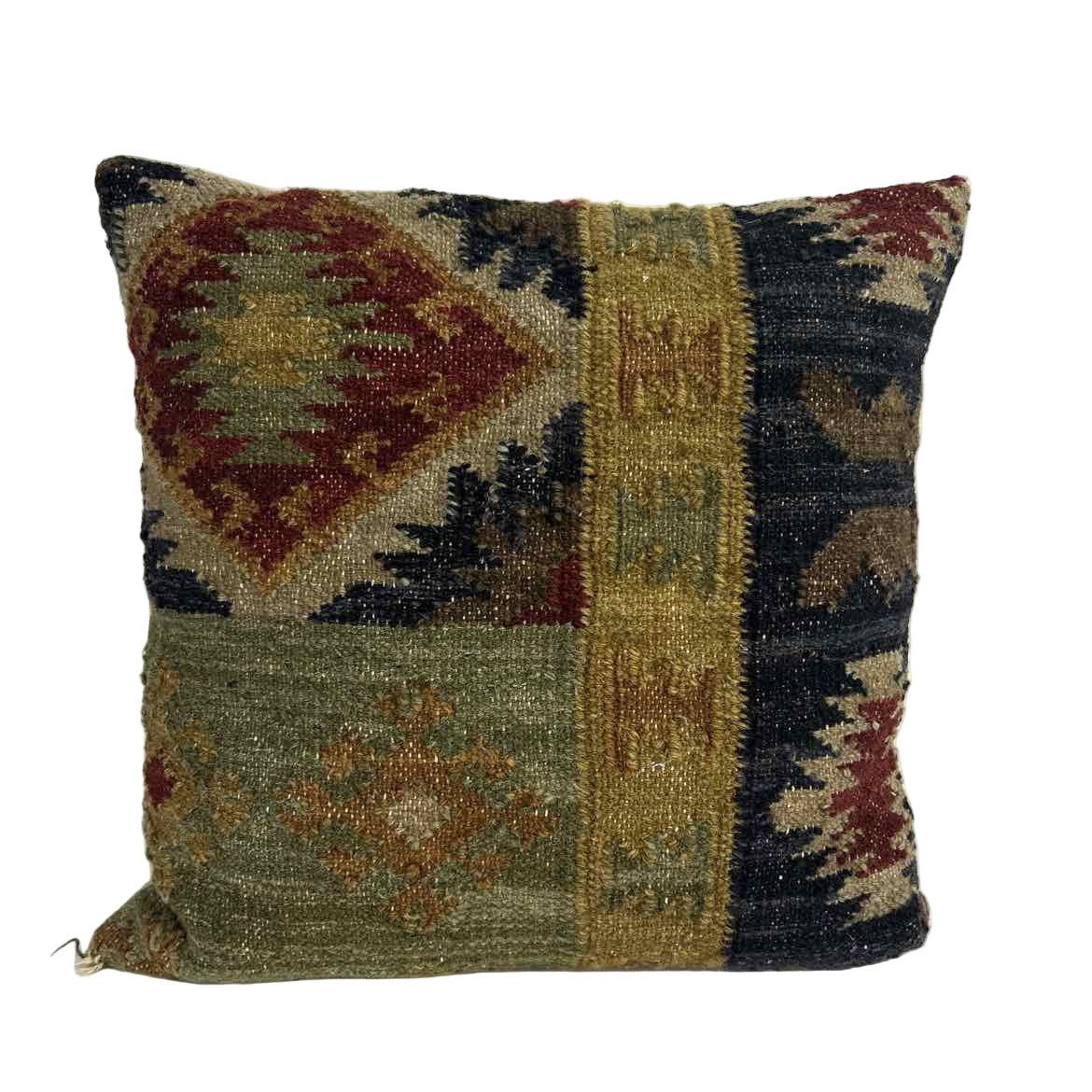 Kilim ug pillow with a removable cover and soft tan canvas back with hidden zipper. This one has some wear in one corner as shown, but is in otherwise good vintage condition.