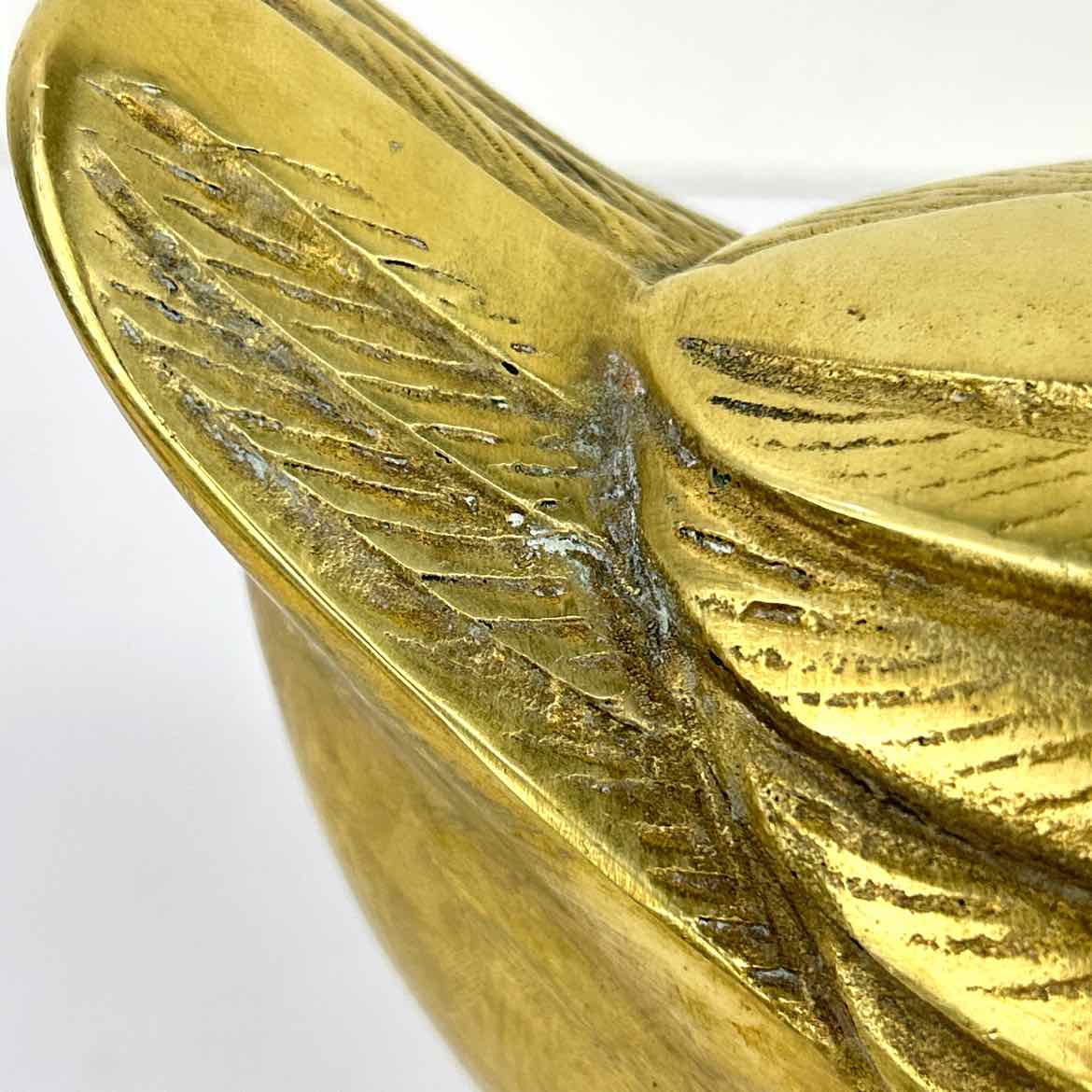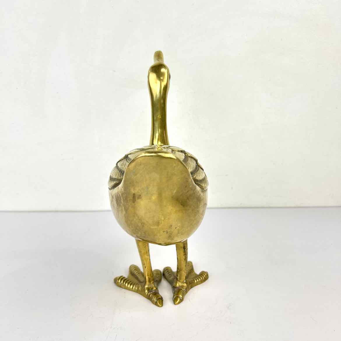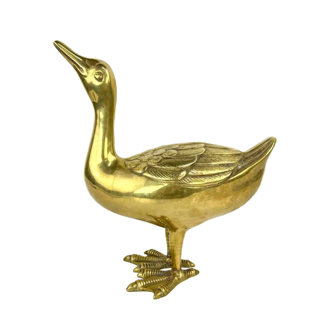 Large and high quality brass duck made in Korea, with nicely detailed feet and feathers, and his head raised up. This large piece is rare and in very good vintage condition with a bright gold patina.