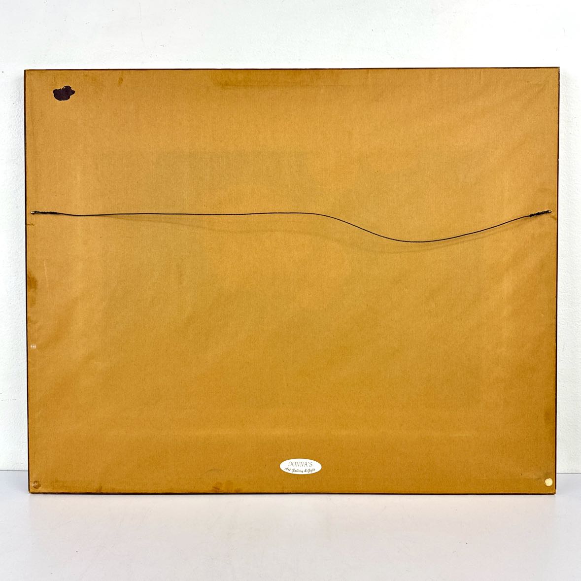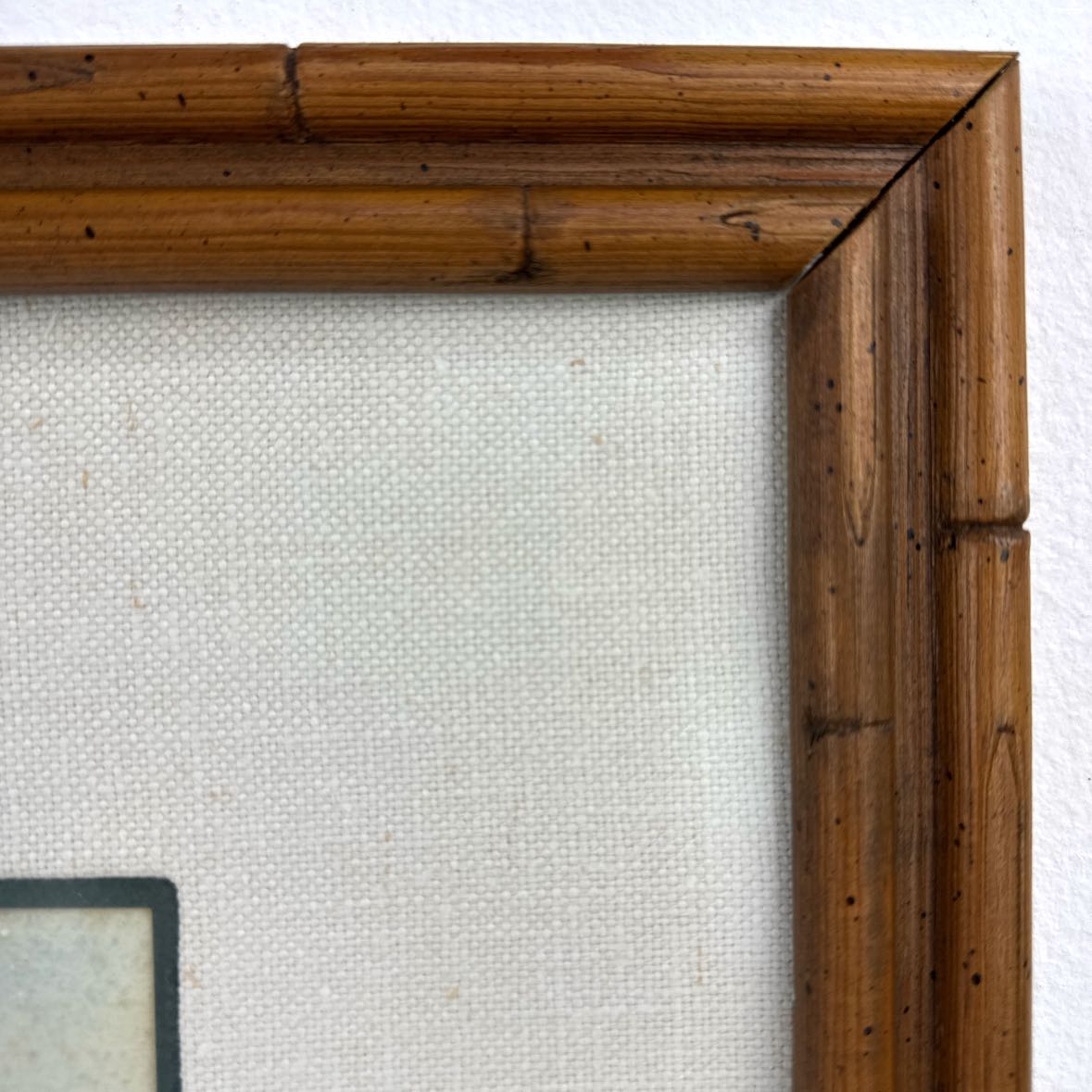 It is framed with a double mat and faux rattan wooden frame behind non-glare glass. Ready to hang with a wire, light finish wear to the wood.