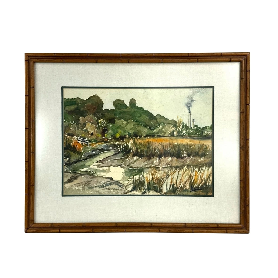 Professionally framed vintage watercolor landscape painting by Georgia artist Stella Morton. The painting shows what looks like a river or marsh with smokestacks in the background, in rich tones.