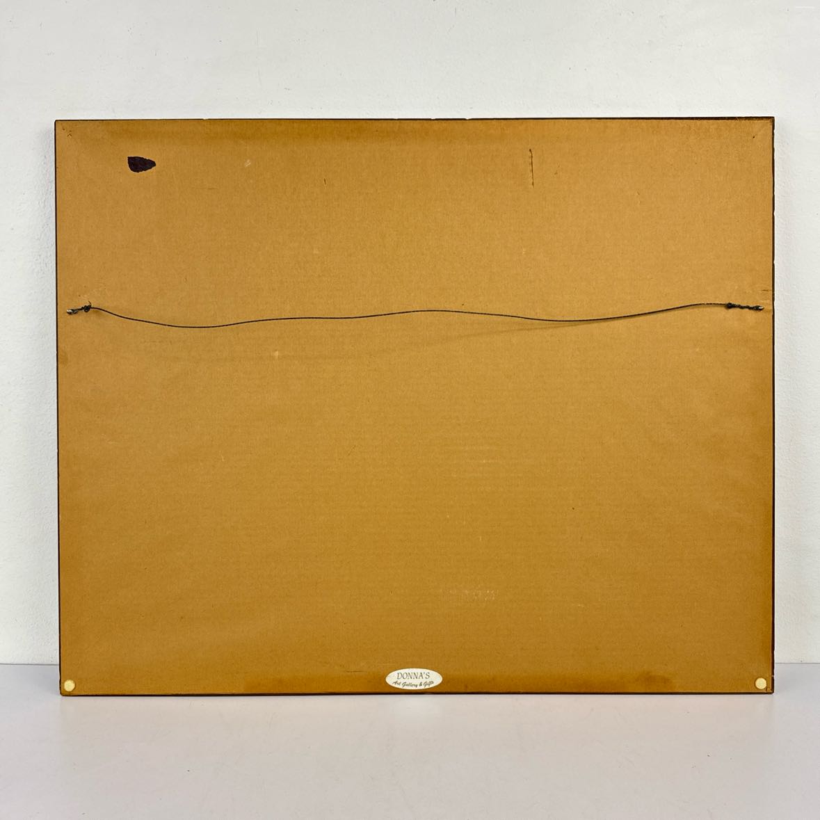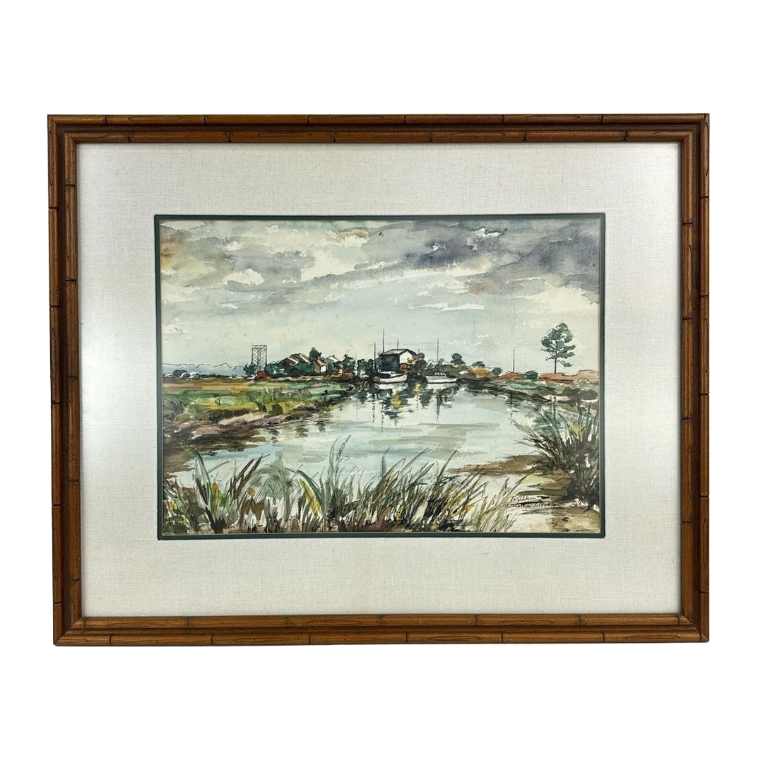 Professionally framed vintage watercolor landscape painting by Georgia artist Stella Morton. The painting shows what looks like a river or marsh with boats, in rich tones. It is signed To Allen, framed with a double mat and faux rattan wooden frame behind non-glare glass. Ready to hang with a wire, light finish wear to the wood.