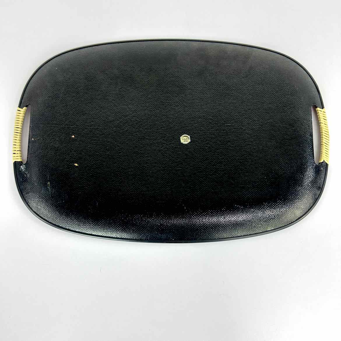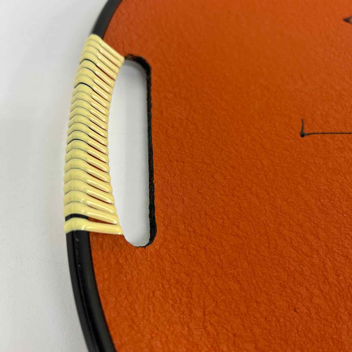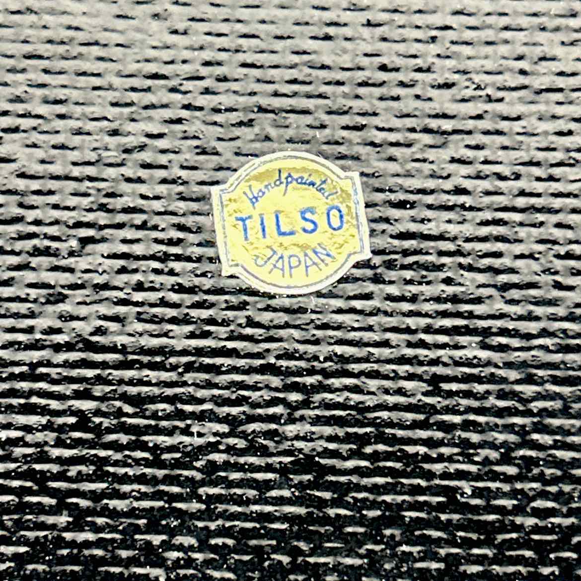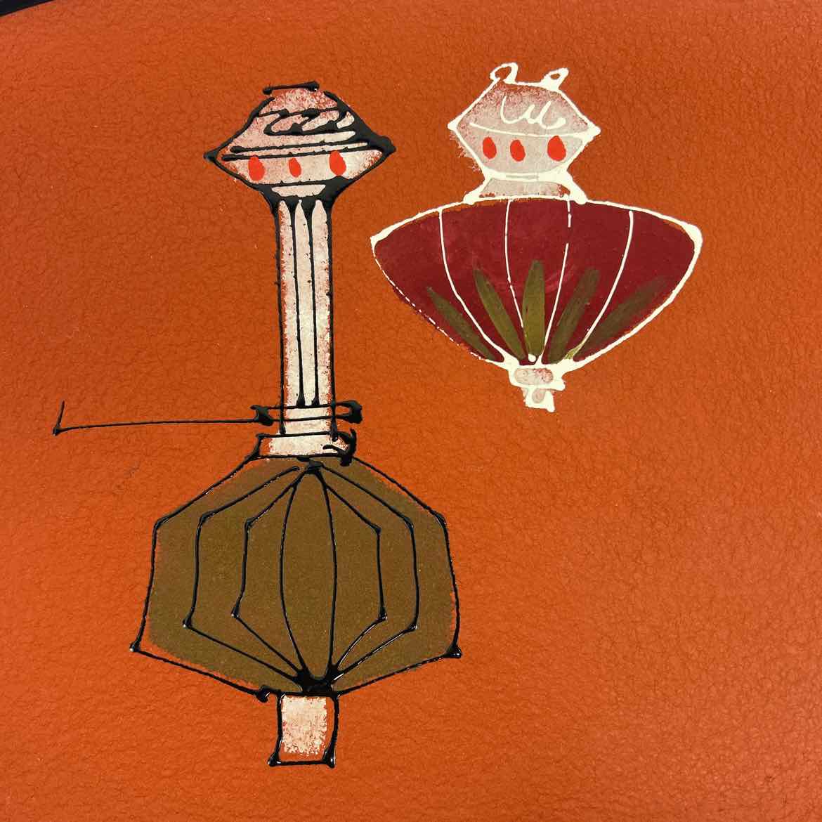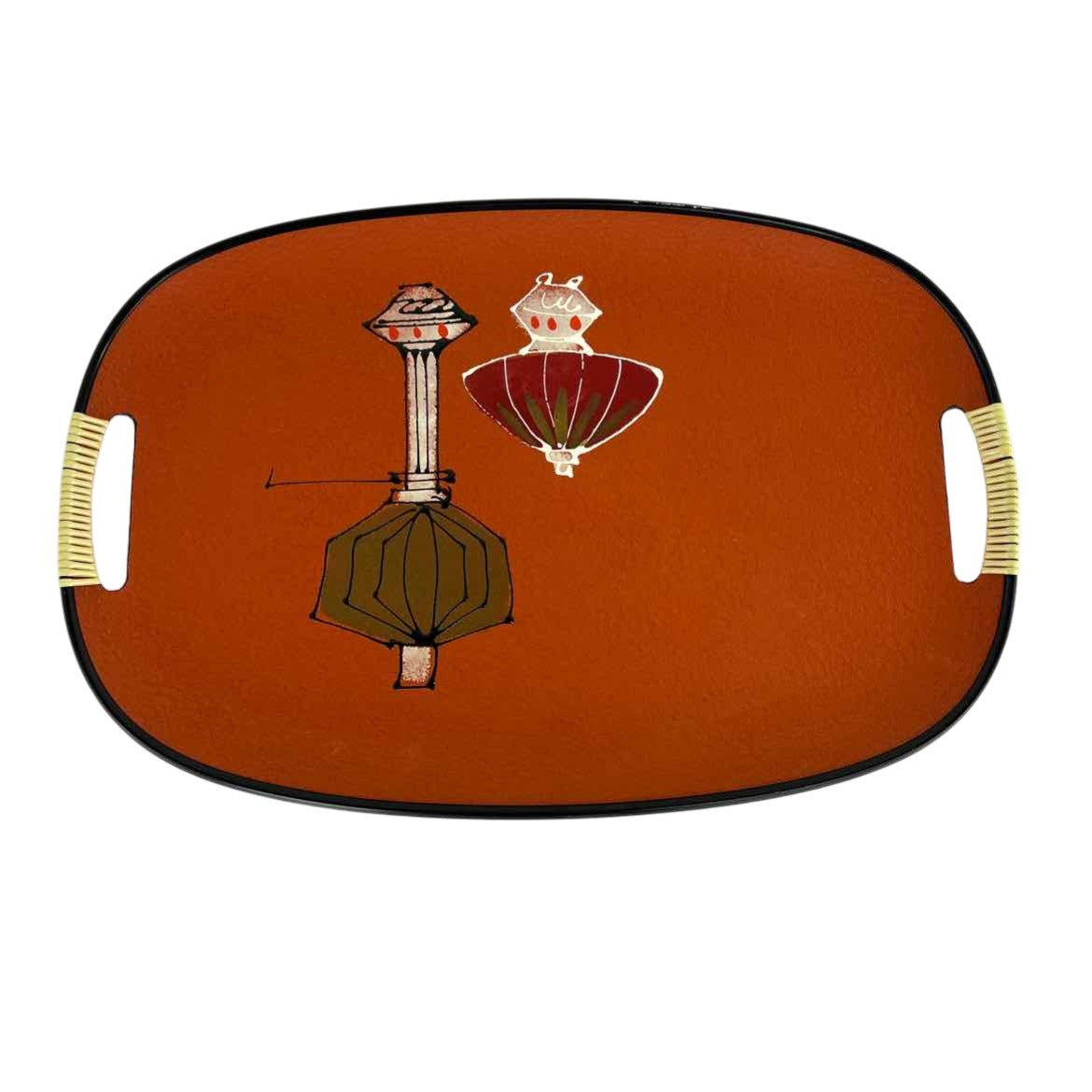 Mid-century modern serving tray with hand painted lamp or lantern designs on a textured orange background, with a black underside and ivory trim on the handles. The label on the back says Tilso Japan.