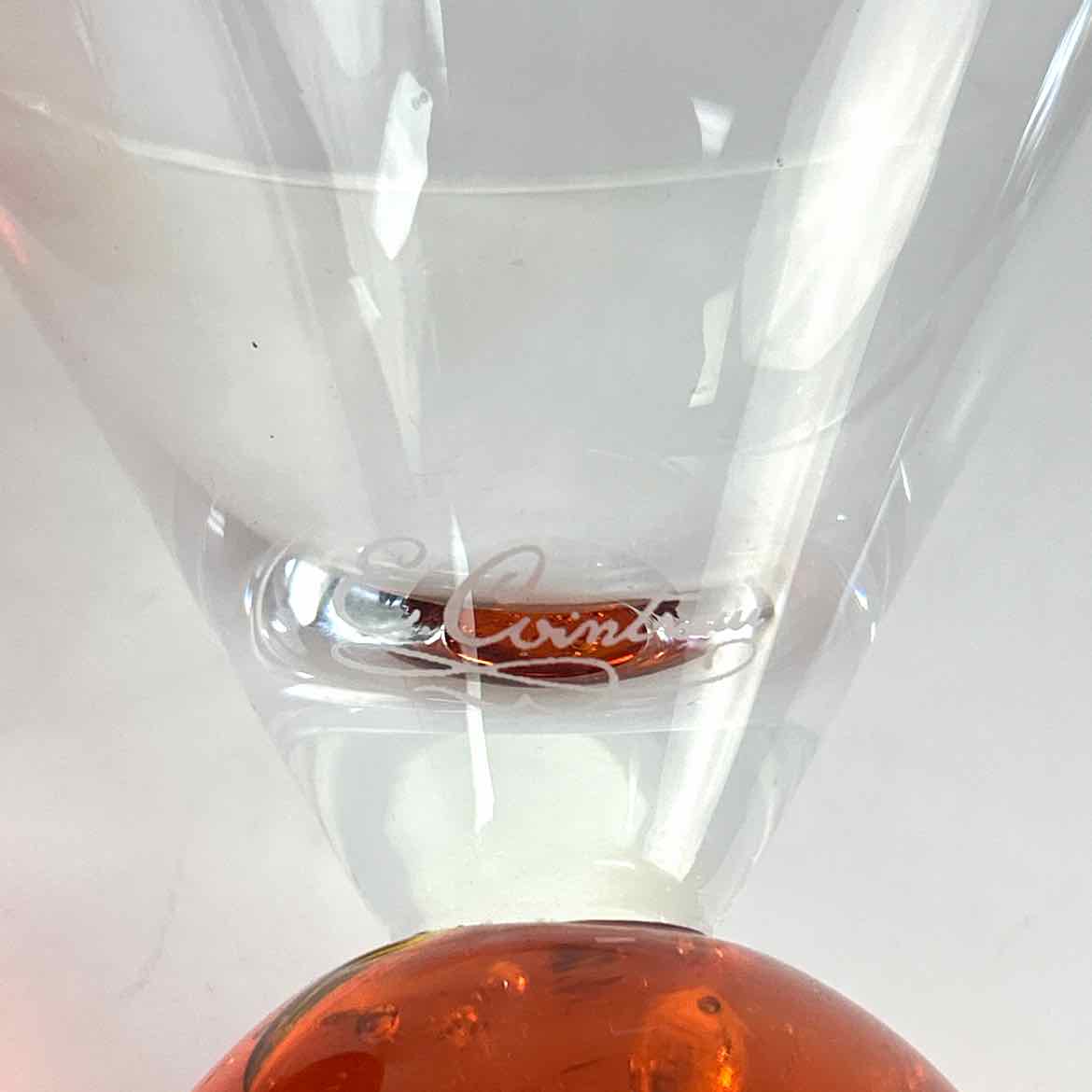 PAIR fabulous modern martini glasses with orange bubble glass ball bases and flared clear glass tops, signed E. Cointreau and in excellent vintage condition.