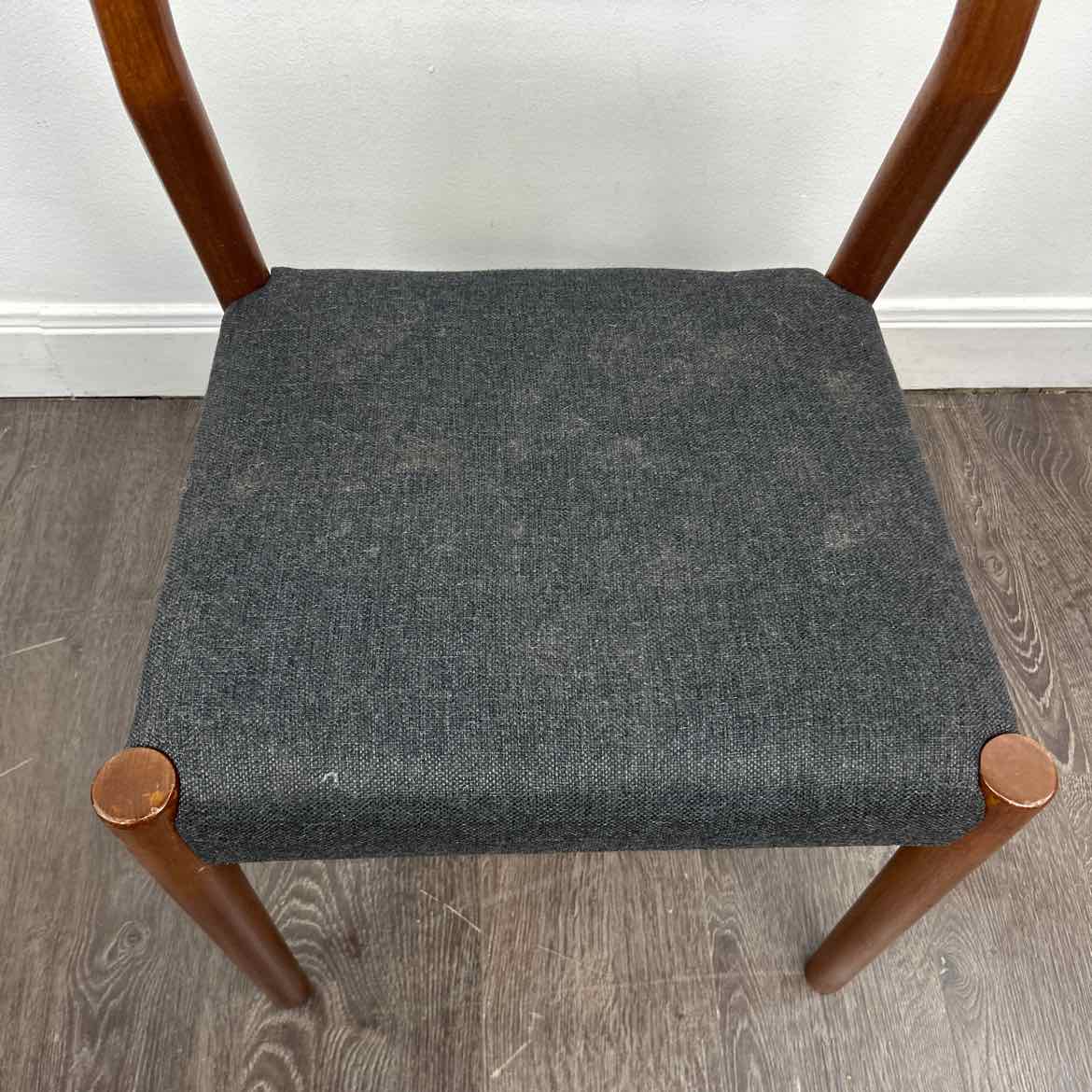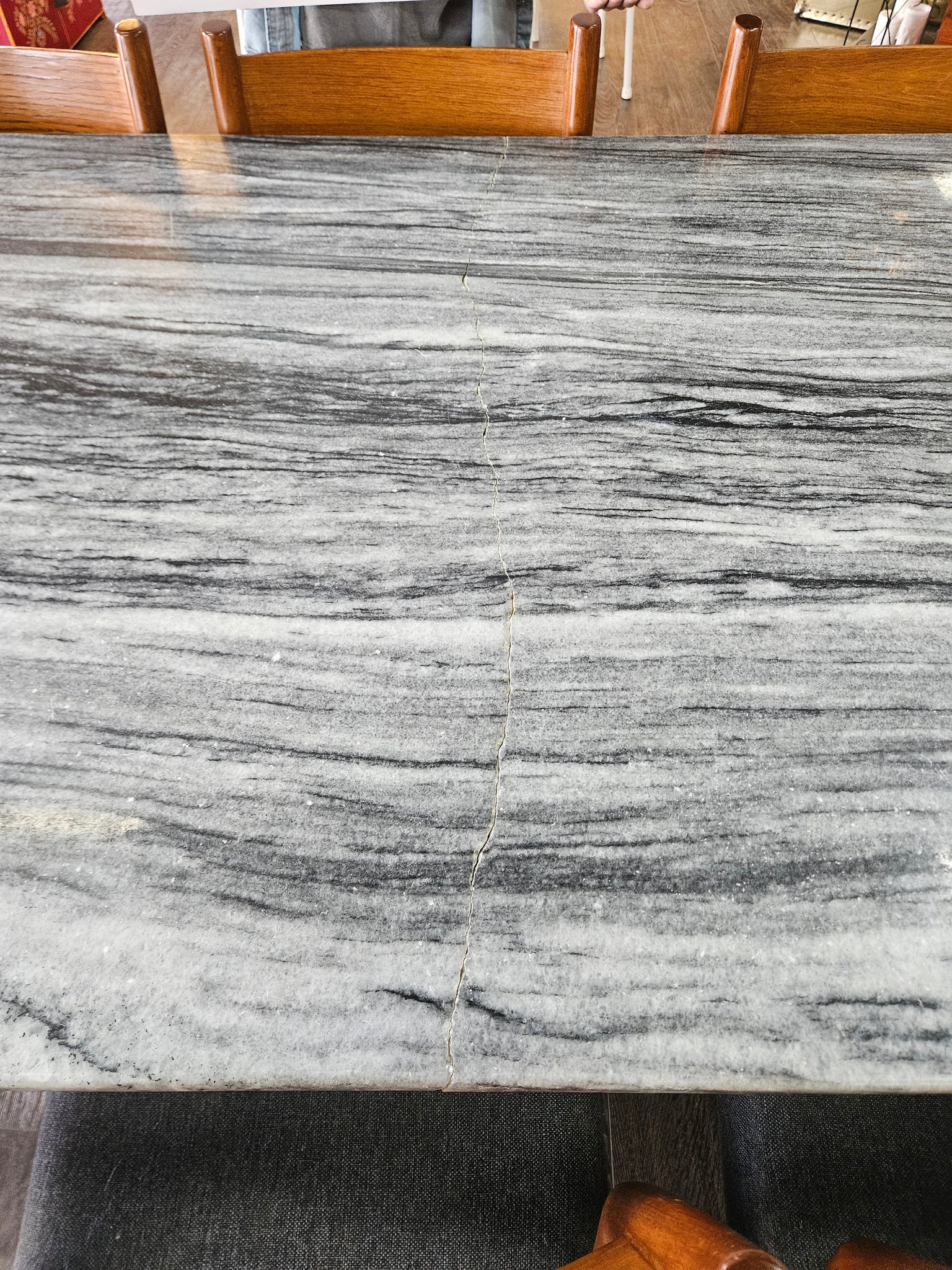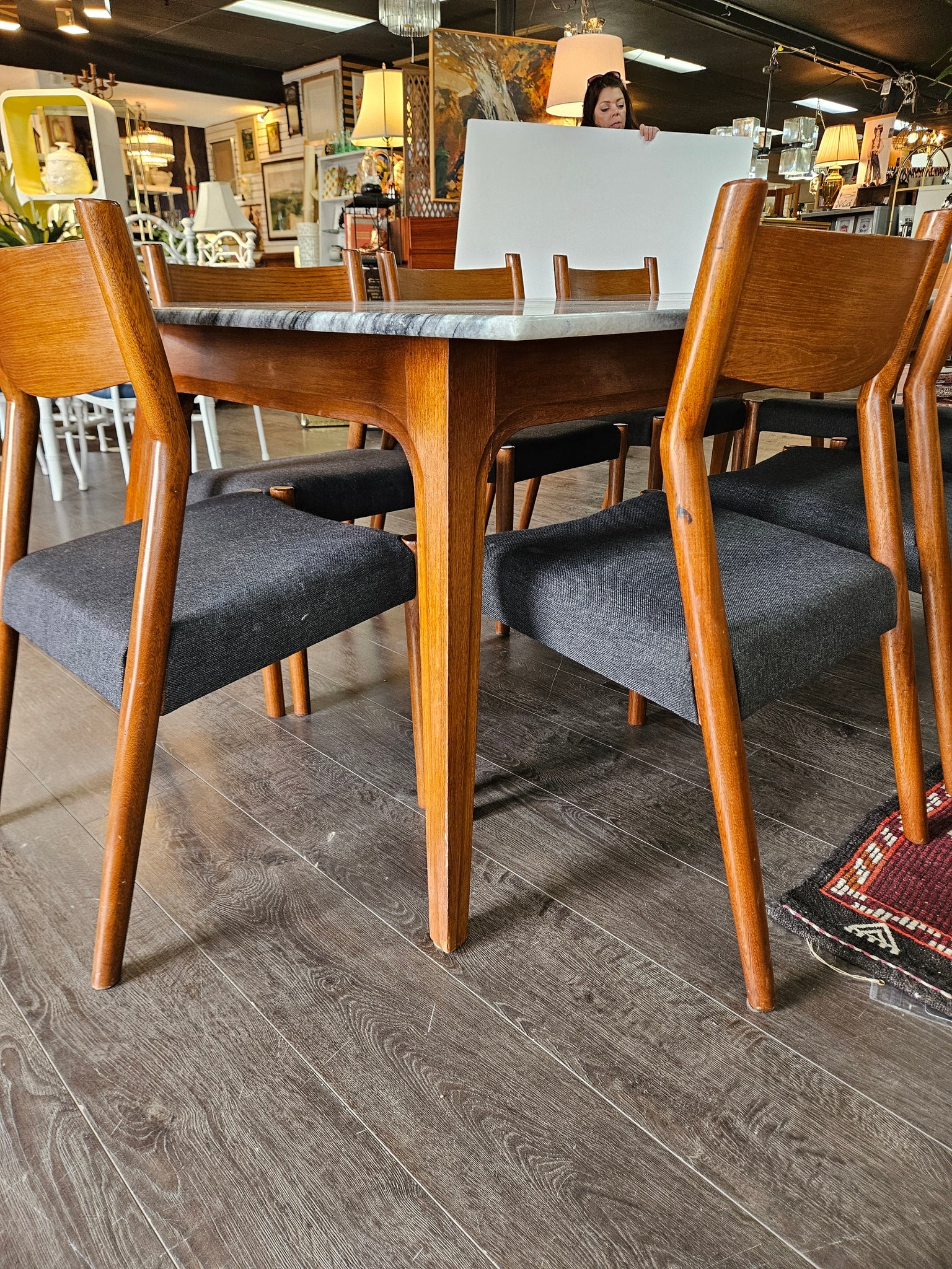 This mid-century modern style dining set was custom made in Colombia, and it features solid wood construction and a marble top. The top has a large crack, but it makes it easier to transport. The seats are not comfortable, but the 6 chairs are sturdy.