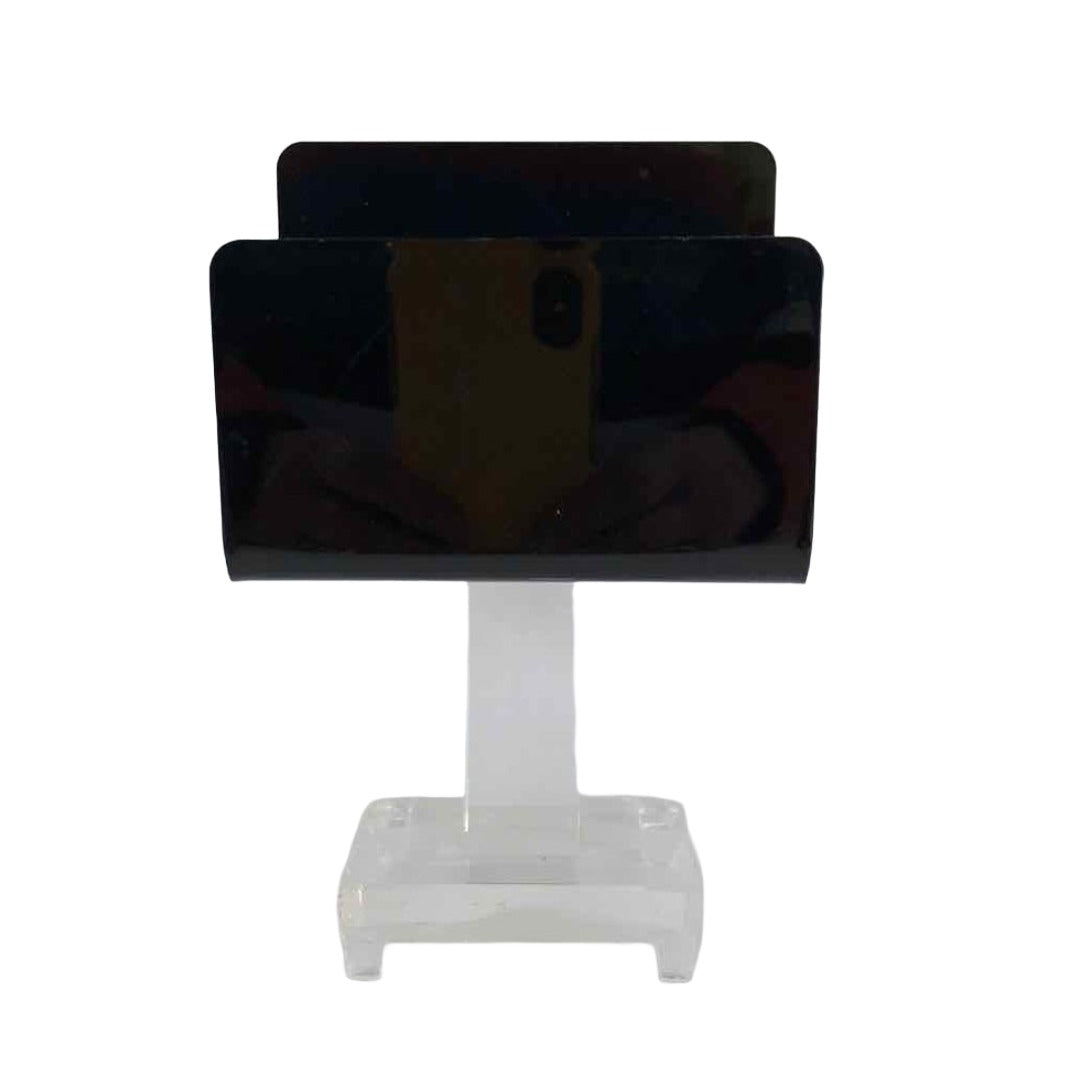 Modern lucite letter holder stand in black and clear acrylic, in the style of Karl Springer. Has a few scuffs but is in otherwise very good vintage condition. Also works as a napkin holder or to display flyers in a shop.