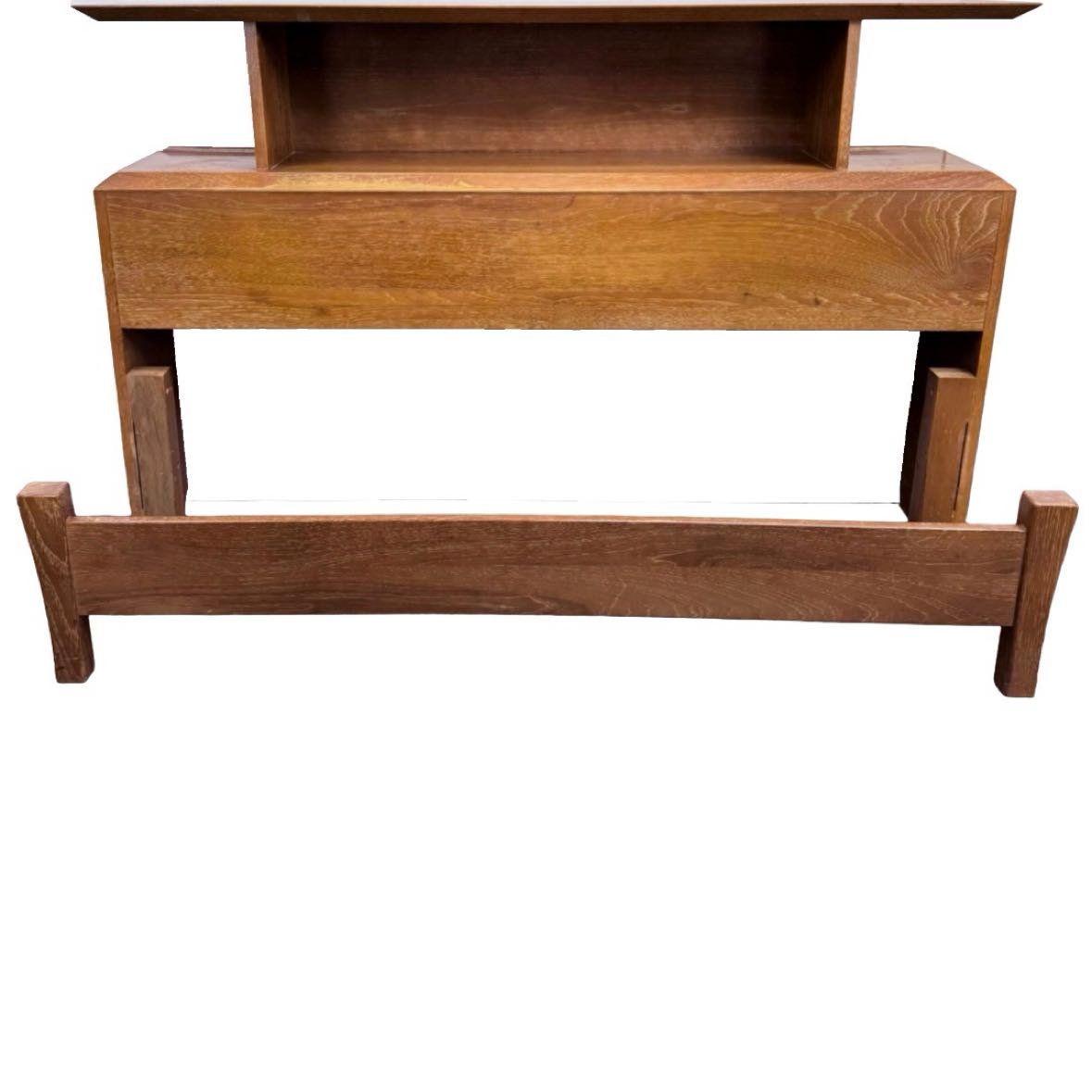 Solid oak mid-century full size bed made in Dallas, Texas by Olive Myers in very good vintage condition, including rails and slats. Headboard height: 37.5. There is a little finish wear as shown. More finish wear on the rails.