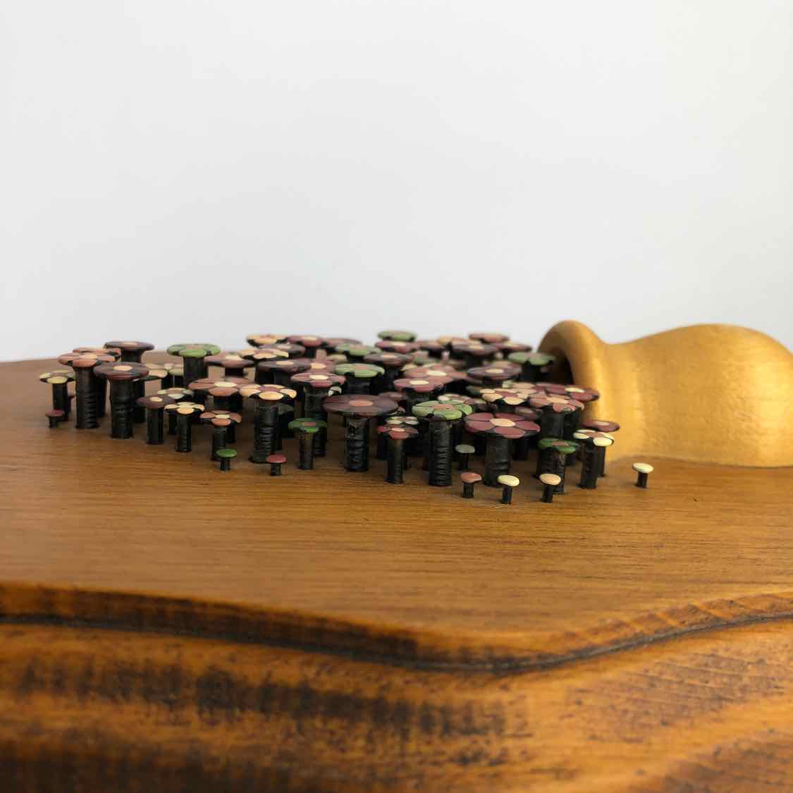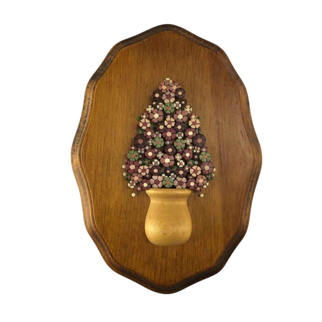 Small scale nailhear floral art plaque by artist Trish Murphy showing a tree in a pot on wood, in excellent vintage condition.