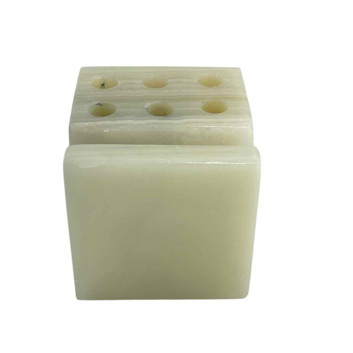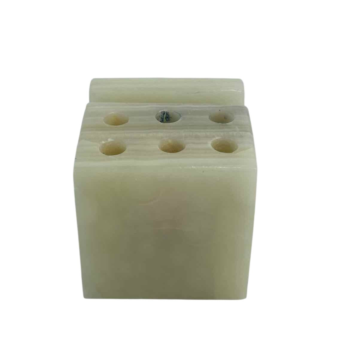 Vintage desk organizer carved from solid onyx stone with beautiful natural variation "stripes". It can hold up to 6 pens/pencils and has a handy slot to hold letters, business cards or a note pad. Has some ink stains inside pen holes.