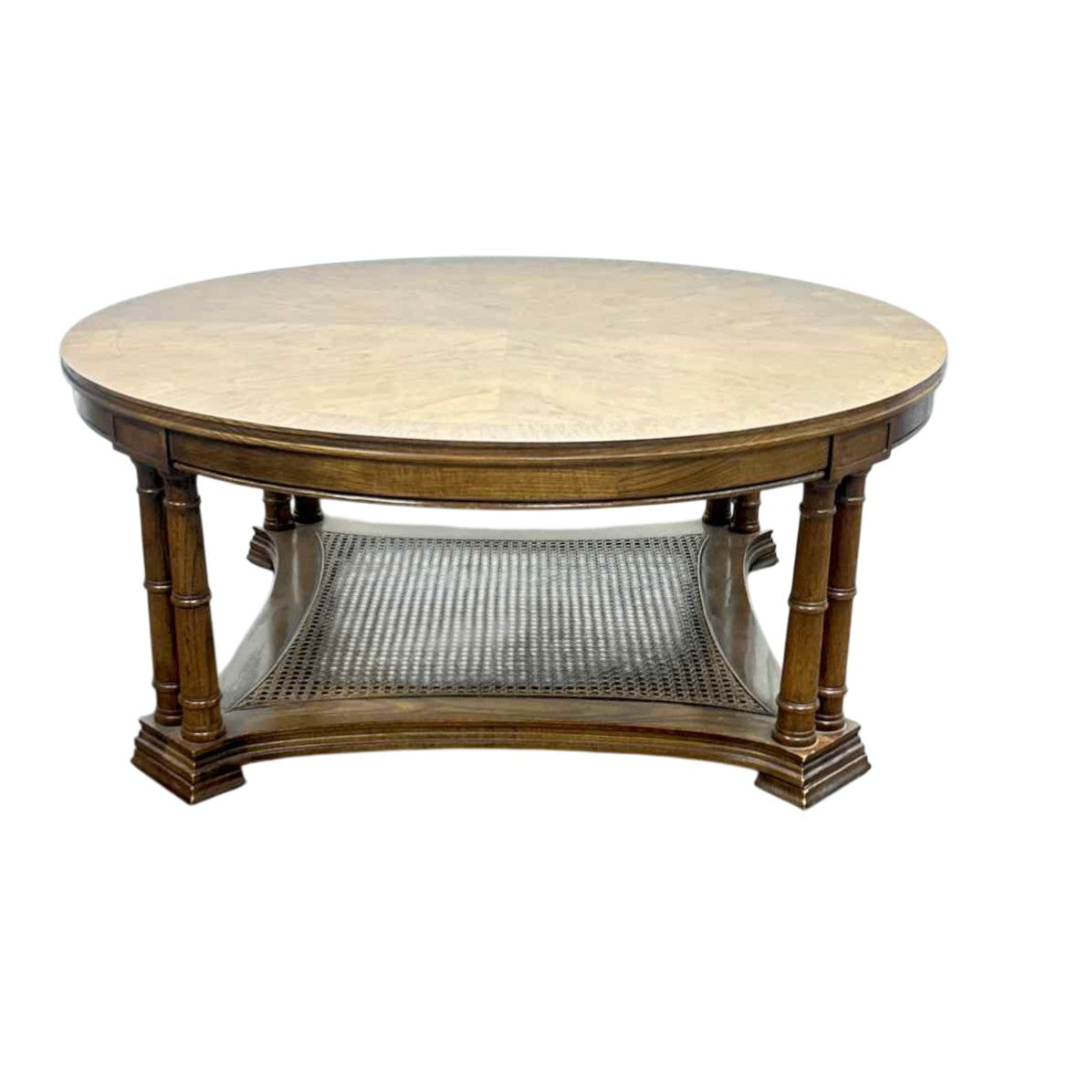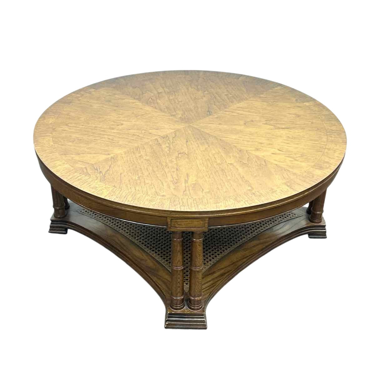 Round wooden coffee table with a cane shelf underneath, in very good vintage condition with light vintage wear from age. The columns lend it a classic, traditional look and the size is perfect for a smaller space.